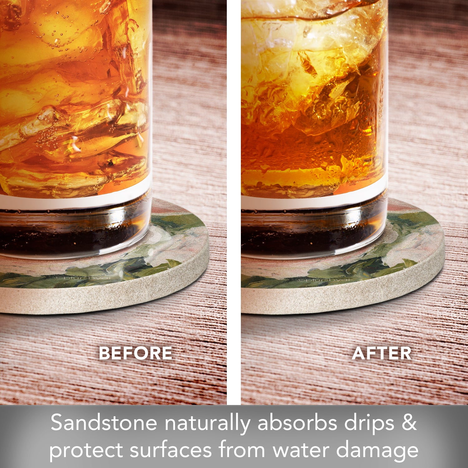 ABSORBENT-Sandstone is naturally absorbent. These Sandstone Coasters will continually absorb condensation from beverages. Sandstone is also heat tolerant, making it a great choice for protecting tables and countertops from hot beverages.