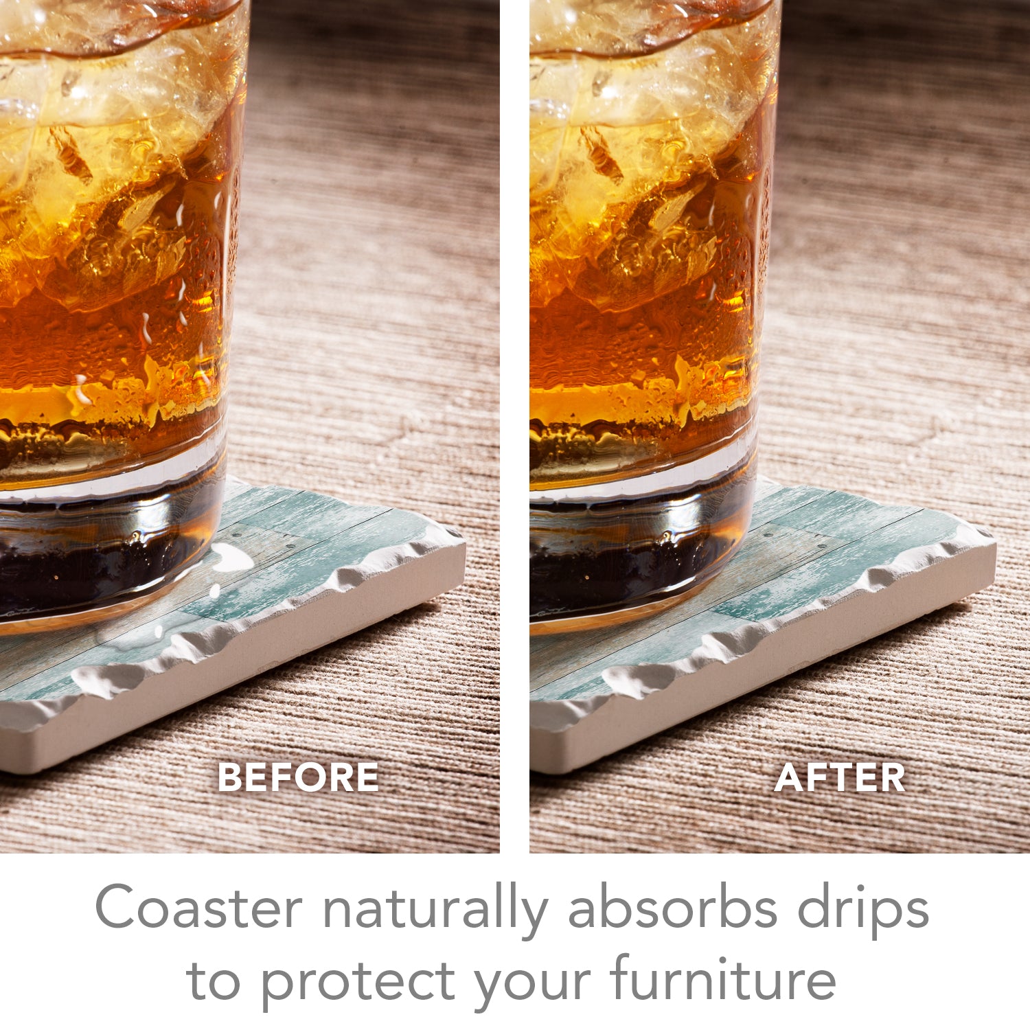 ABSORBENT STONE-Coasters arrive as a set of 4 Coasters. Each Coaster is constructed of absorbent stone that continuously absorbs drips and condensation from your beverages while preventing stains and rings on your furniture.