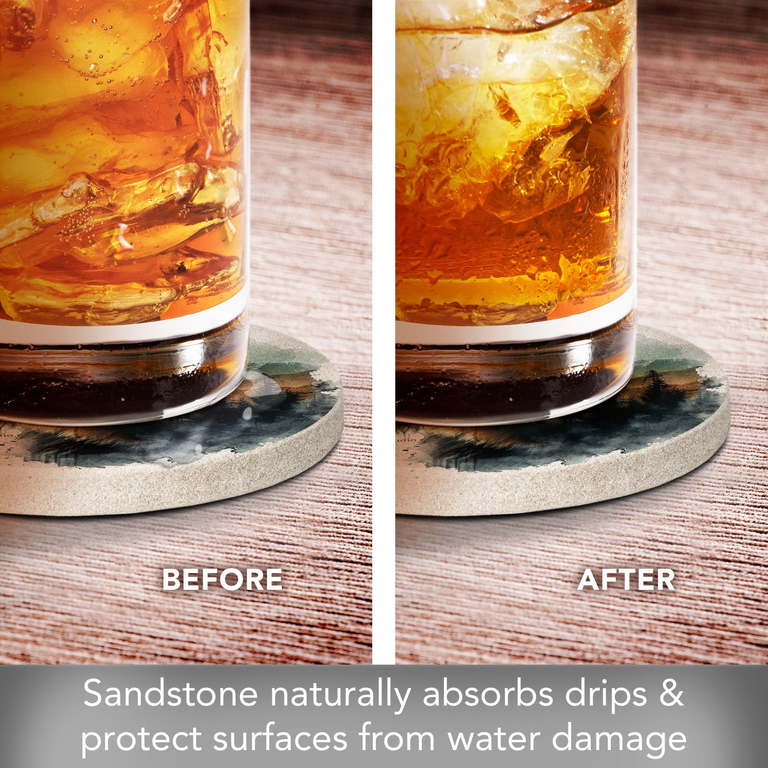 ABSORBENT-Sandstone is naturally absorbent. These Sandstone Coasters will continually absorb condensation from beverages. Sandstone is also heat tolerant, making it a great choice for protecting tables and countertops from hot beverages.