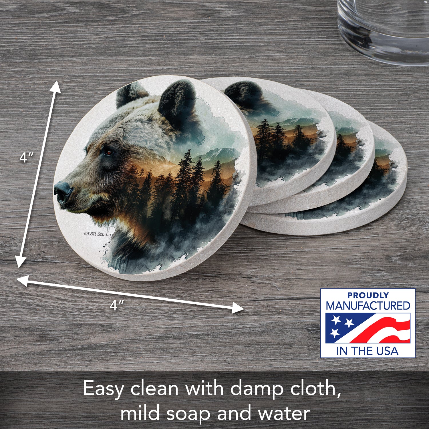 MEASUREMENTS-Each coaster measures 4” square. Sandstone coasters are easy to clean with a damp cloth or sponge. Beautiful artistic design allows the Coasters to remain displayed even when not in use.