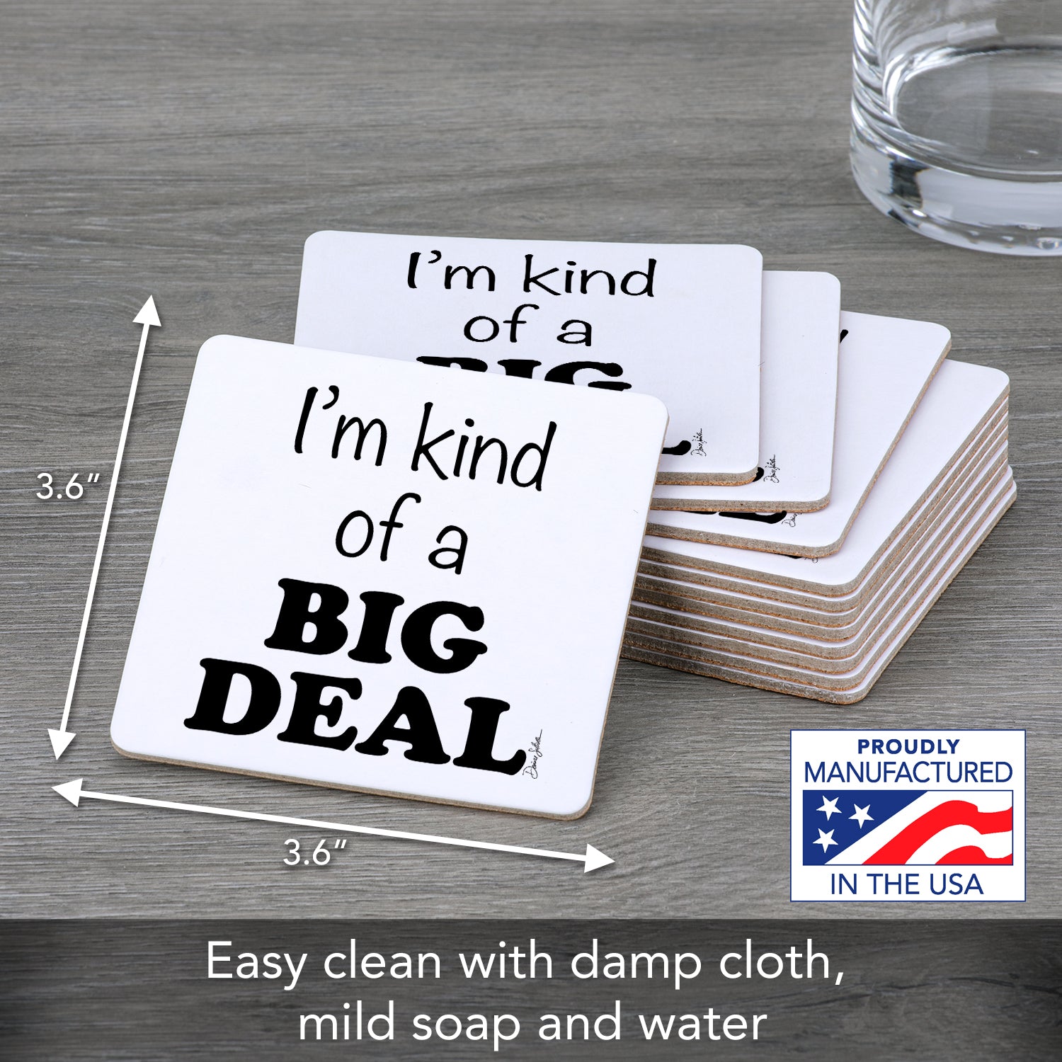 MEASUREMENTS- Coaster measures 3.6" x 3.6" x 0.15" square. Coasters are eco-friendly and reusable until soiled.