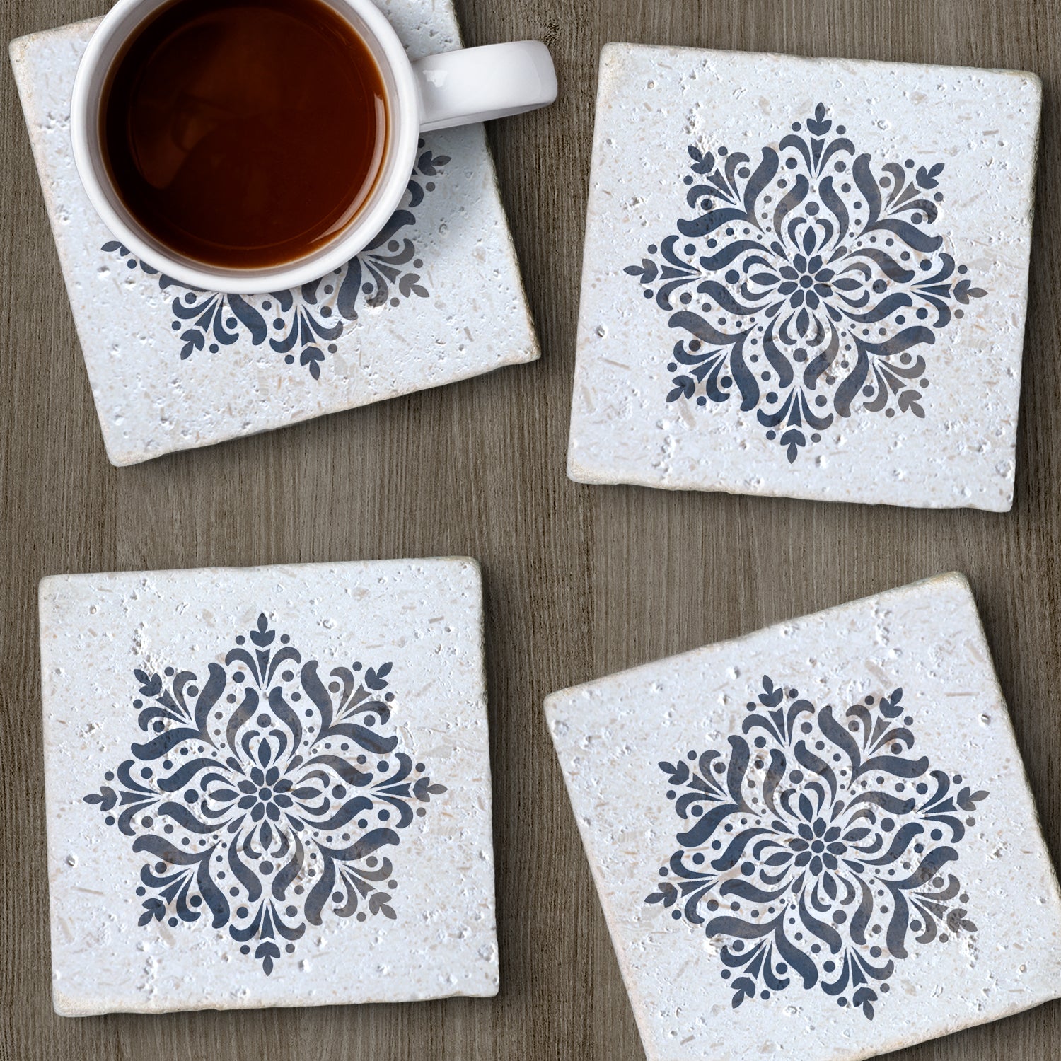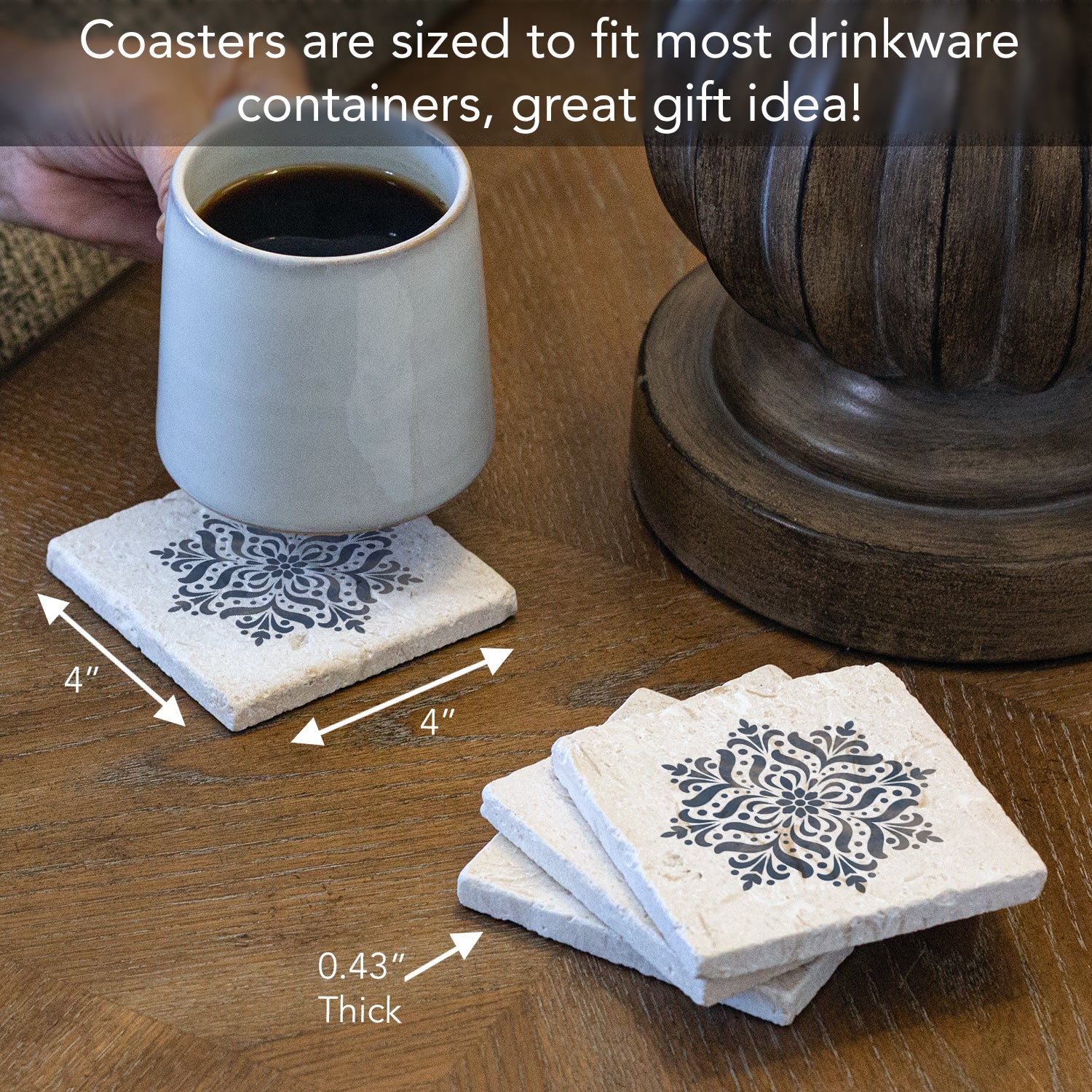 MEASUREMENTS-Each coaster measures 4" x 4" x .43". Sized to fit most drinkware containers, suitable for both hot and cold beverages.
