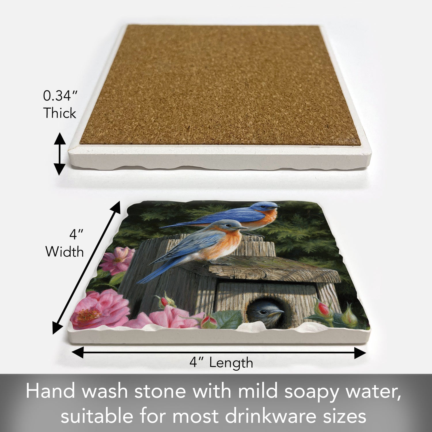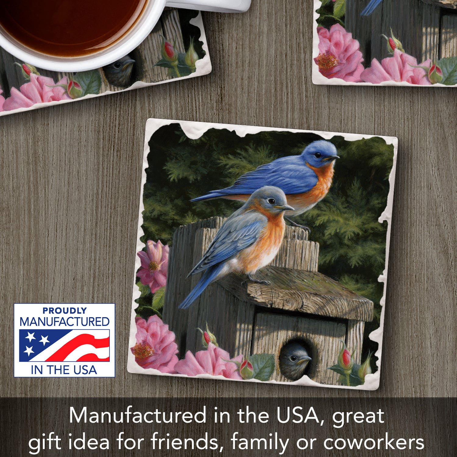 Thirstystone Bluebird Family Single Tumbled Tile Stone Coaster with Protective Cork Backing Manufactured in The USA 4" Square, Artistic, Easily Wipes Clean