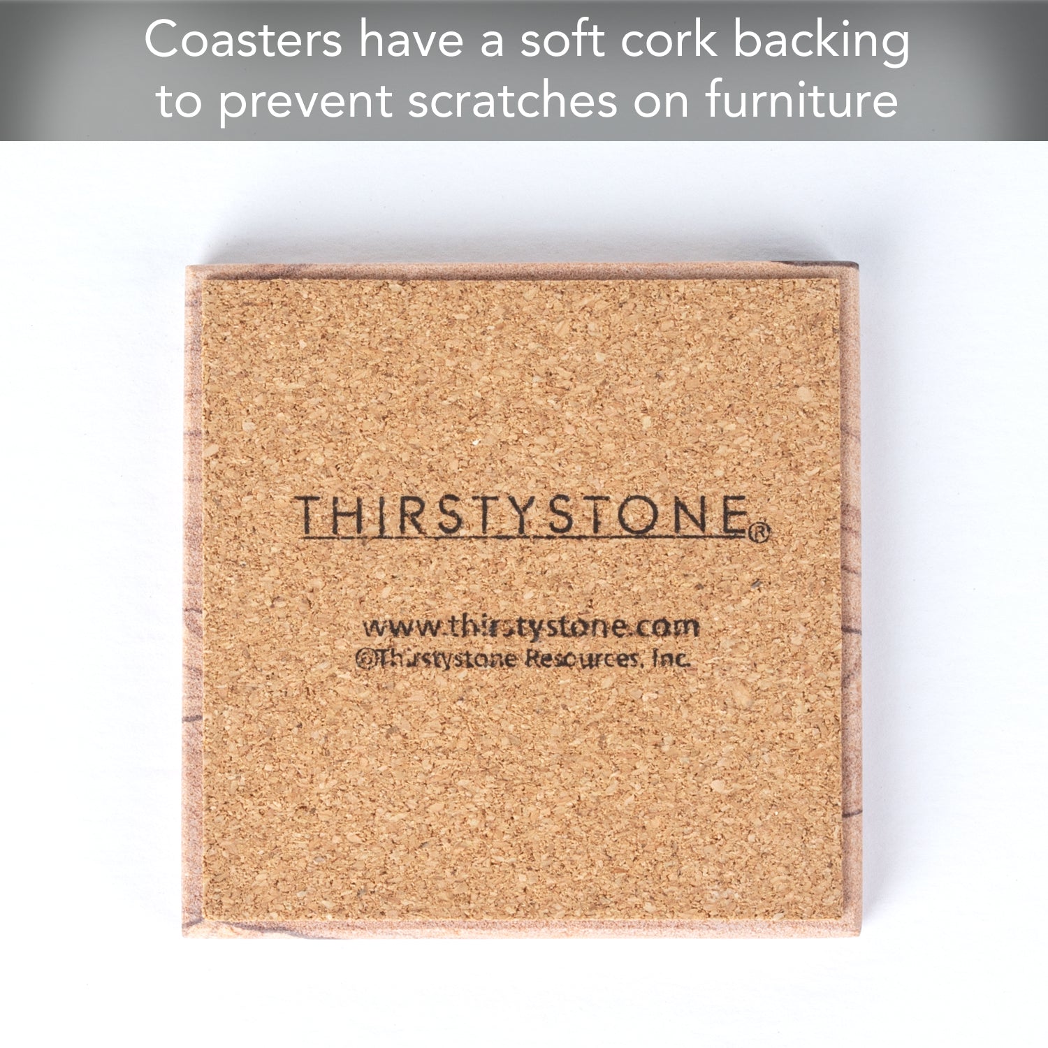 CORK BACKING-Each Coasters has an attached cork backing that protects your surfaces from scratches and stains.
