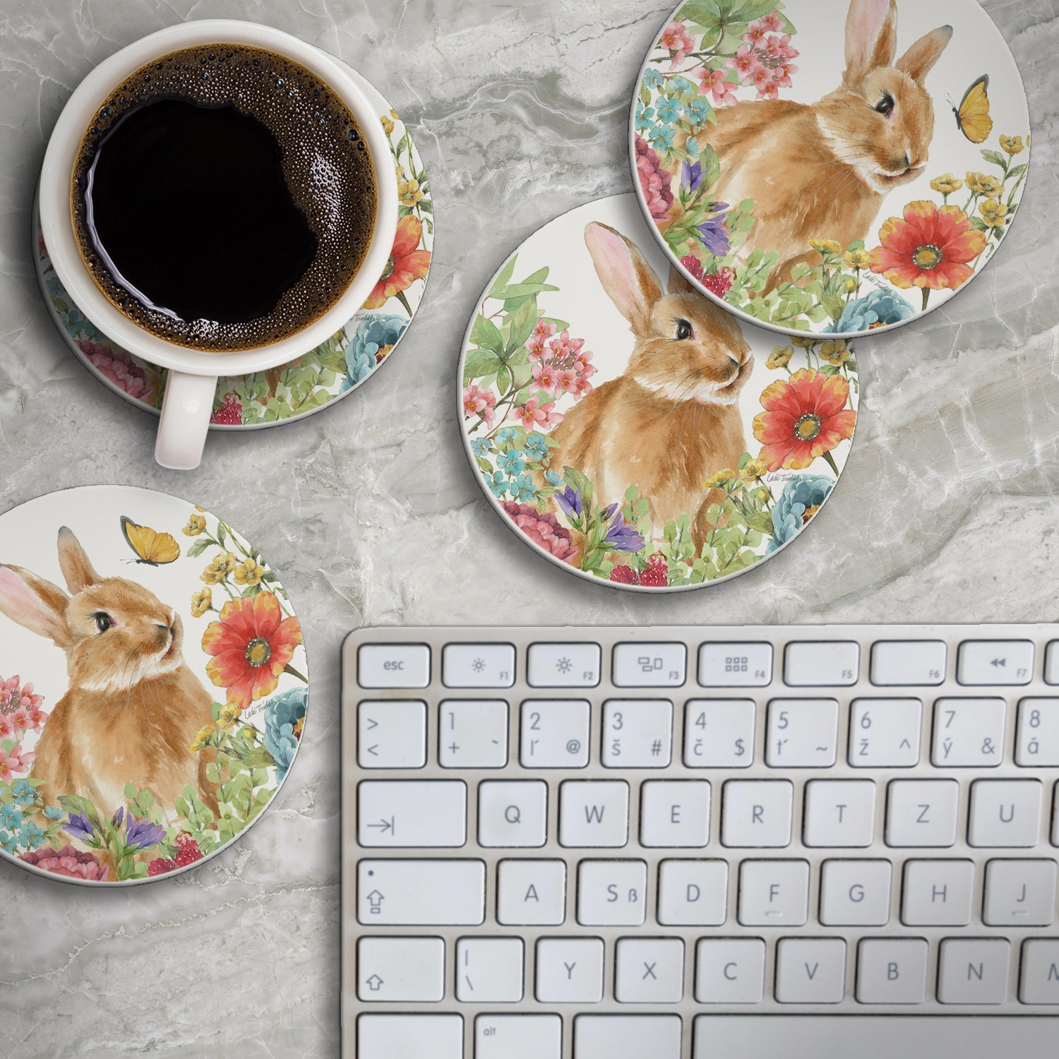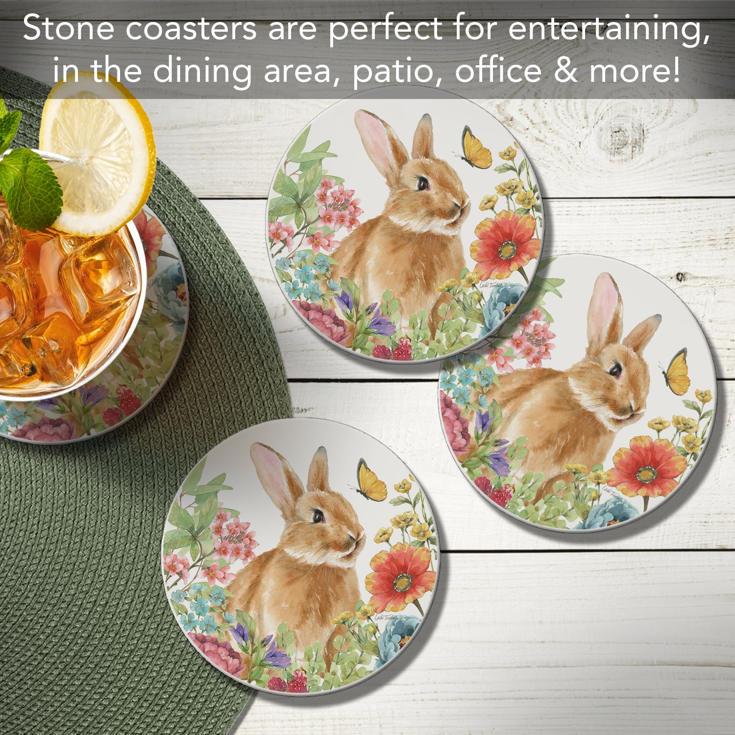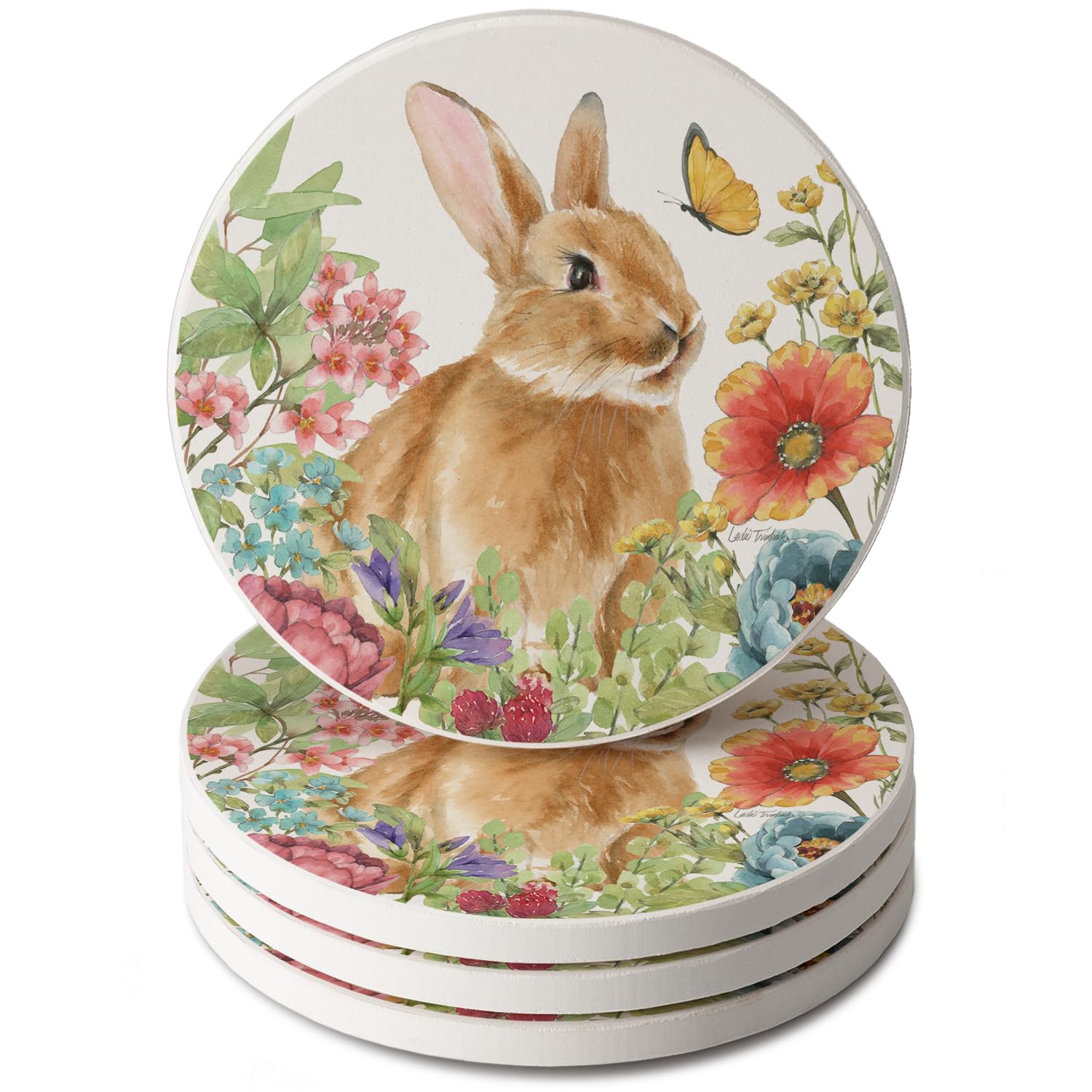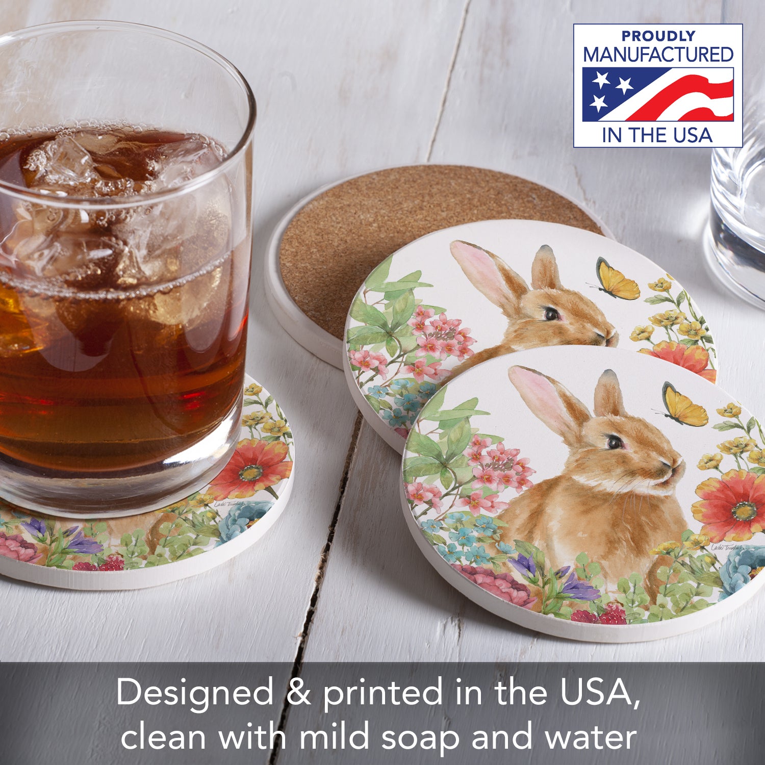Thirstystone Bunny Garden 4 Pack Round Absorbent Stone Coasters 4" Diameter Manufactured in the USA