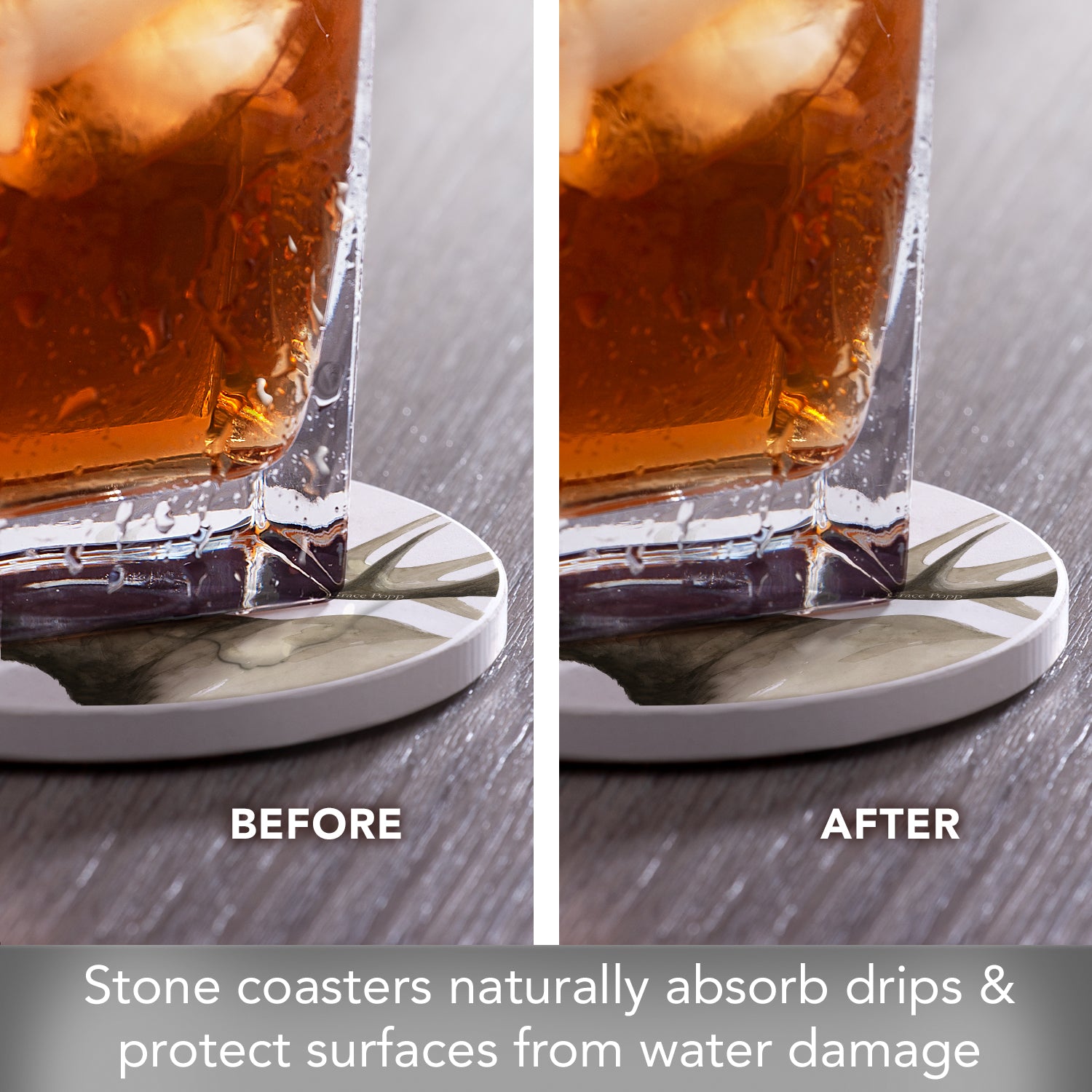 ABSORBENT STONE-Set of 4 natural absorbent stone coasters. Constructed of absorbent stone that absorbs drips and condensation from beverages continuously. Absorption prevents rings and stains on your furniture. Smooth, finished edge completes these round Coasters.