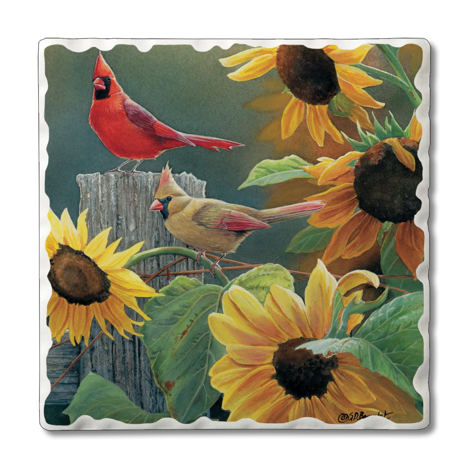 Thirstystone Cardinal & Sunflowers Single Tumbled Tile Stone Coaster with Protective Cork Backing Manufactured in The USA 4" Square, Artistic, Easily Wipes Clean