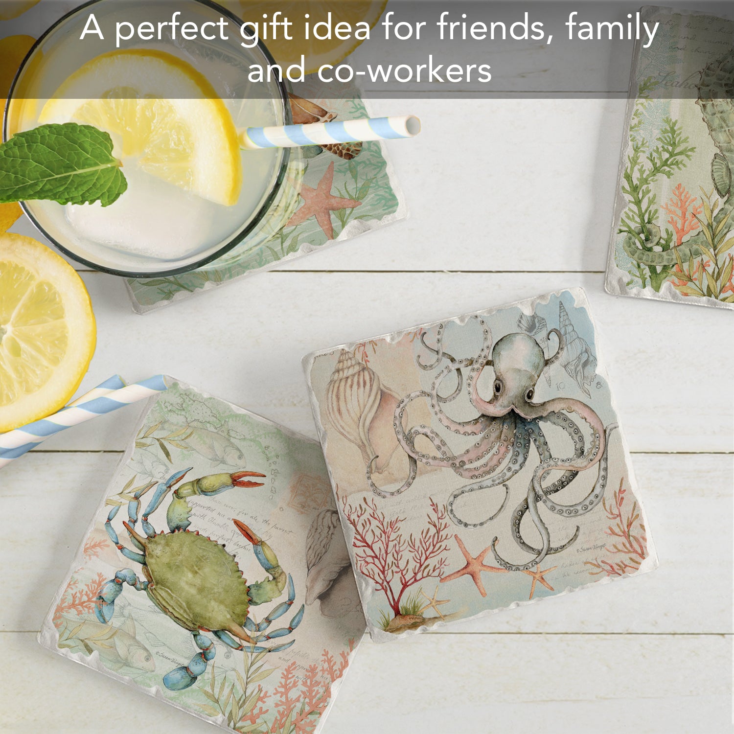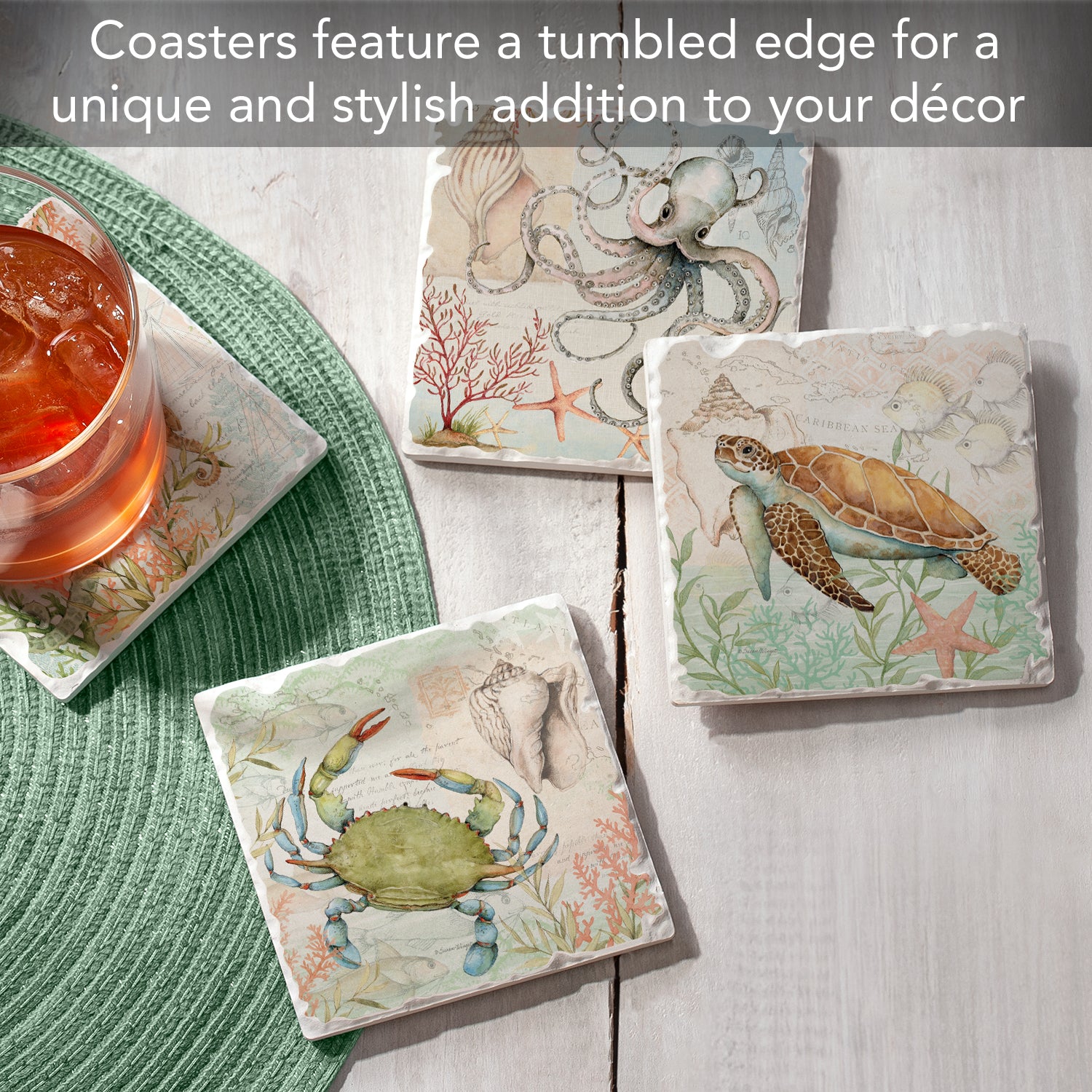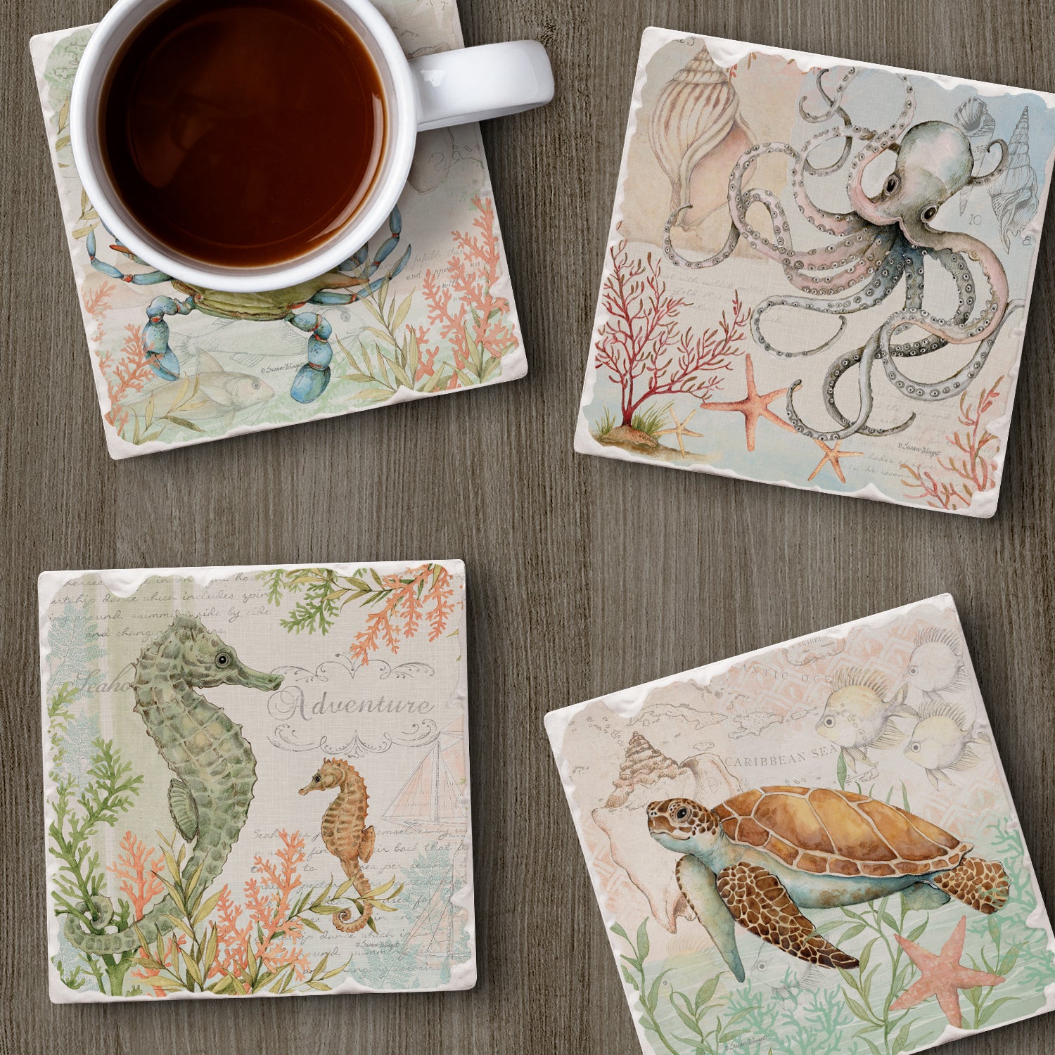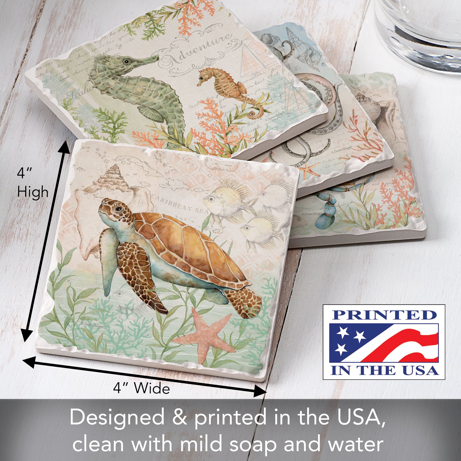 Thirstystone Caribbean Sea Life 4 Pack Assorted Tumbled Tile Stone Coasters 4" Square