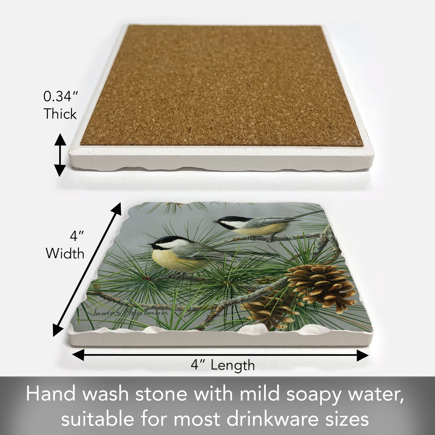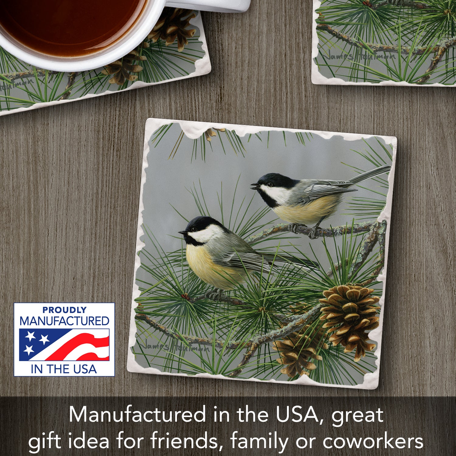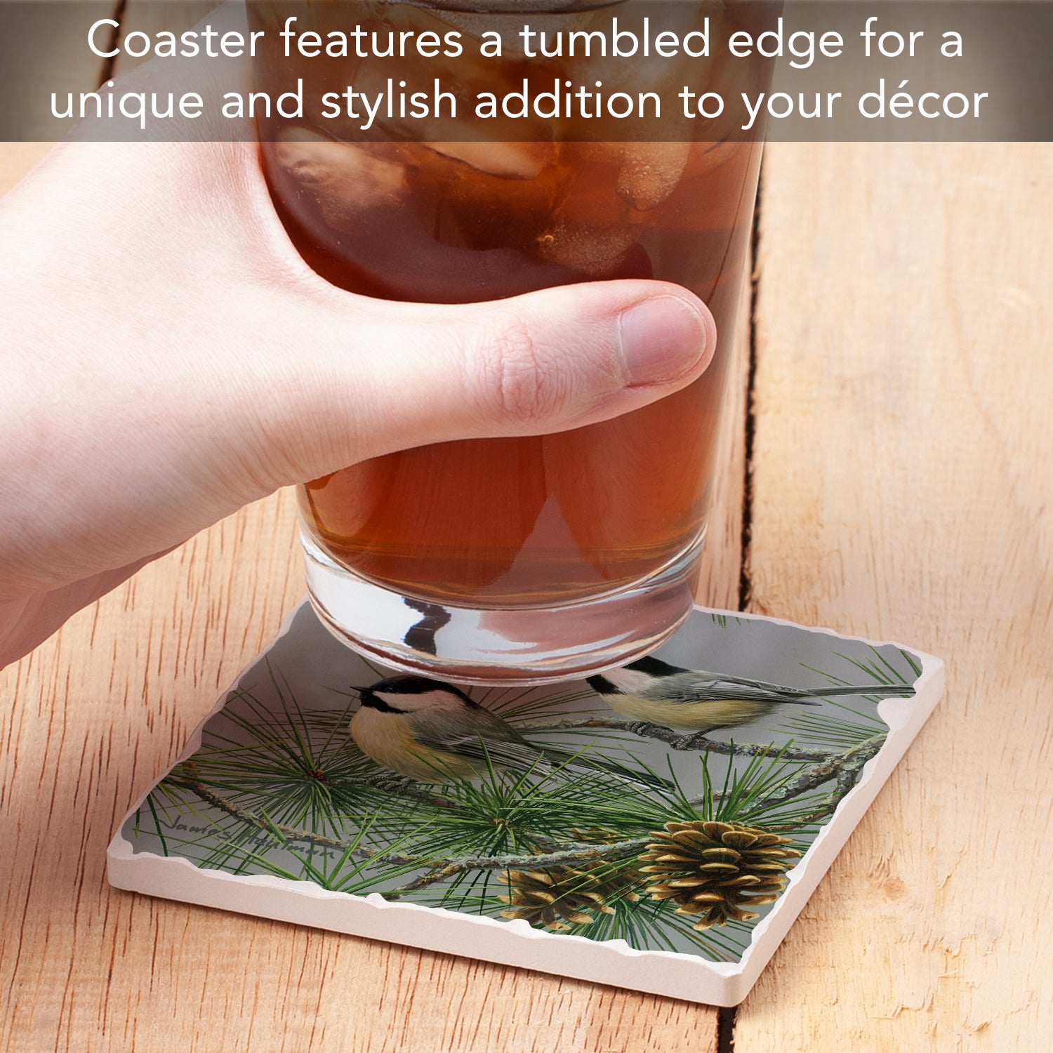 Thirstystone Chickadee Pine Tree Single Tumbled Tile Stone Coaster with Protective Cork Backing Manufactured in The USA 4" Square, Artistic, Easily Wipes Clean