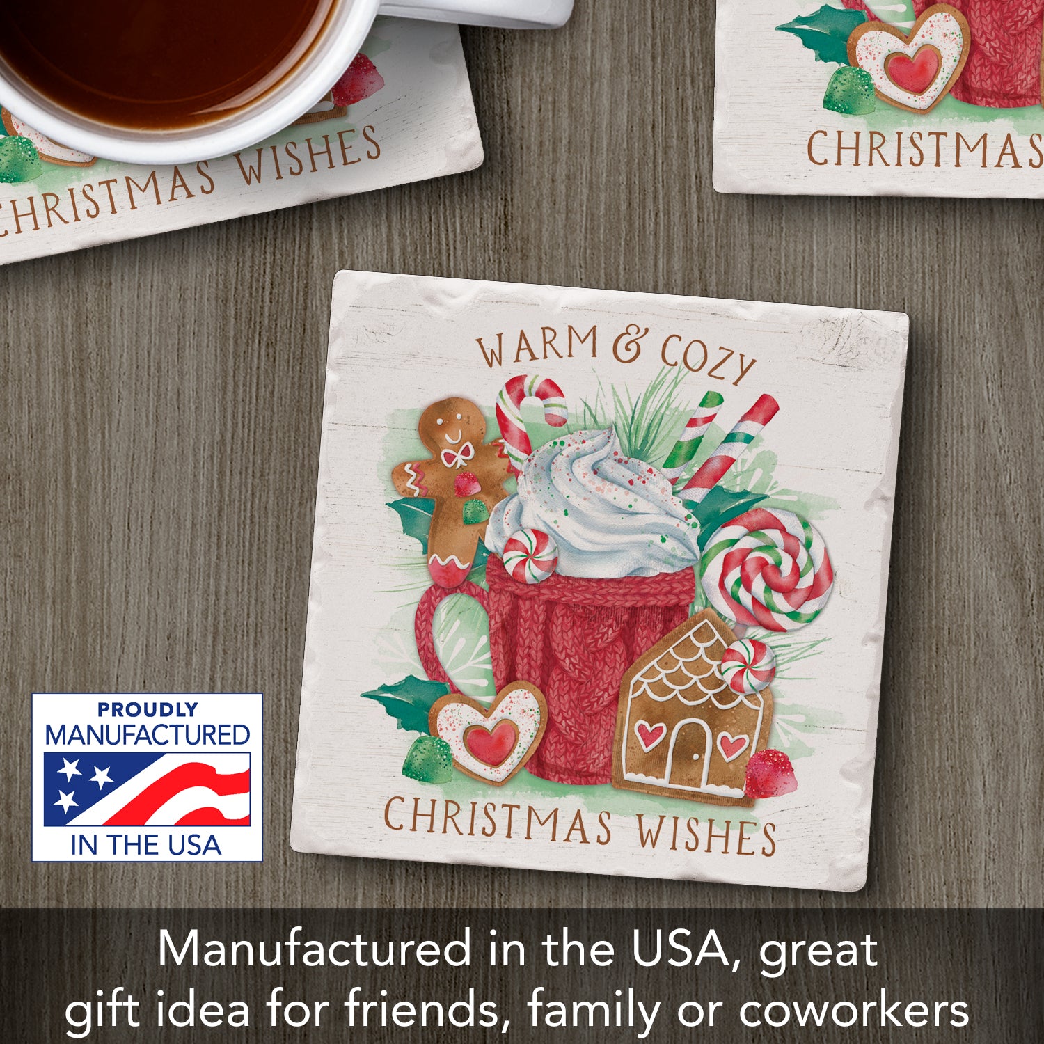 Thirstystone Christmas Wishes Single Tumbled Tile Stone Coaster with Protective Cork Backing Manufactured in The USA 4" Square, Artistic, Easily Wipes Clean