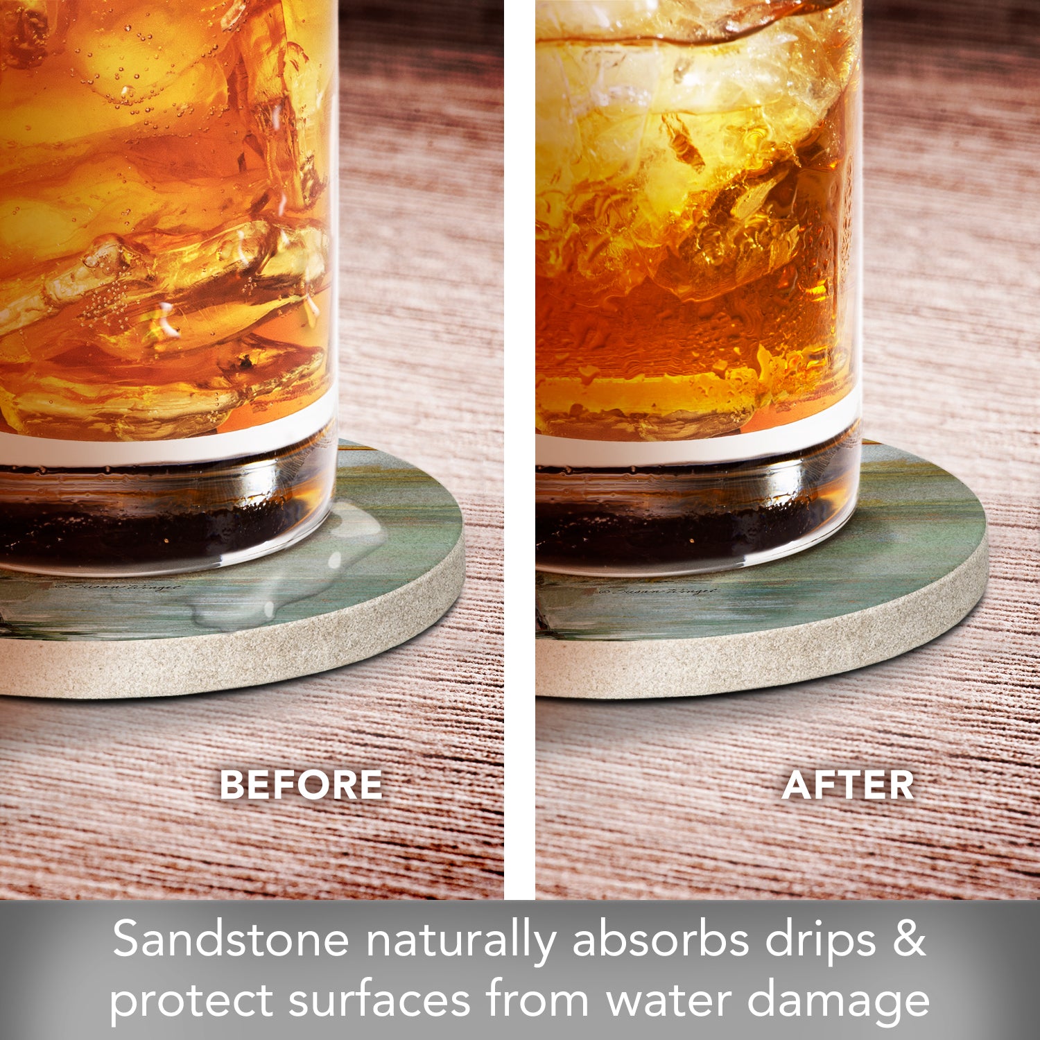 MEASUREMENTS-Each coaster measures 4” round. Sandstone coasters are easy to clean with a damp cloth or sponge. Beautiful artistic design allows the Coasters to remain displayed even when not in use.