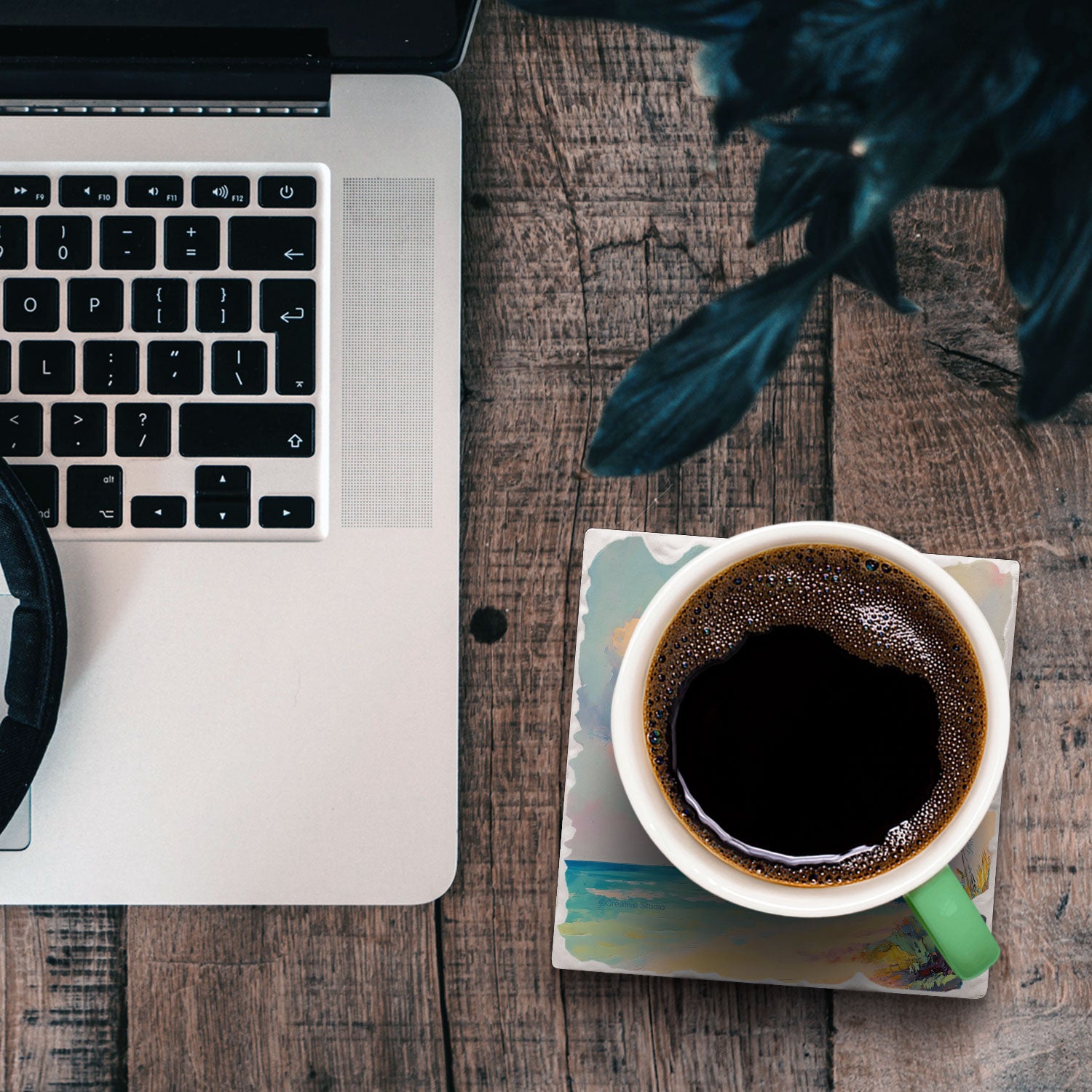 FUNCTIONAL ART-Beautiful artistic design allows the Coaster to remain displayed even when not in use. Each Coaster measures 4” x 4” x .25”. Sized to fit larger Mugs & Glasses.