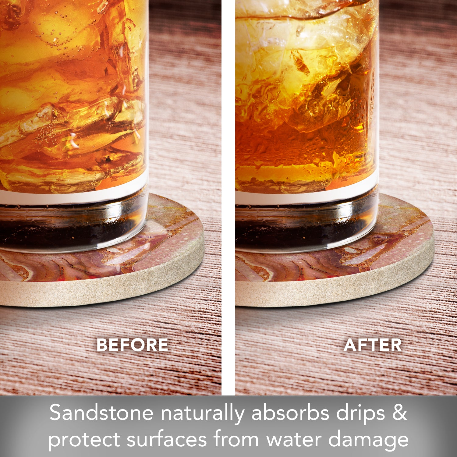 ABSORBENT-Sandstone is naturally absorbent. These Sandstone Coasters will continually absorb condensation from beverages. Sandstone is also heat tolerant, making it a great choice for protecting tables and countertops from hot beverages.