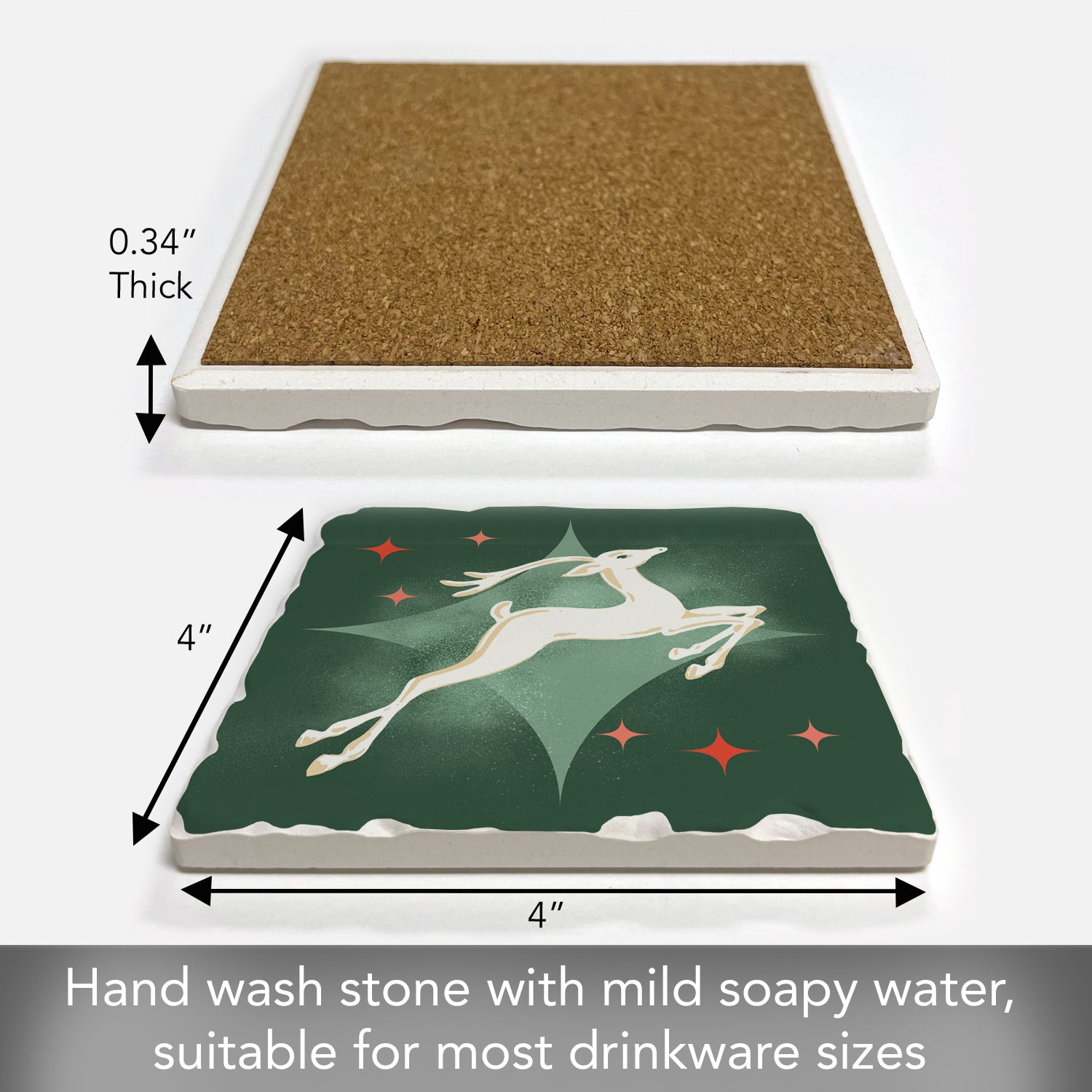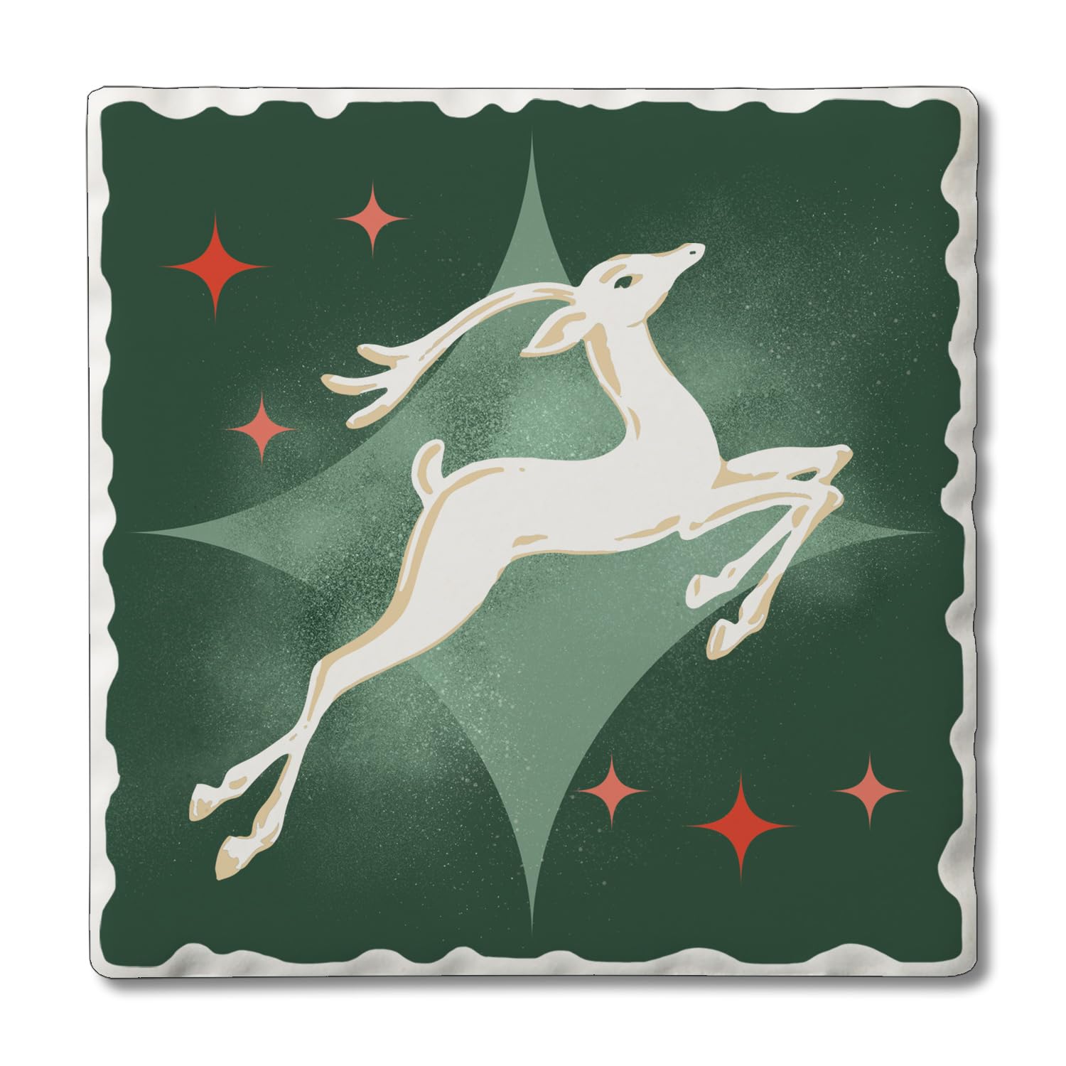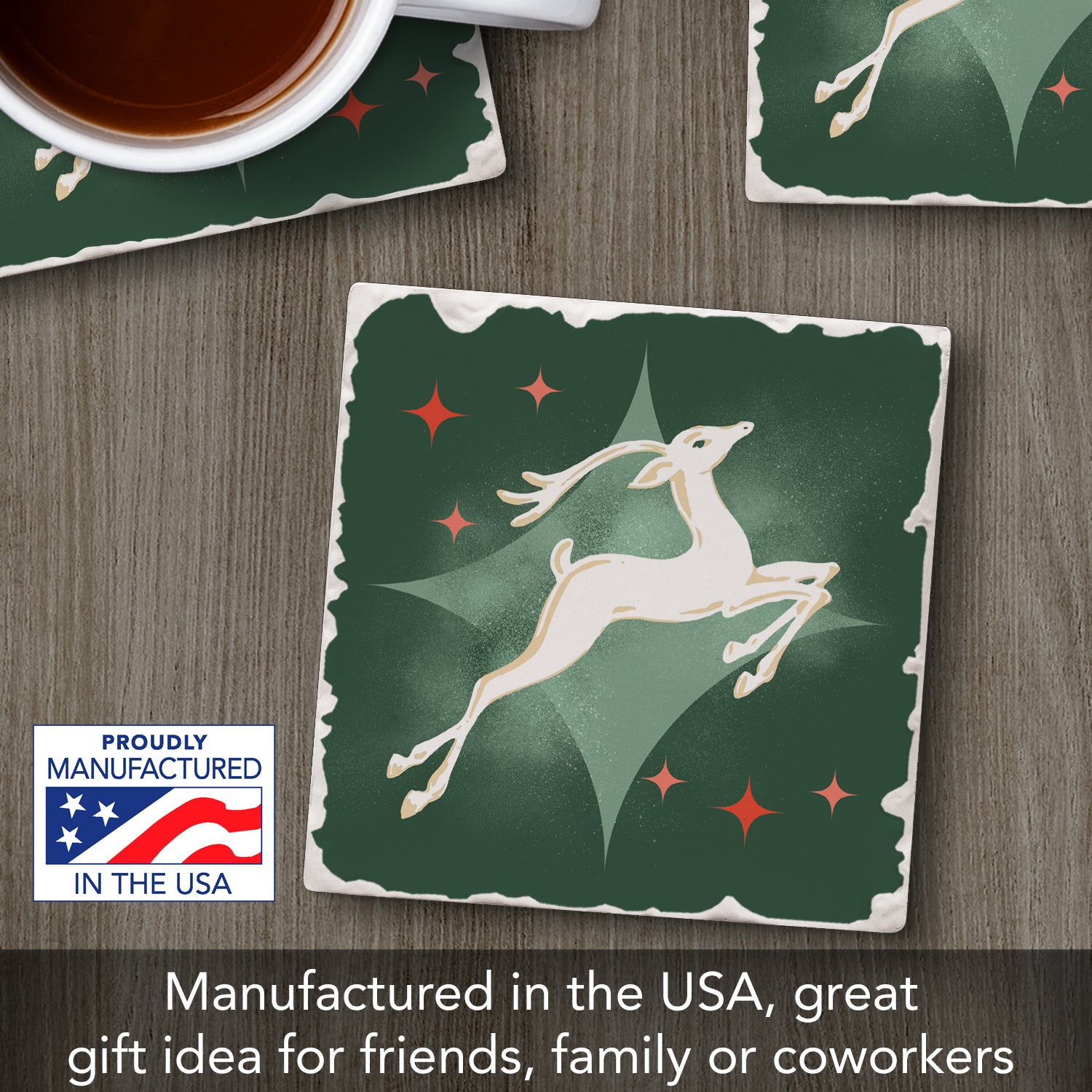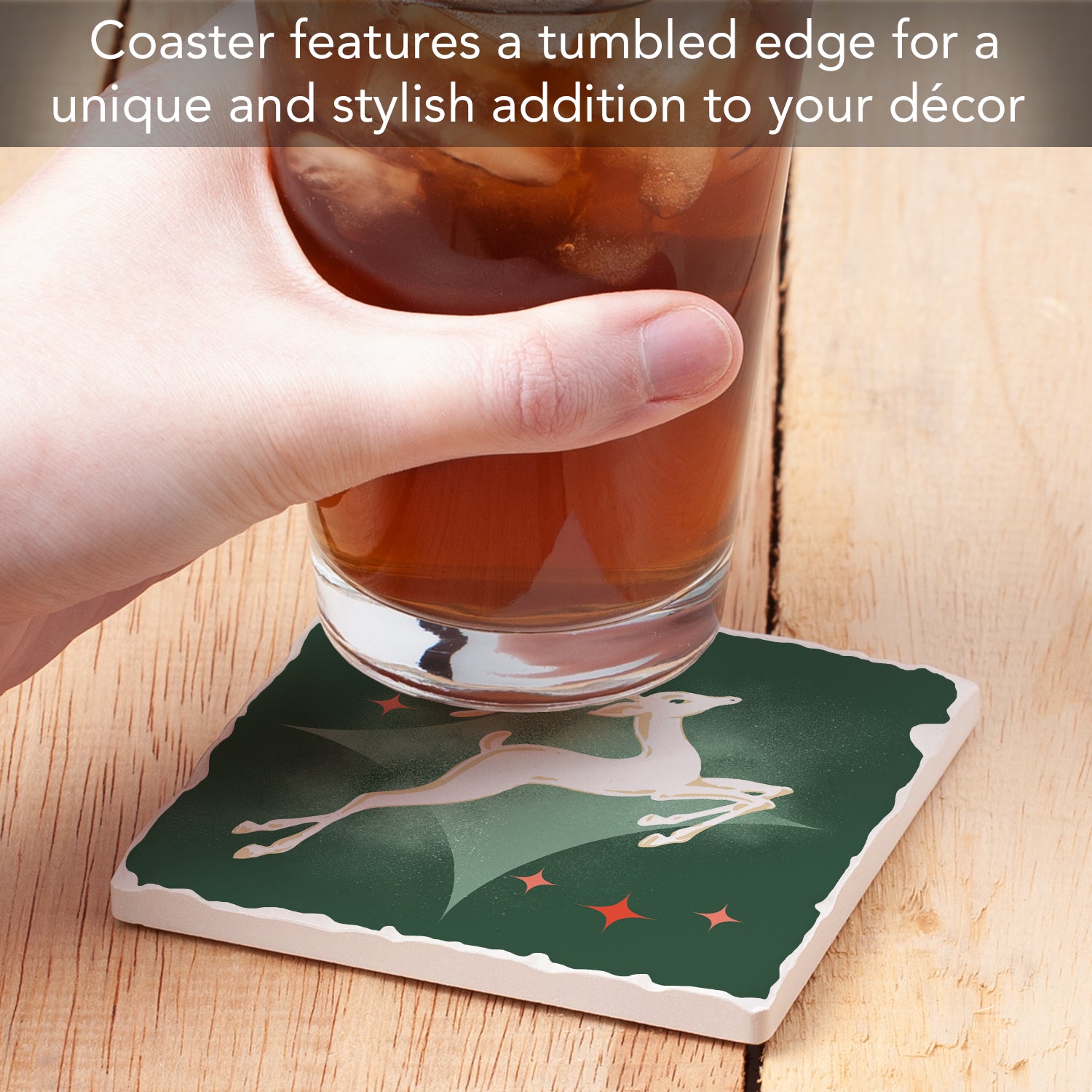 Thirstystone Dashing Reindeer Single Absorbent Stone Coaster with Protective Cork Backing Manufactured in The USA 4" Square, Artistic, Easily Wipes Clean