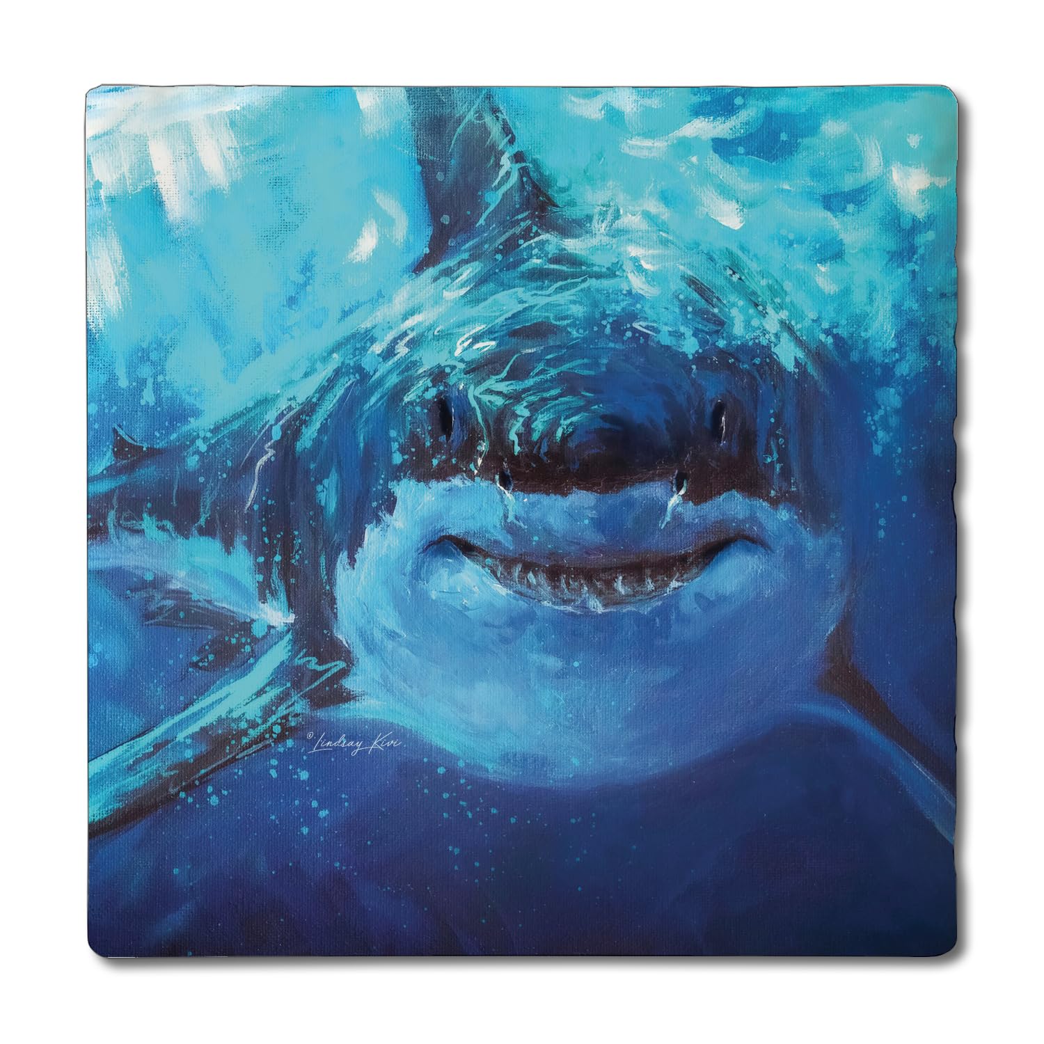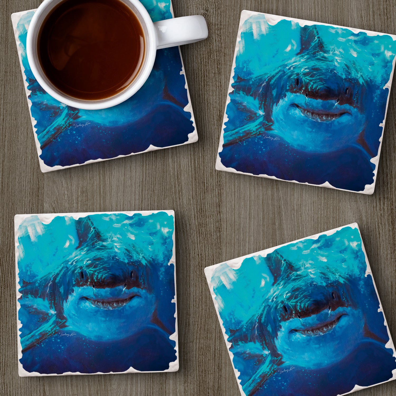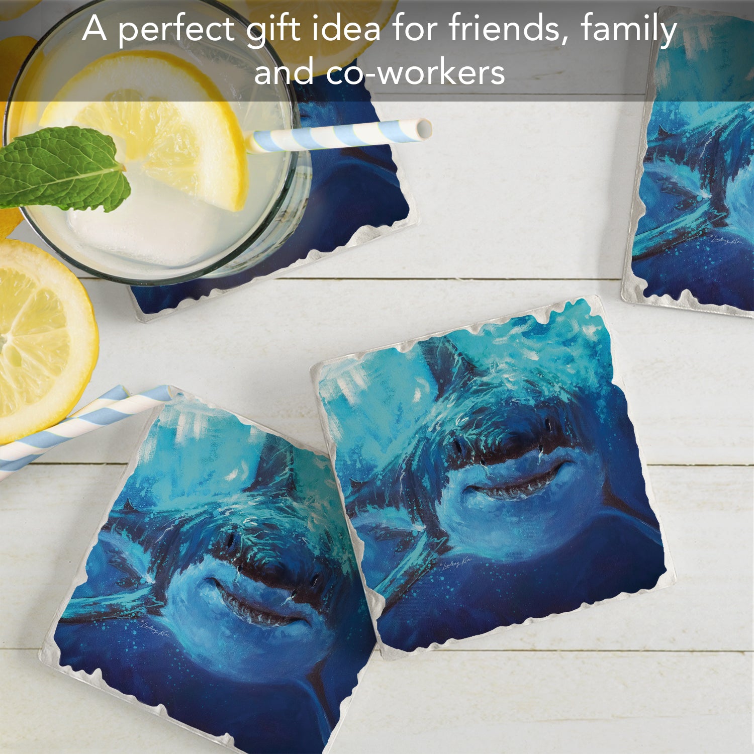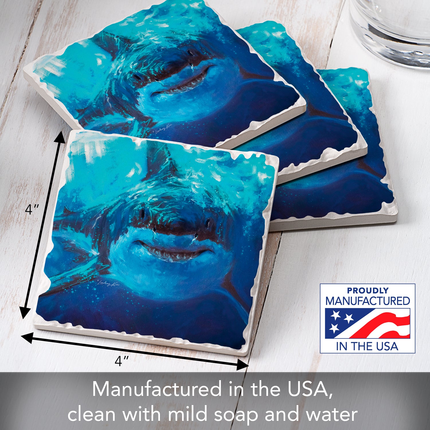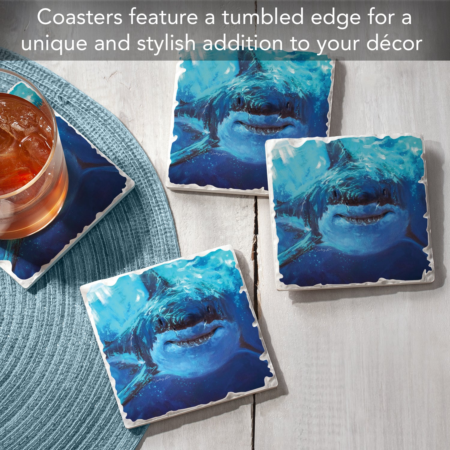 Thirstystone Deep Blue Shark 4 Pack Tumbled Tile Stone Coasters 4" Square Manufactured in the USA