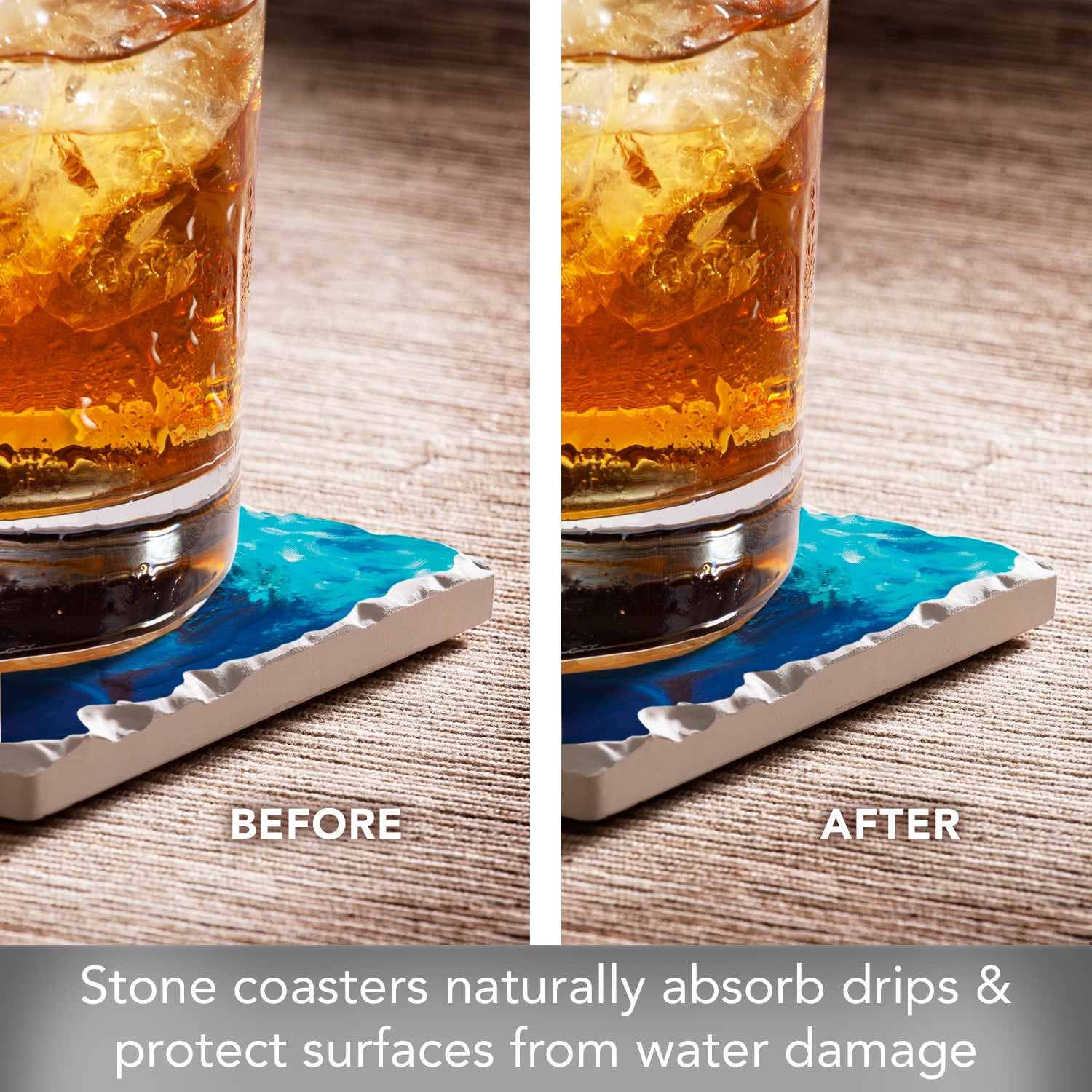 ABSORBENT STONE-Coasters arrive as a set of 4 Coasters. Each Coaster is constructed of absorbent stone that continuously absorbs drips and condensation from your beverages while preventing stains and rings on your furniture.