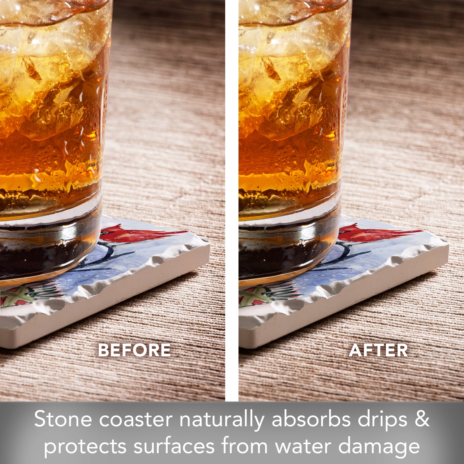 FUNCTIONAL ART-Beautiful artistic design allows the Coaster to remain displayed even when not in use. Each Coaster measures 4” x 4” x .25”. Sized to fit larger Mugs & Glasses.
