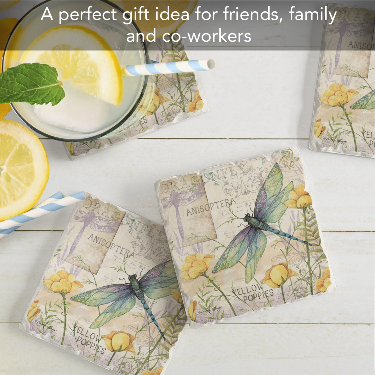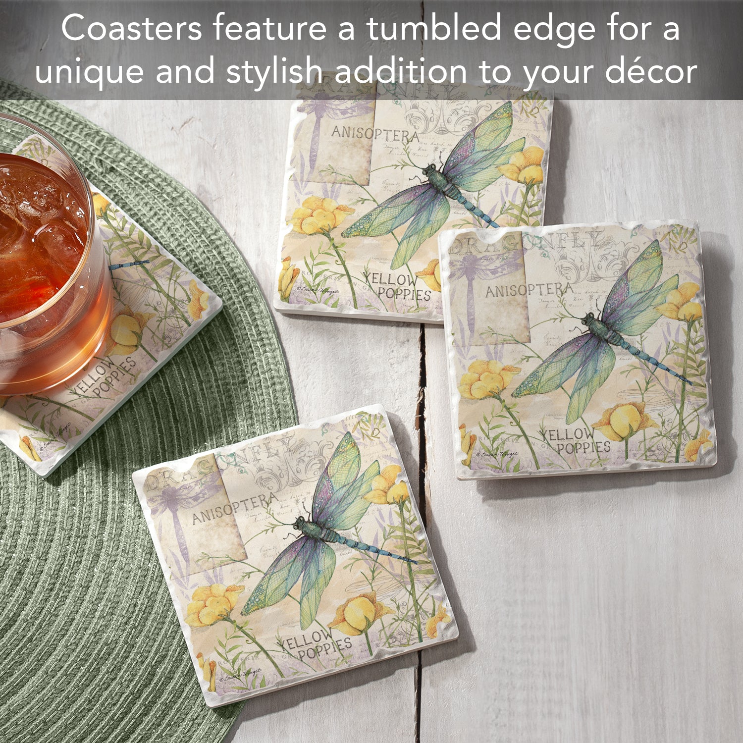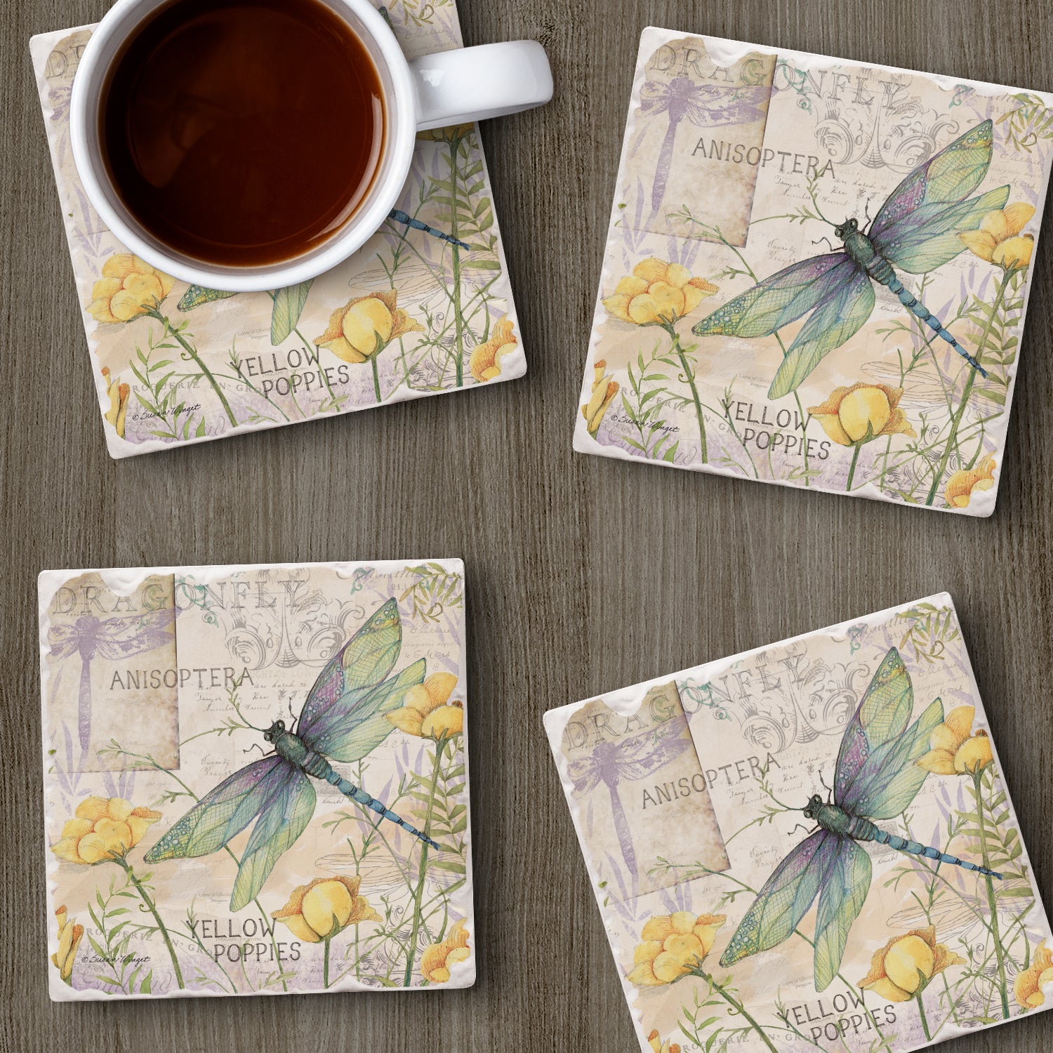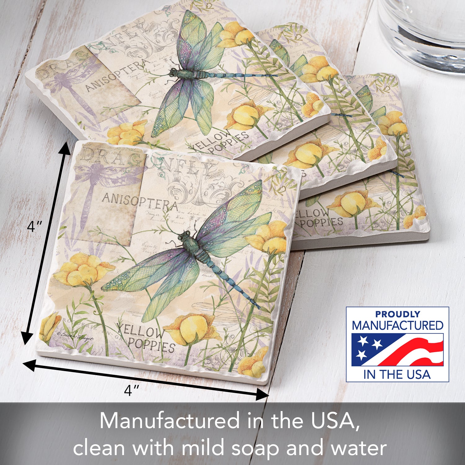 Thirstystone Dragonfly Poppies 4 Pack Tumbled Tile Stone Coasters 4" Square Manufactured in the USA