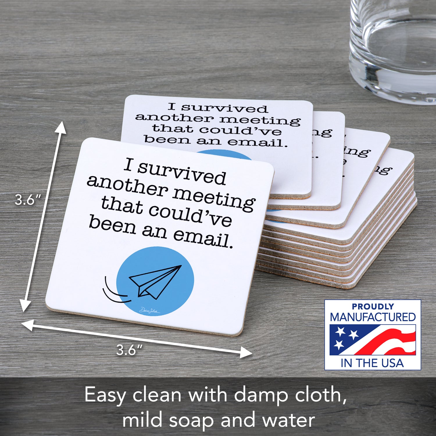 MEASUREMENTS- Coaster measures 3.6" x 3.6" x 0.15" square. Coasters are eco-friendly and reusable until soiled.
