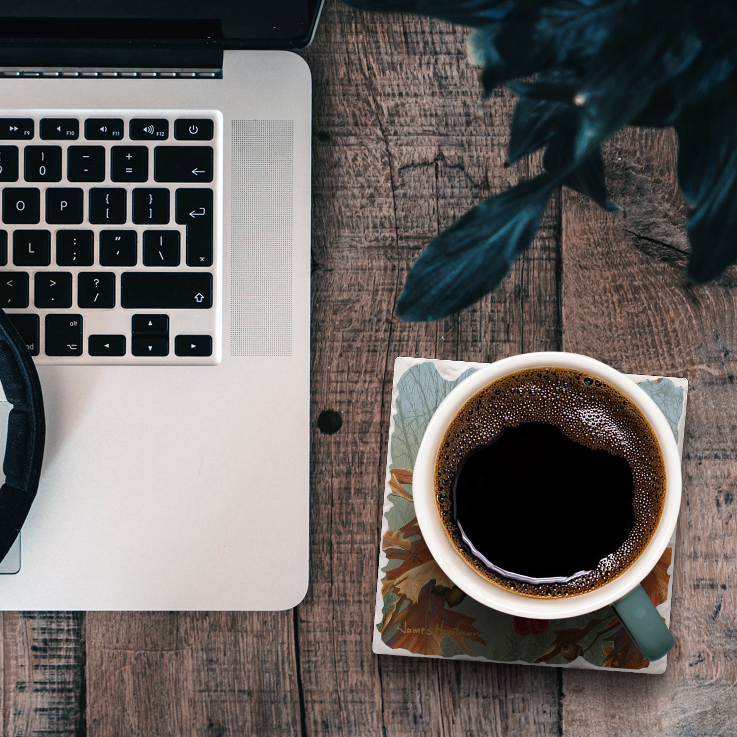 - ARTISTIC DESIGN-Beautiful artistic design allows the Coaster to remain displayed even when not in use. Each Coaster measures 4†x 4†x .25â€. Sized to fit larger Mugs & Glasses.