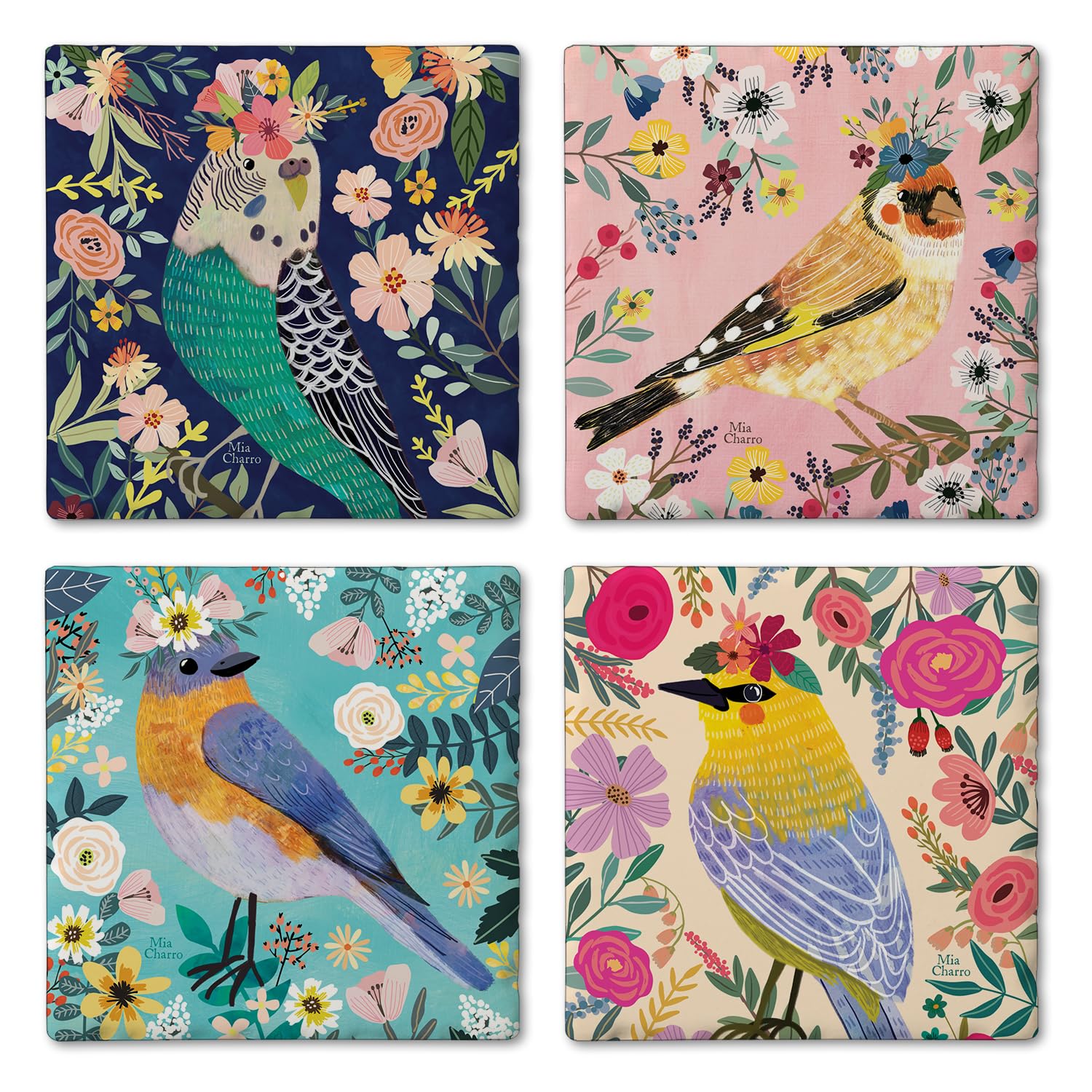 Thirstystone Floral Birds 4 Pack Assorted Tumbled Tile Stone Coasters 4" Square
