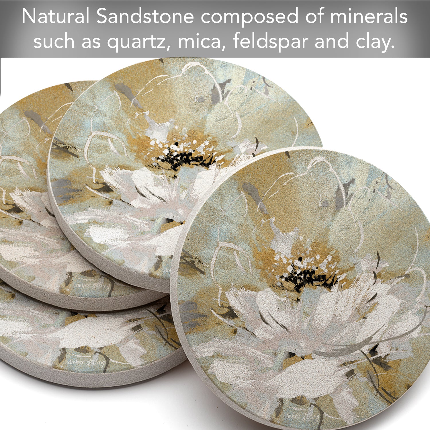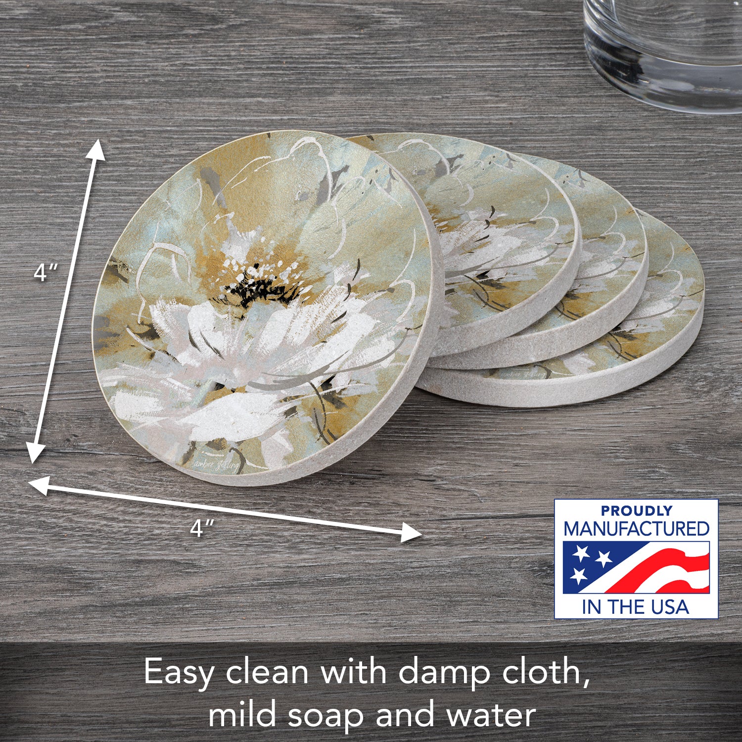 MEASUREMENTS-Each coaster measures 4” round. Sandstone coasters are easy to clean with a damp cloth or sponge. Beautiful artistic design allows the Coasters to remain displayed even when not in use.