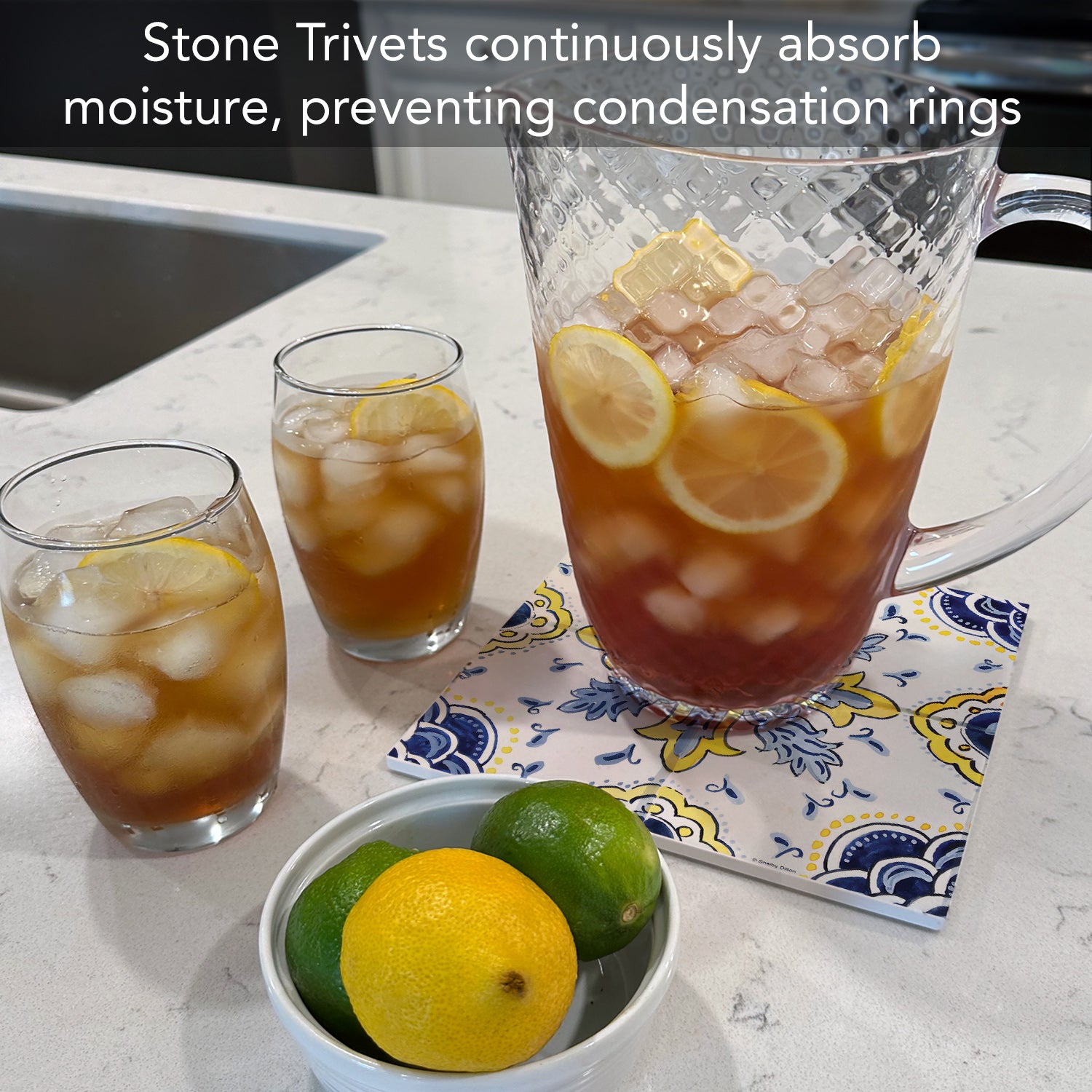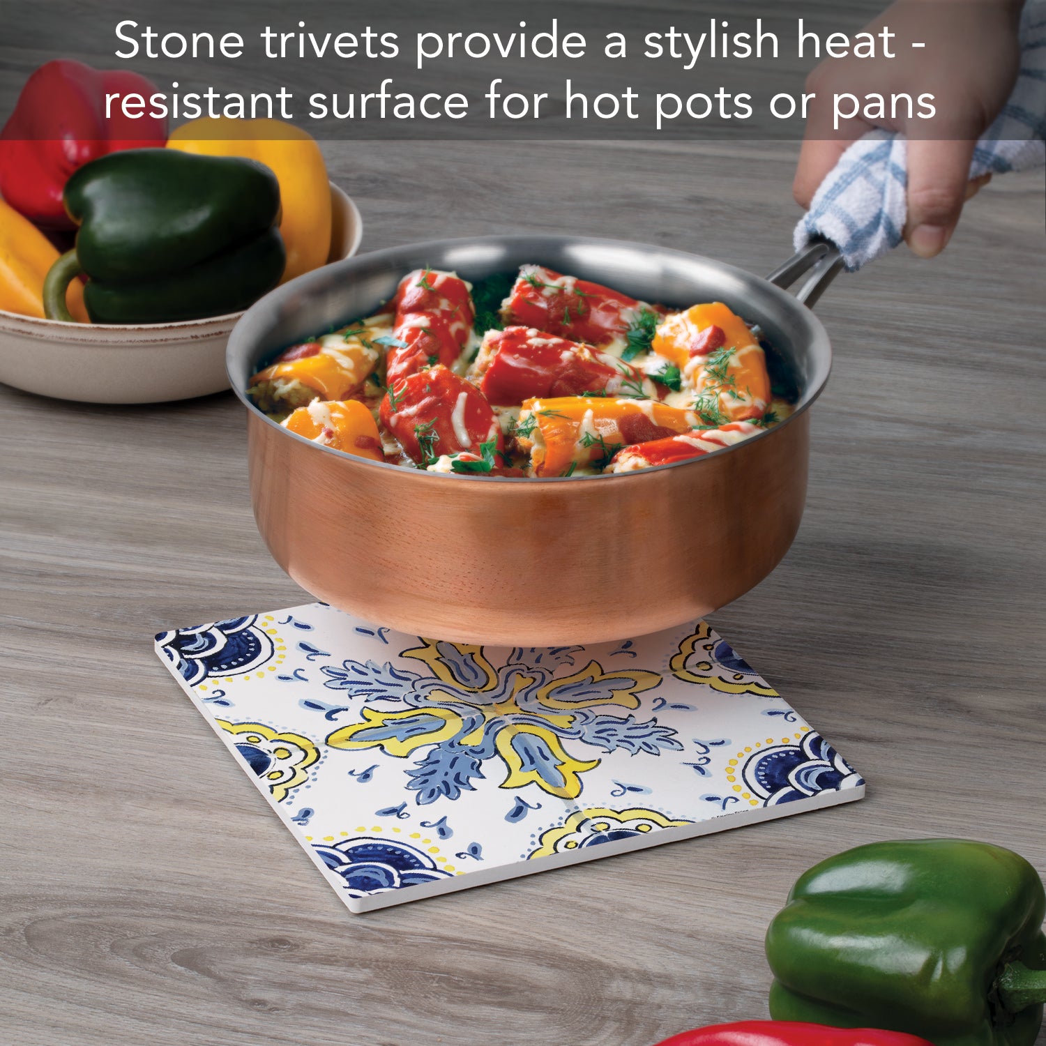 DURABLE-Trivet is made from strong durable ceramic stone. Stone absorbs heat and distributes it throughout the Trivet to keep from damaging your favorite pots and surfaces.