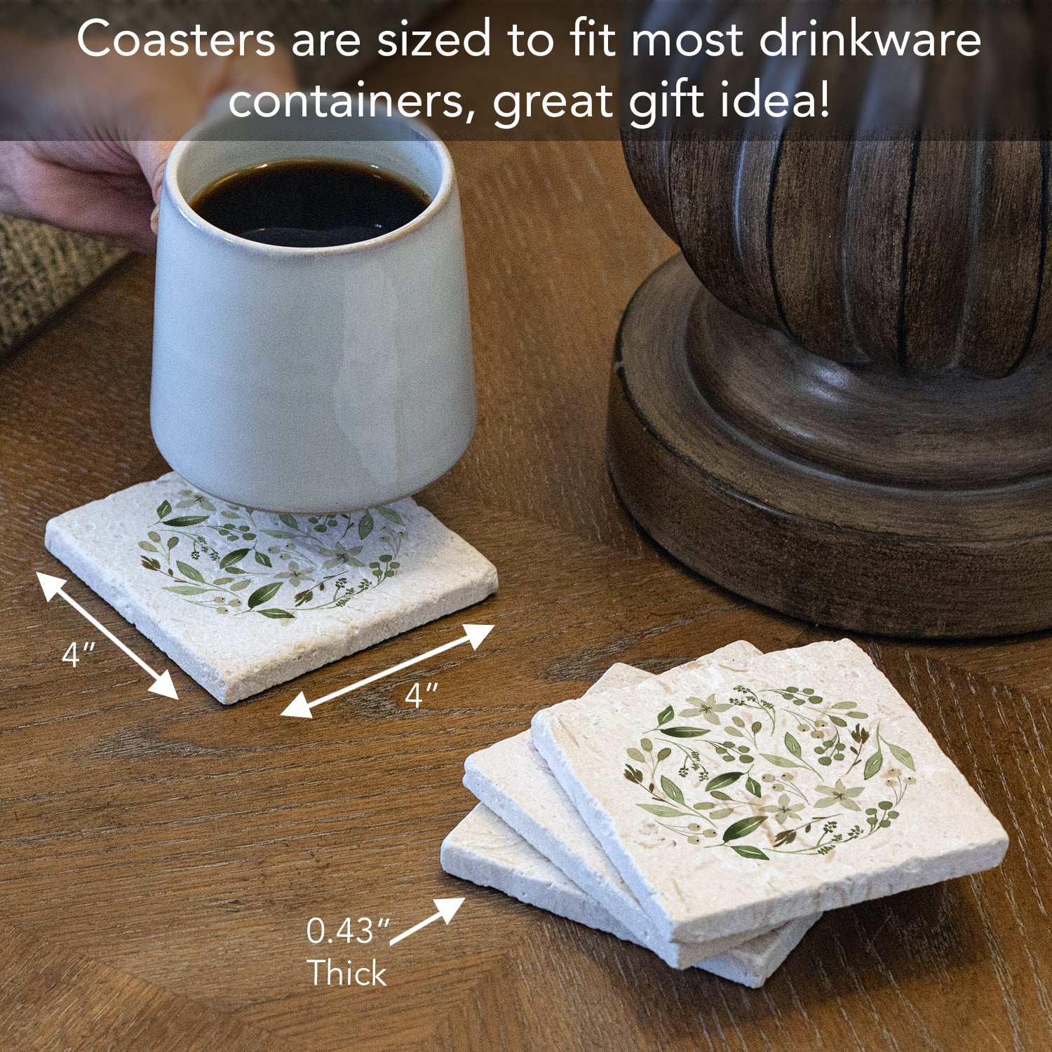 MEASUREMENTS-Each coaster measures 4" x 4" x .43". Sized to fit most drinkware containers, suitable for both hot and cold beverages.