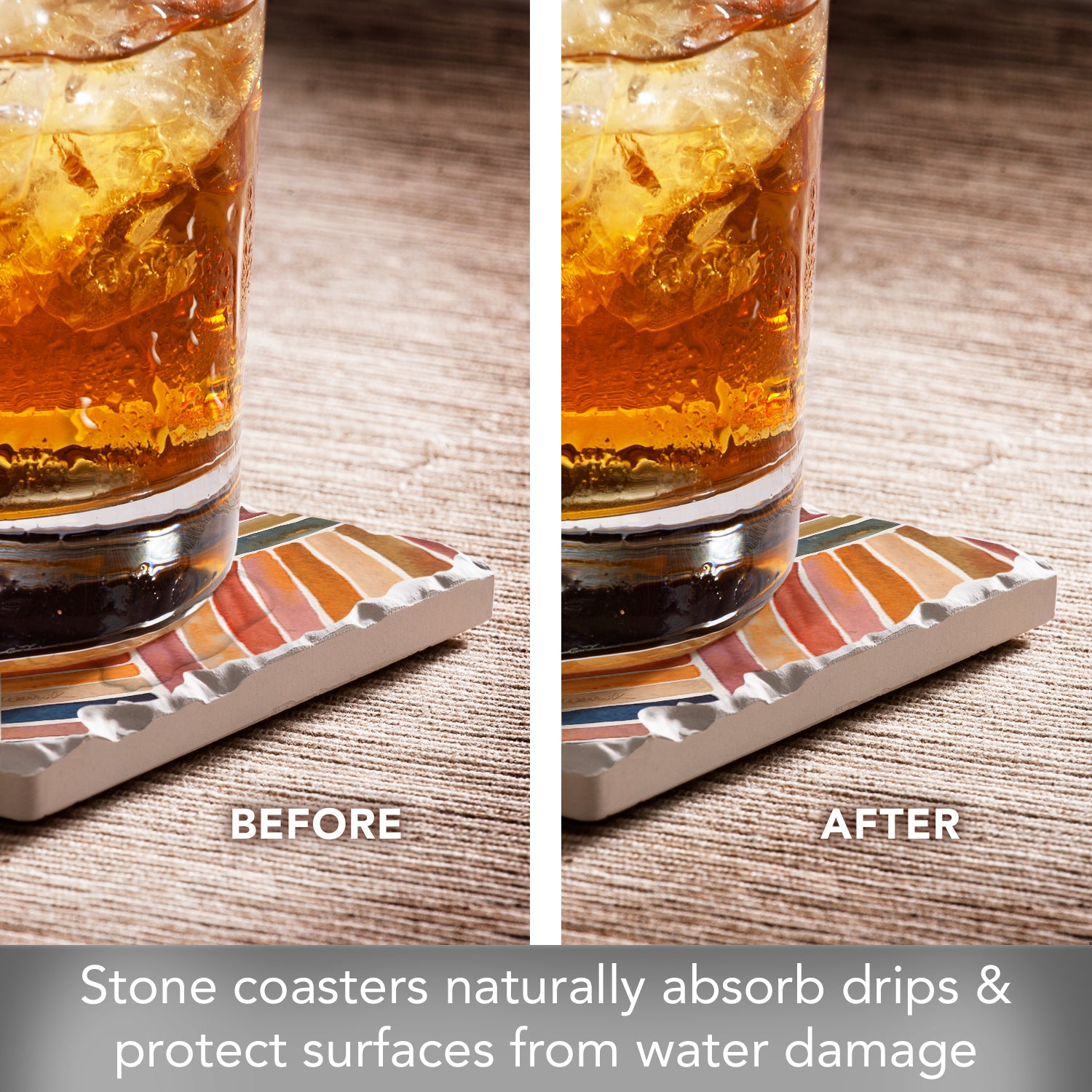 ABSORBENT STONE-Coasters arrive as a set of 4 Coasters. Each Coaster is constructed of absorbent stone that continuously absorbs drips and condensation from your beverages while preventing stains and rings on your furniture.