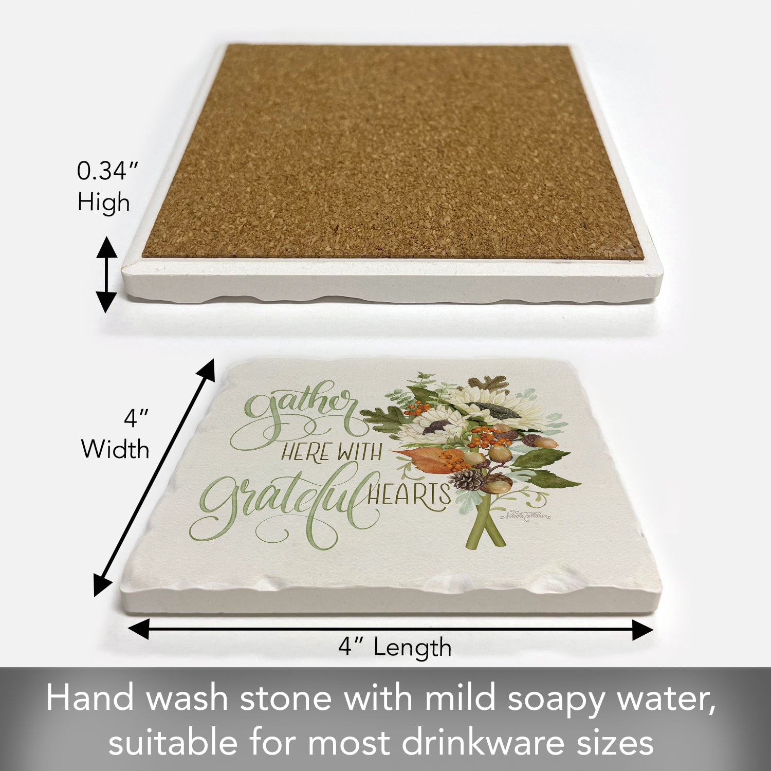 FUNCTIONAL ART-Beautiful artistic design allows the Coaster to remain displayed even when not in use. Each Coaster measures 4” x 4” x .25”. Sized to fit larger Mugs & Glasses.