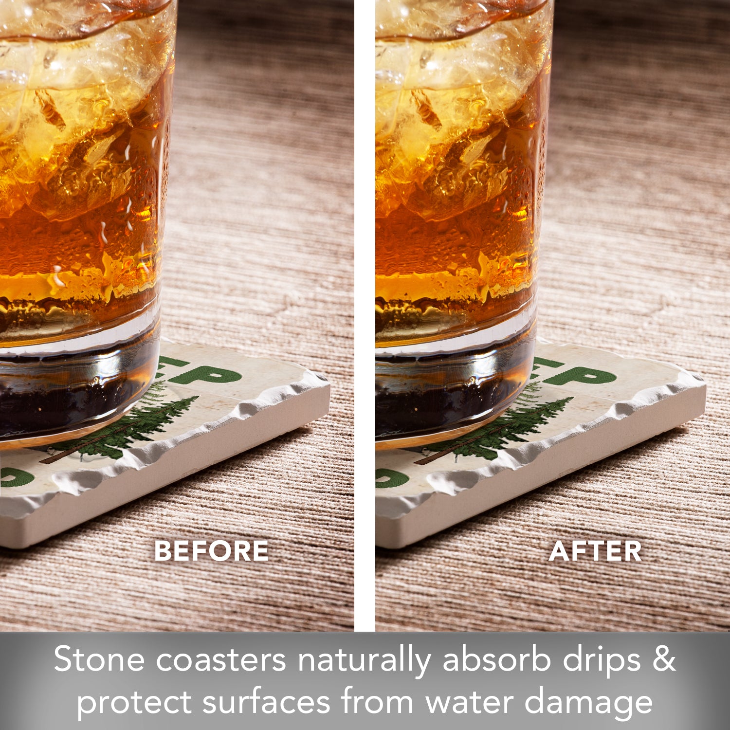 ABSORBENT STONE-Coasters arrive as a set of 4 Coasters. Each Coaster is constructed of absorbent stone that continuously absorbs drips and condensation from your beverages while preventing stains and rings on your furniture.