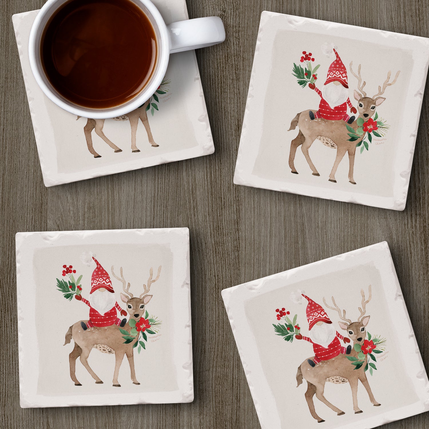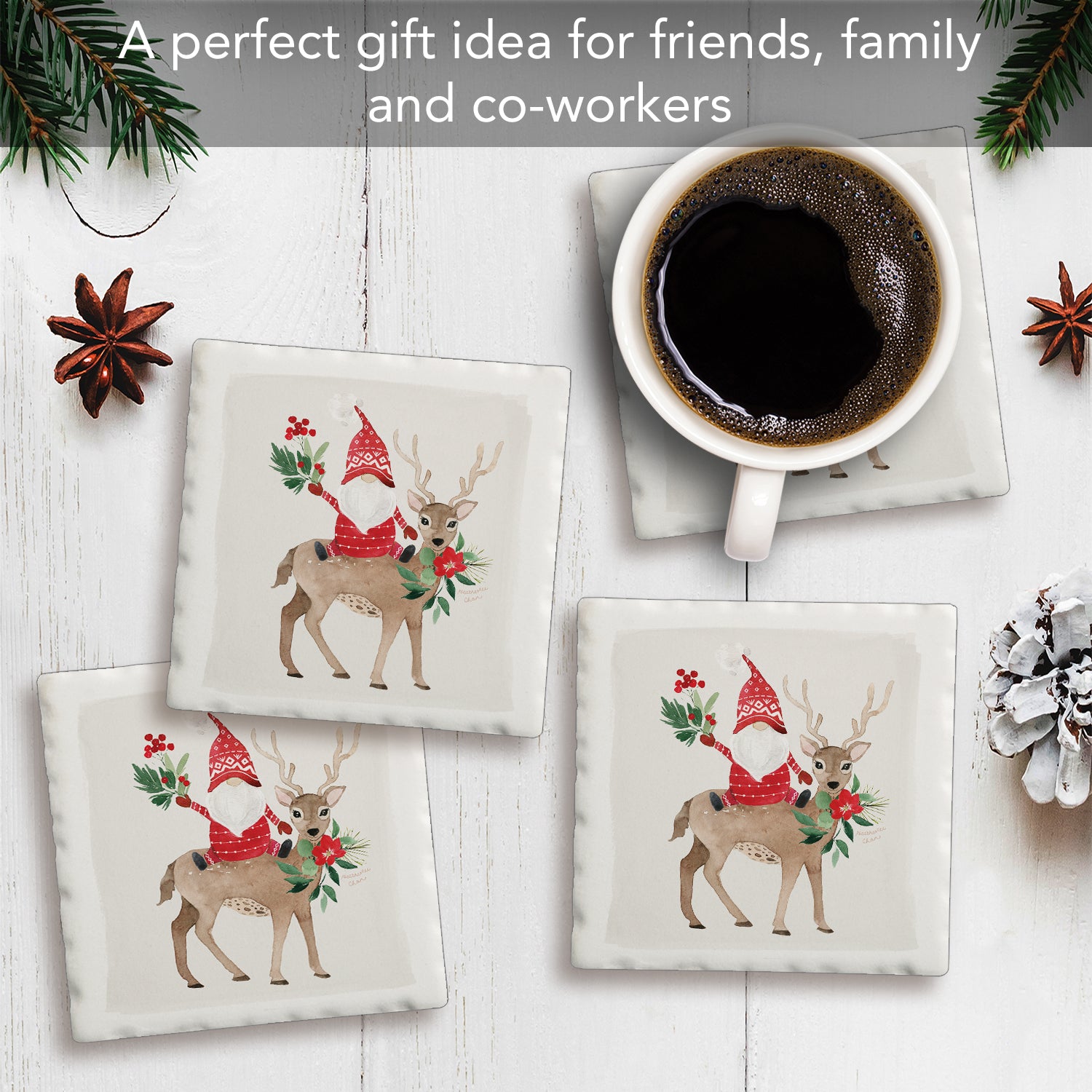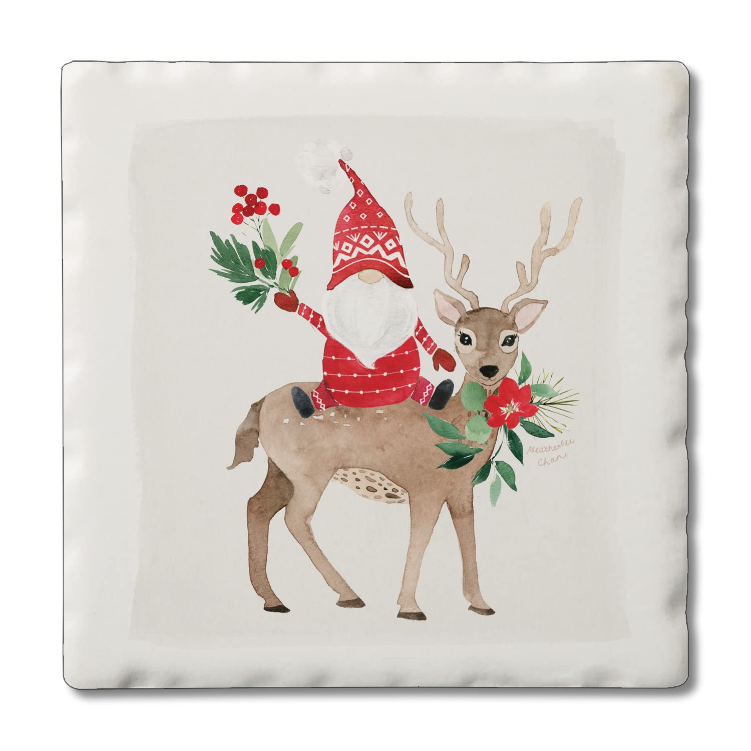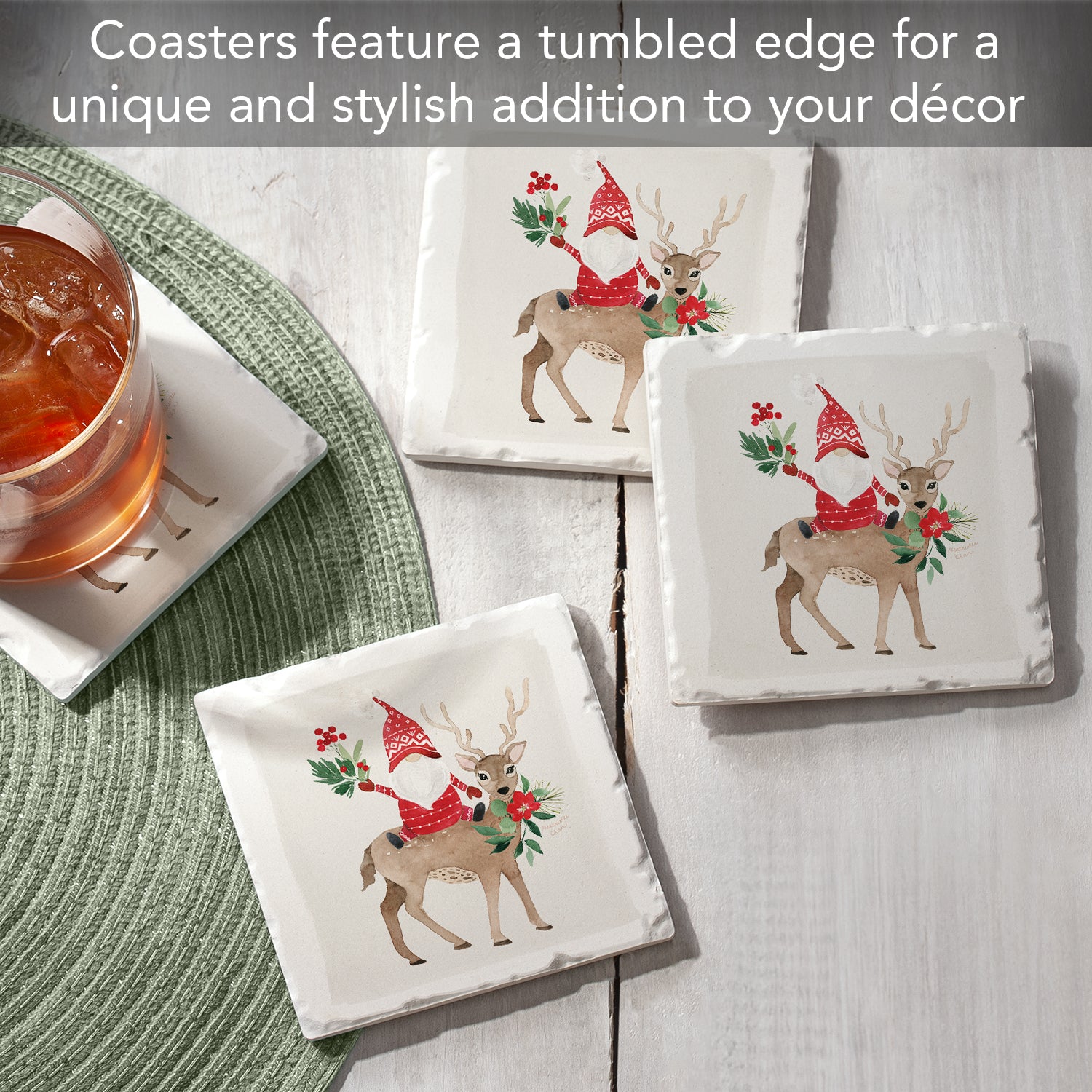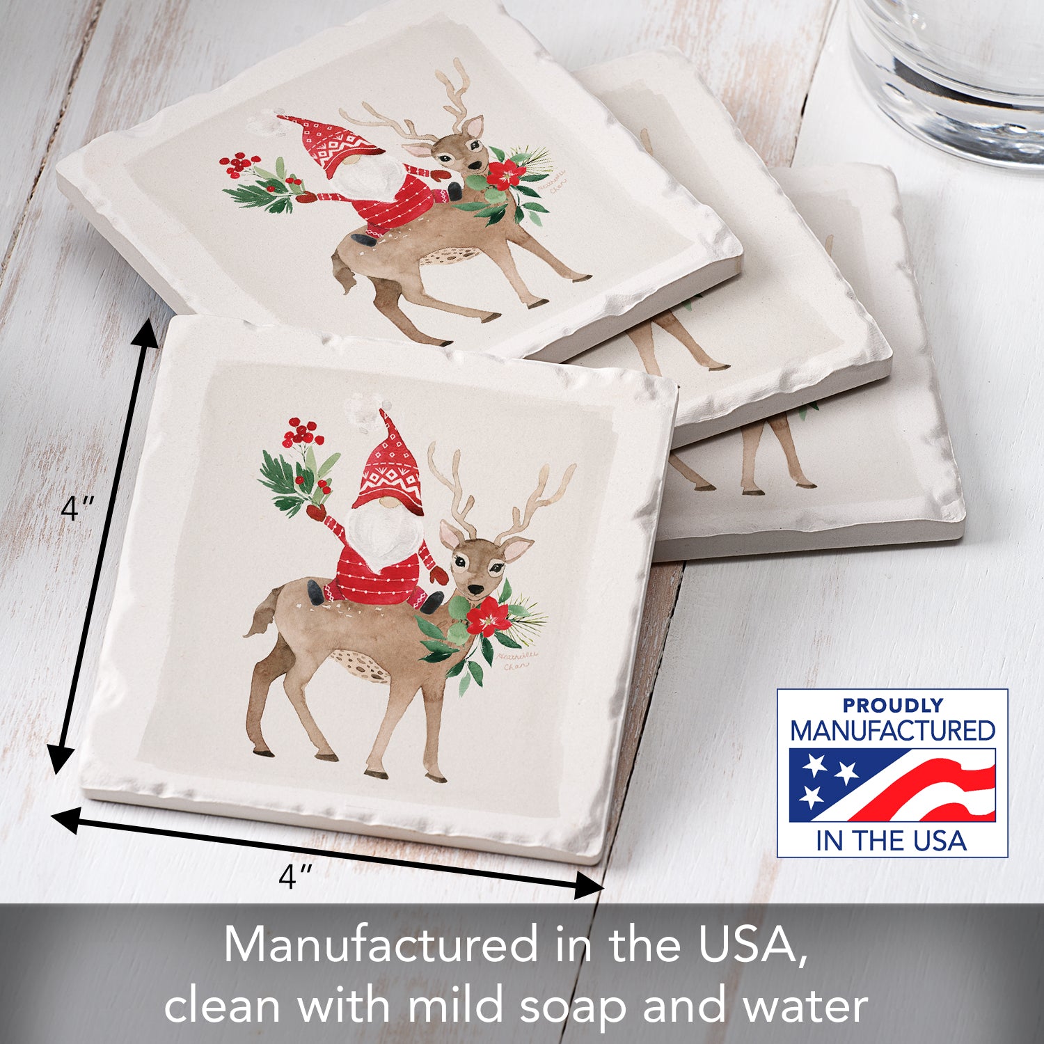 Thirstystone Gnome On Deer 4-Pack Absorbent Stone Tumbled Tile Coasters 4" Square Manufactured in the USA