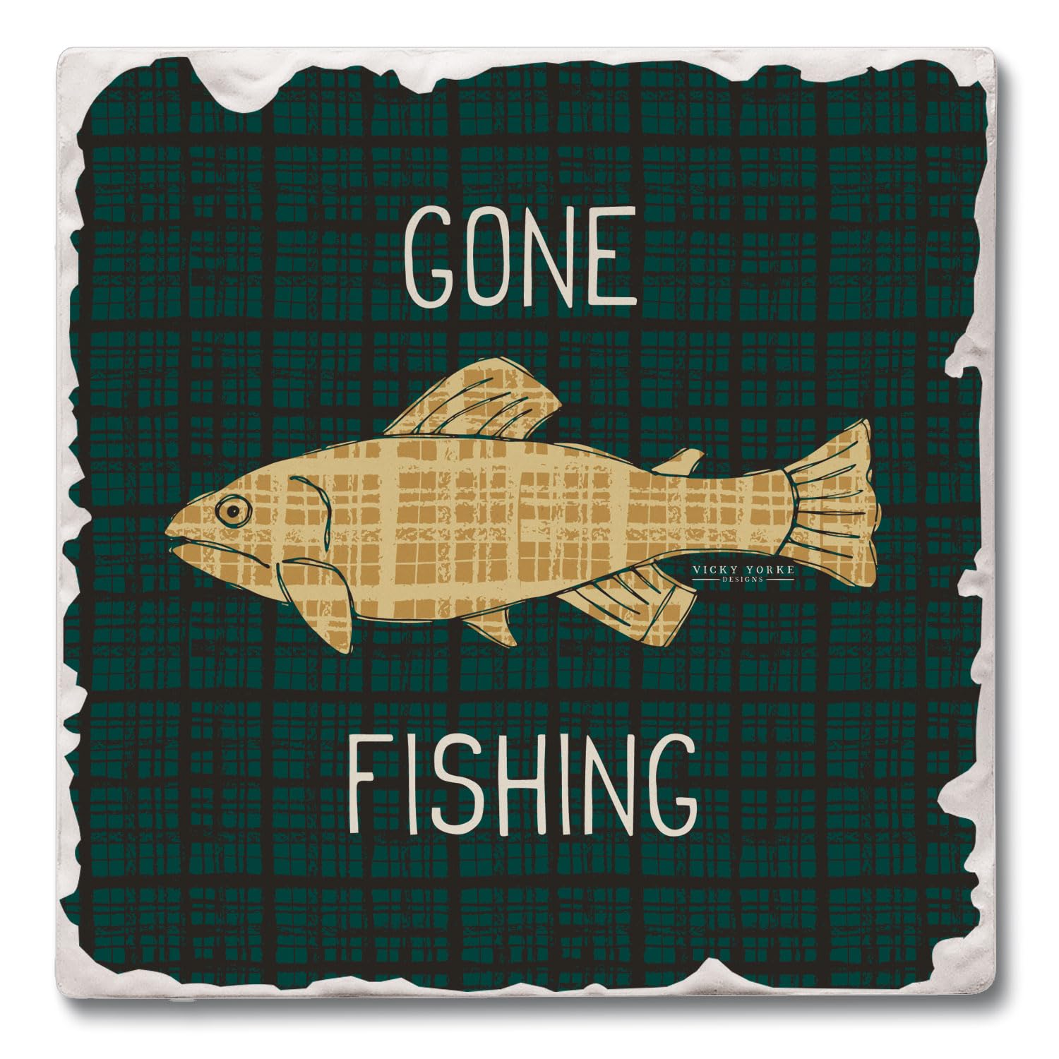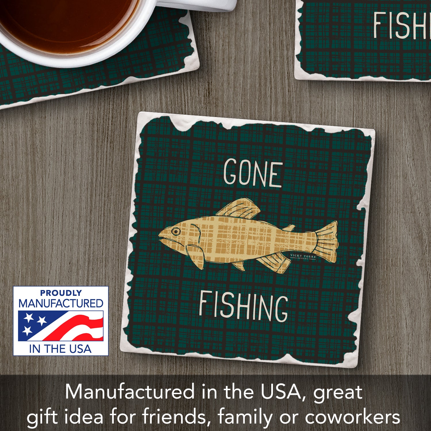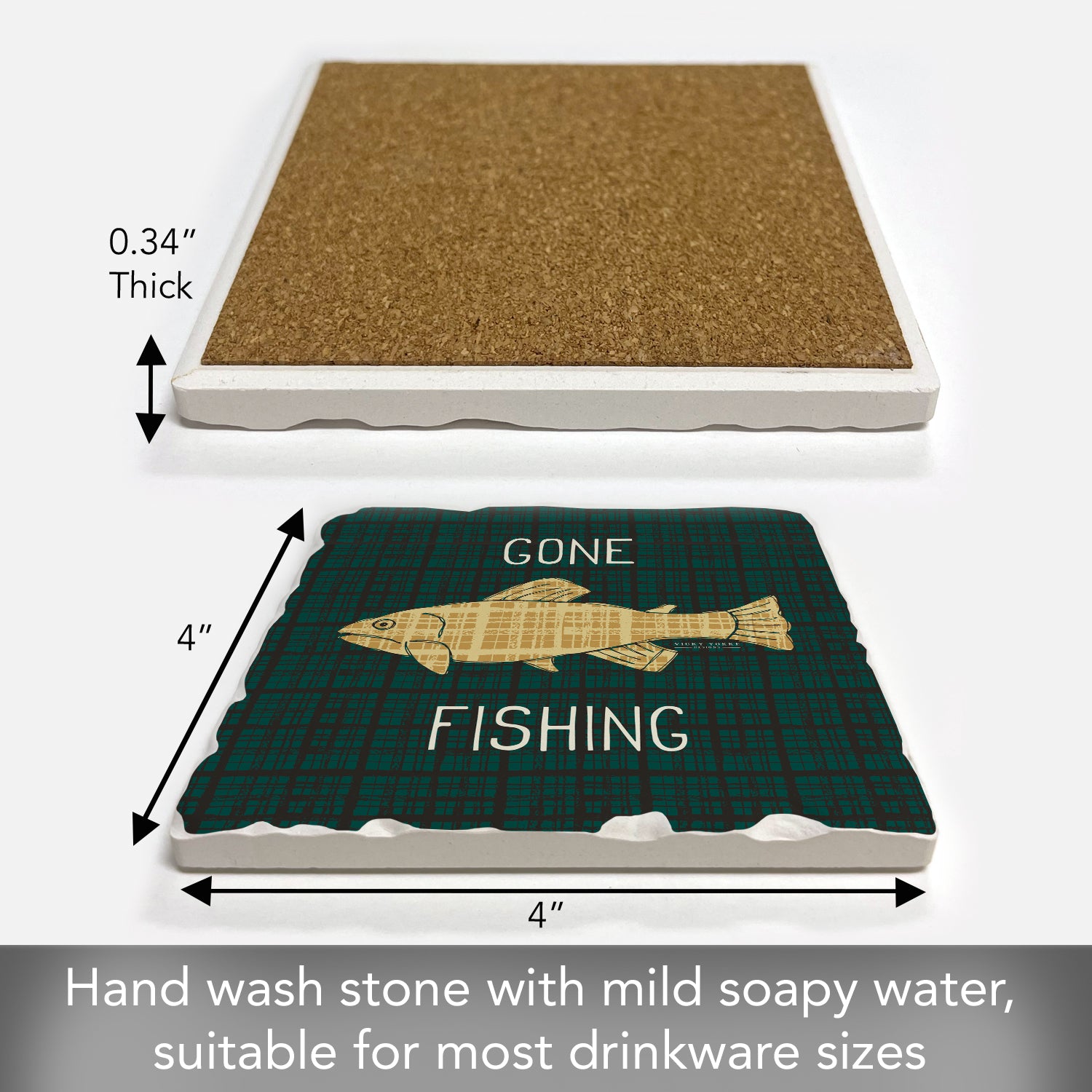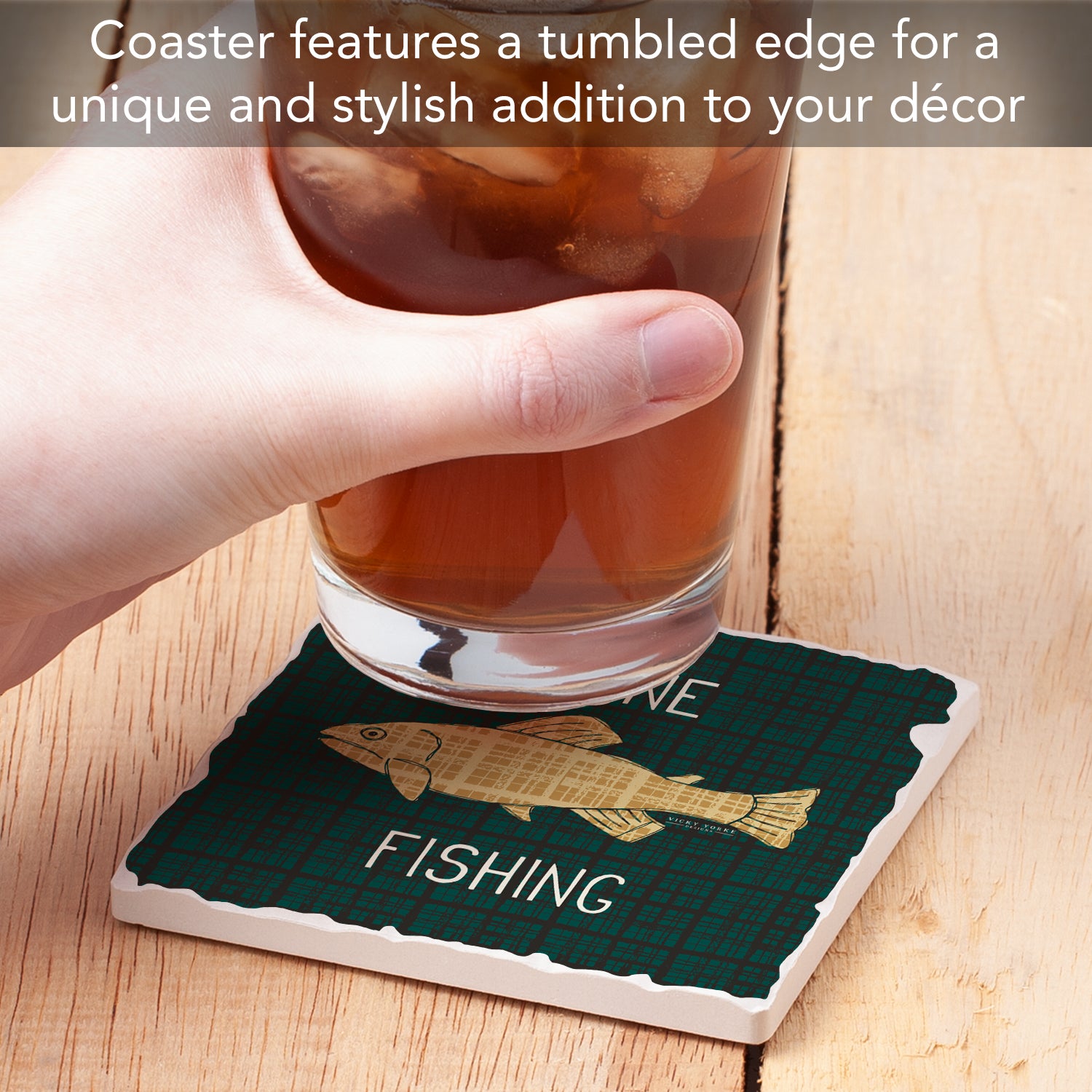 Thirstystone Gone Fishing Single Tumbled Tile Stone Coaster with Protective Cork Backing Manufactured in The USA 4" Square, Artistic, Easily Wipes Clean