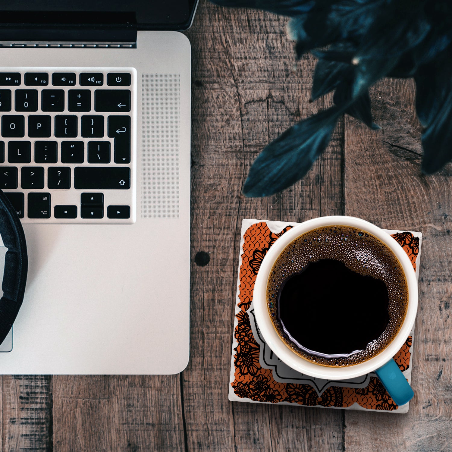 FUNCTIONAL ART-Beautiful artistic design allows the Coaster to remain displayed even when not in use. Each Coaster measures 4” x 4” x .25”. Sized to fit larger Mugs & Glasses.
