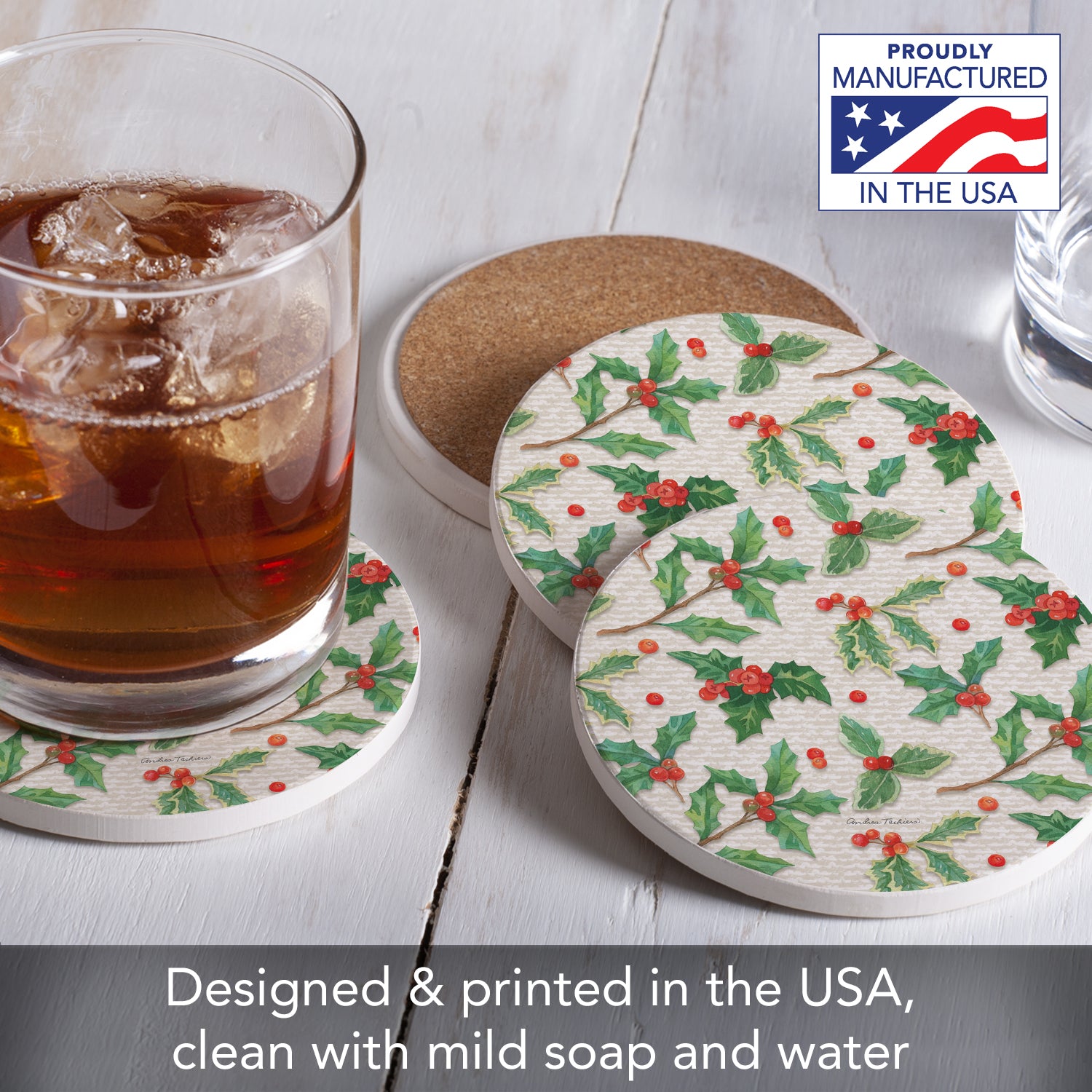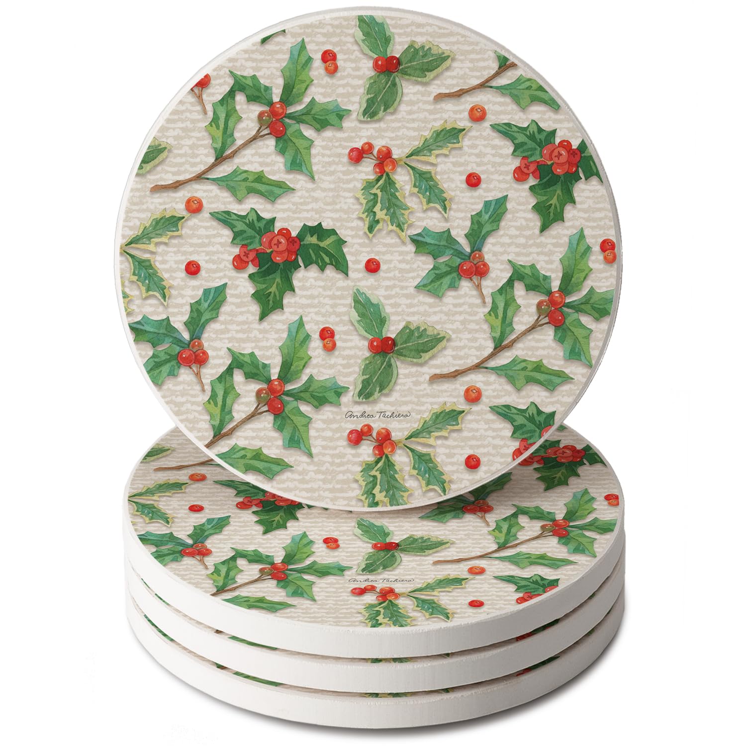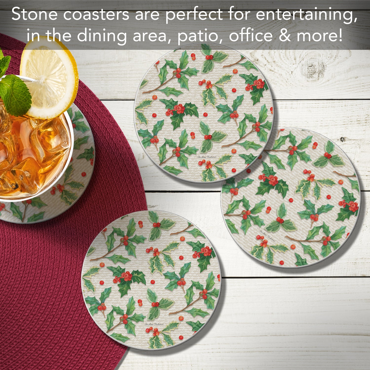 Thirstystone Happy Holly 4 Pack Round Absorbent Stone Coasters 4" Diameter