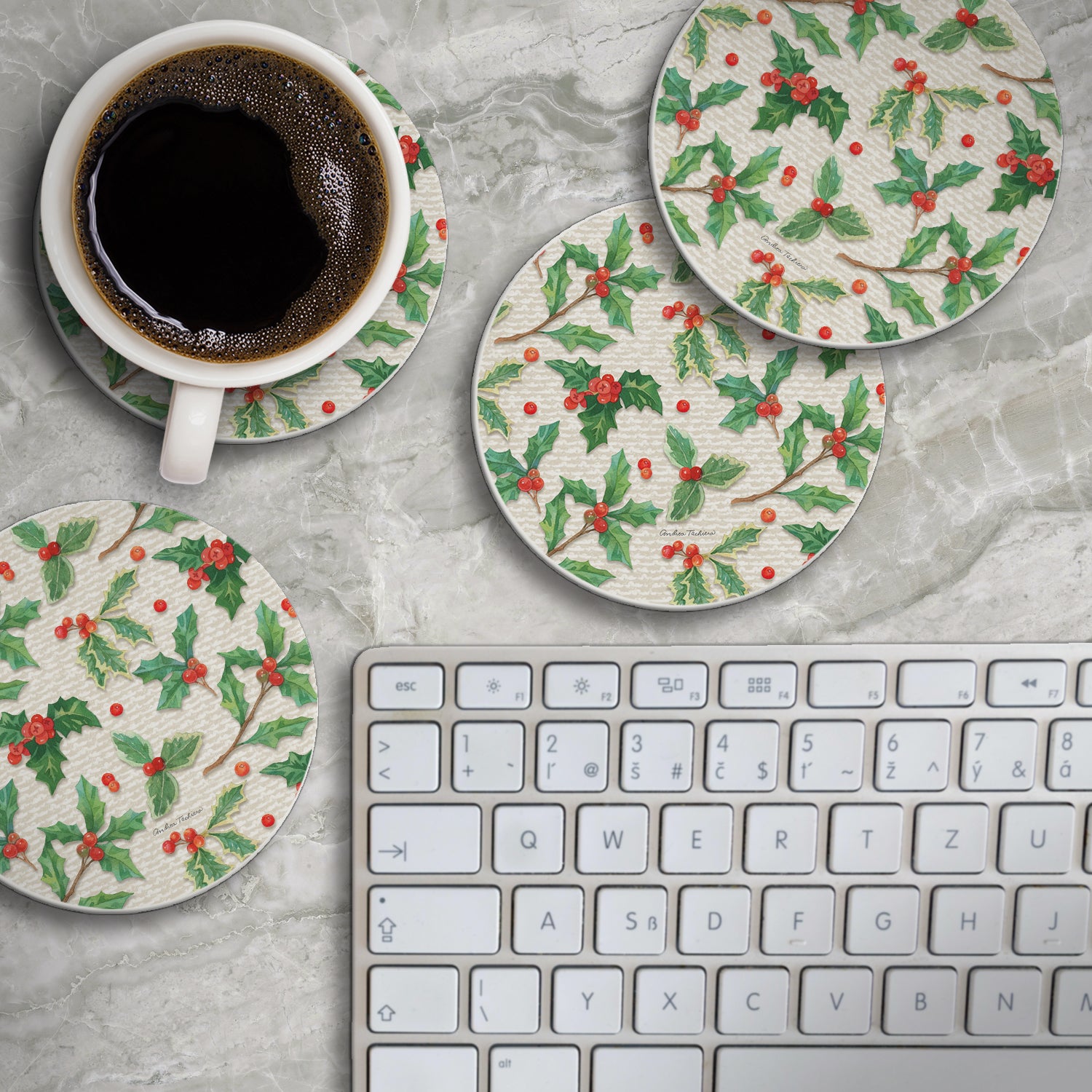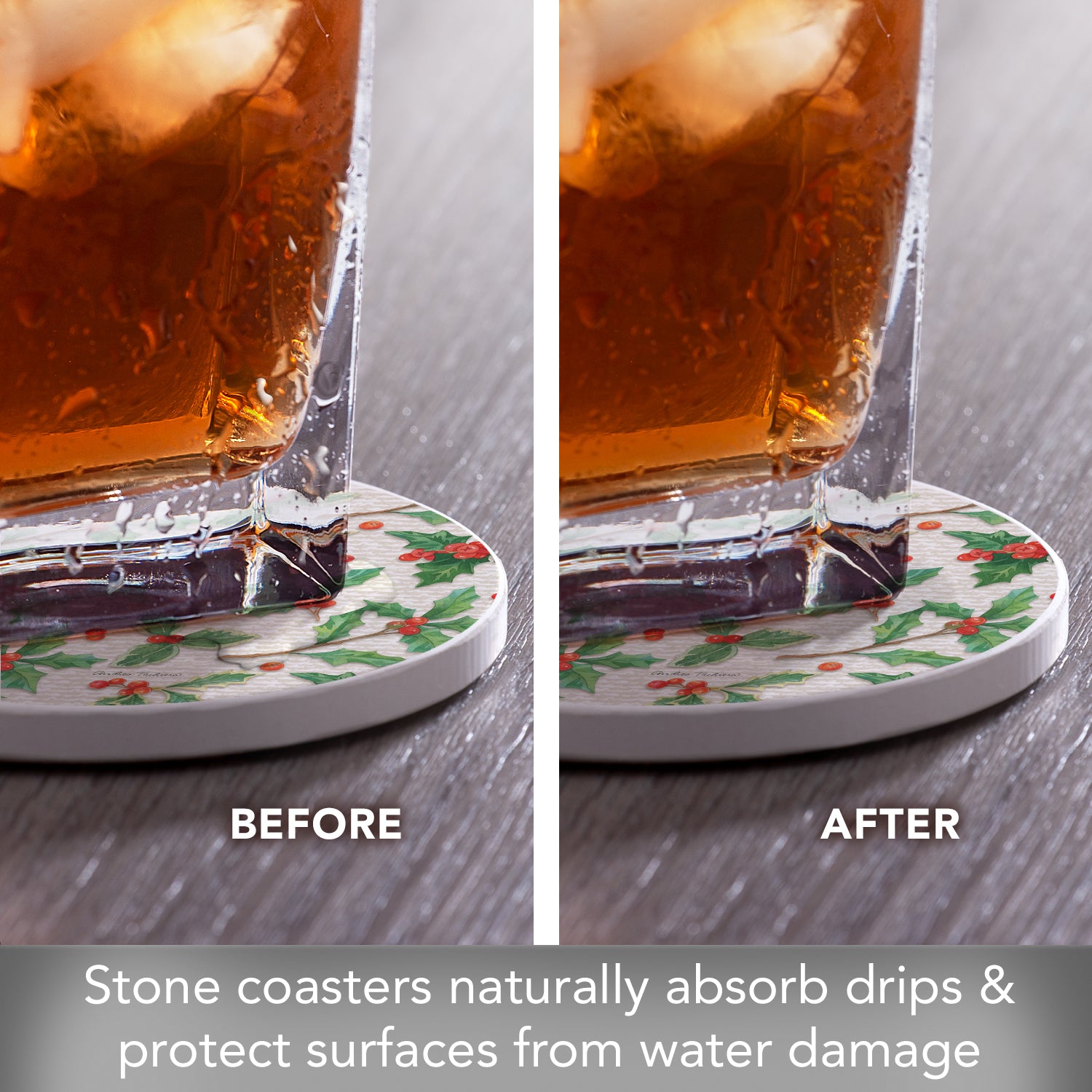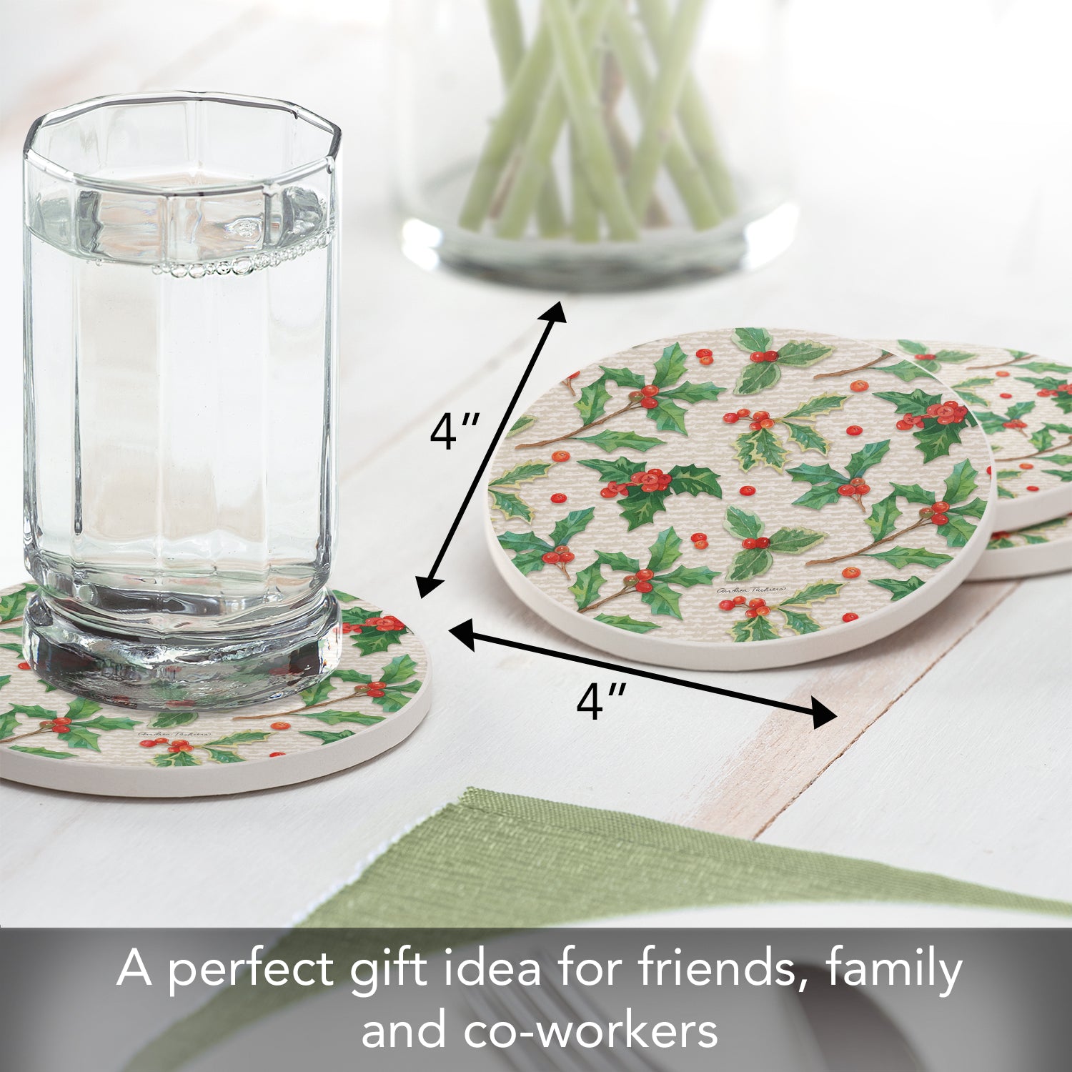 Thirstystone Happy Holly 4 Pack Round Absorbent Stone Coasters 4" Diameter