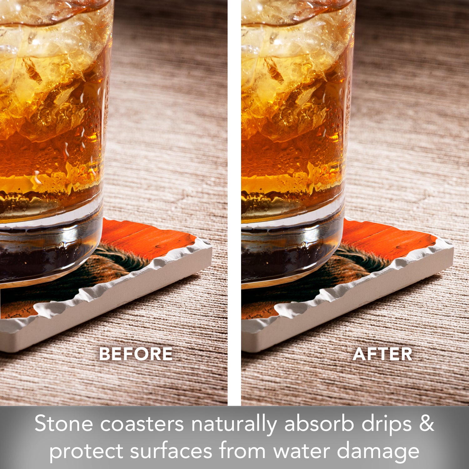 ABSORBENT STONE-Coasters arrive as a set of 4 Coasters. Each Coaster is constructed of absorbent stone that continuously absorbs drips and condensation from your beverages while preventing stains and rings on your furniture.