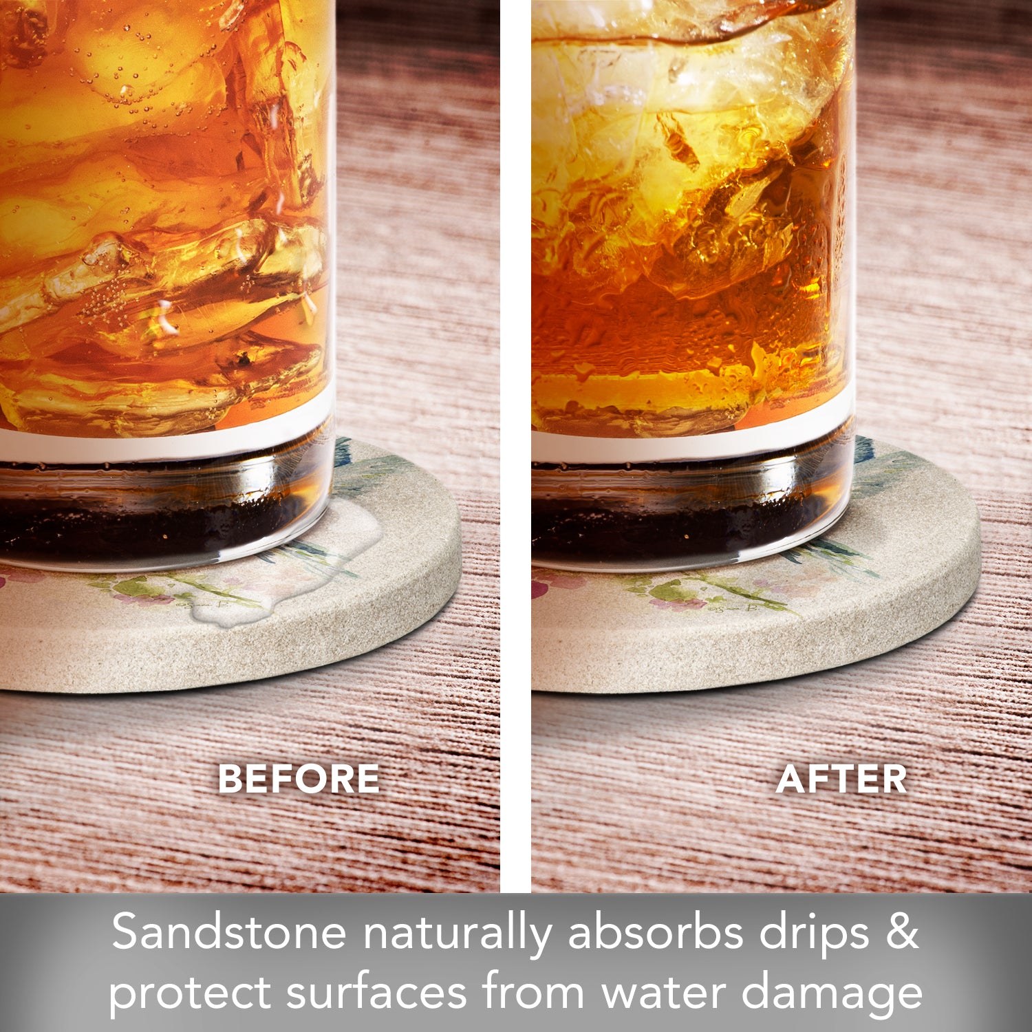 ABSORBENT-Sandstone is naturally absorbent. These Sandstone Coasters will continually absorb condensation from beverages. Sandstone is also heat tolerant, making it a great choice for protecting tables and countertops from hot beverages.