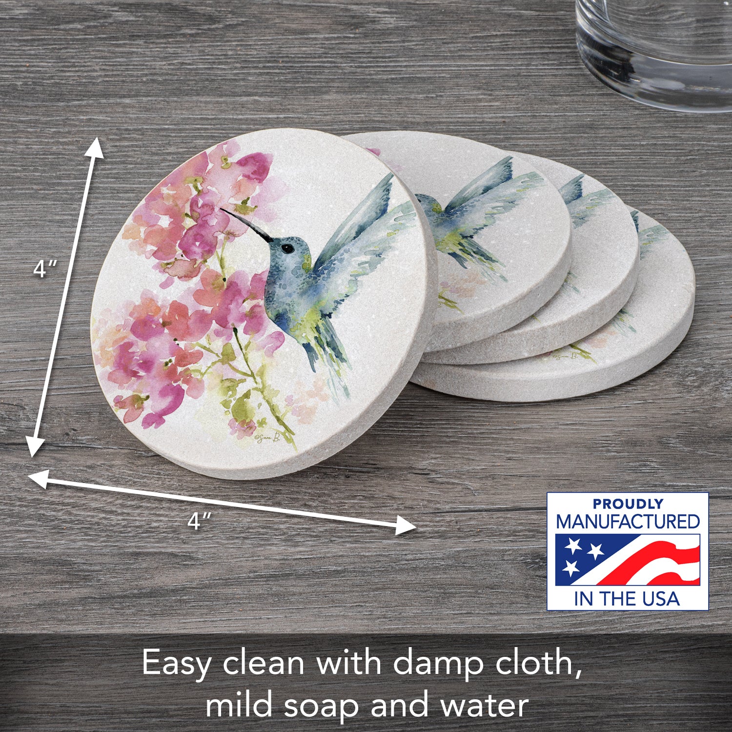 MEASUREMENTS-Each coaster measures 4” square. Sandstone coasters are easy to clean with a damp cloth or sponge. Beautiful artistic design allows the Coasters to remain displayed even when not in use.