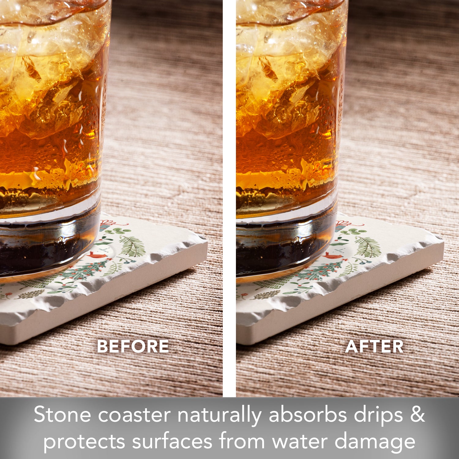 ABSORBENT STONE-Coasters arrive as a set of 4 Coasters. Each Coaster is constructed of absorbent stone that continuously absorbs drips and condensation from your beverages while preventing stains and rings on your furniture.