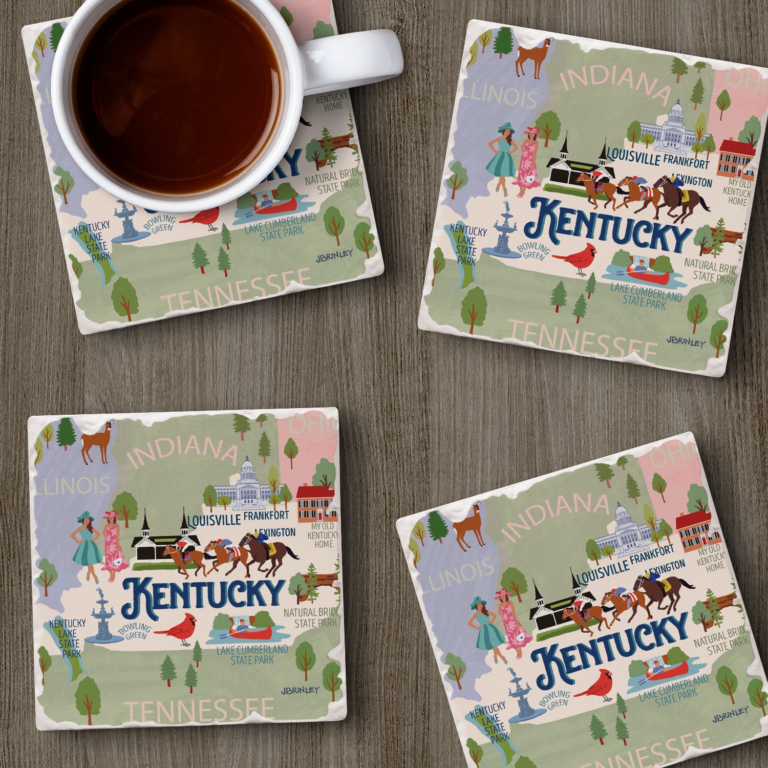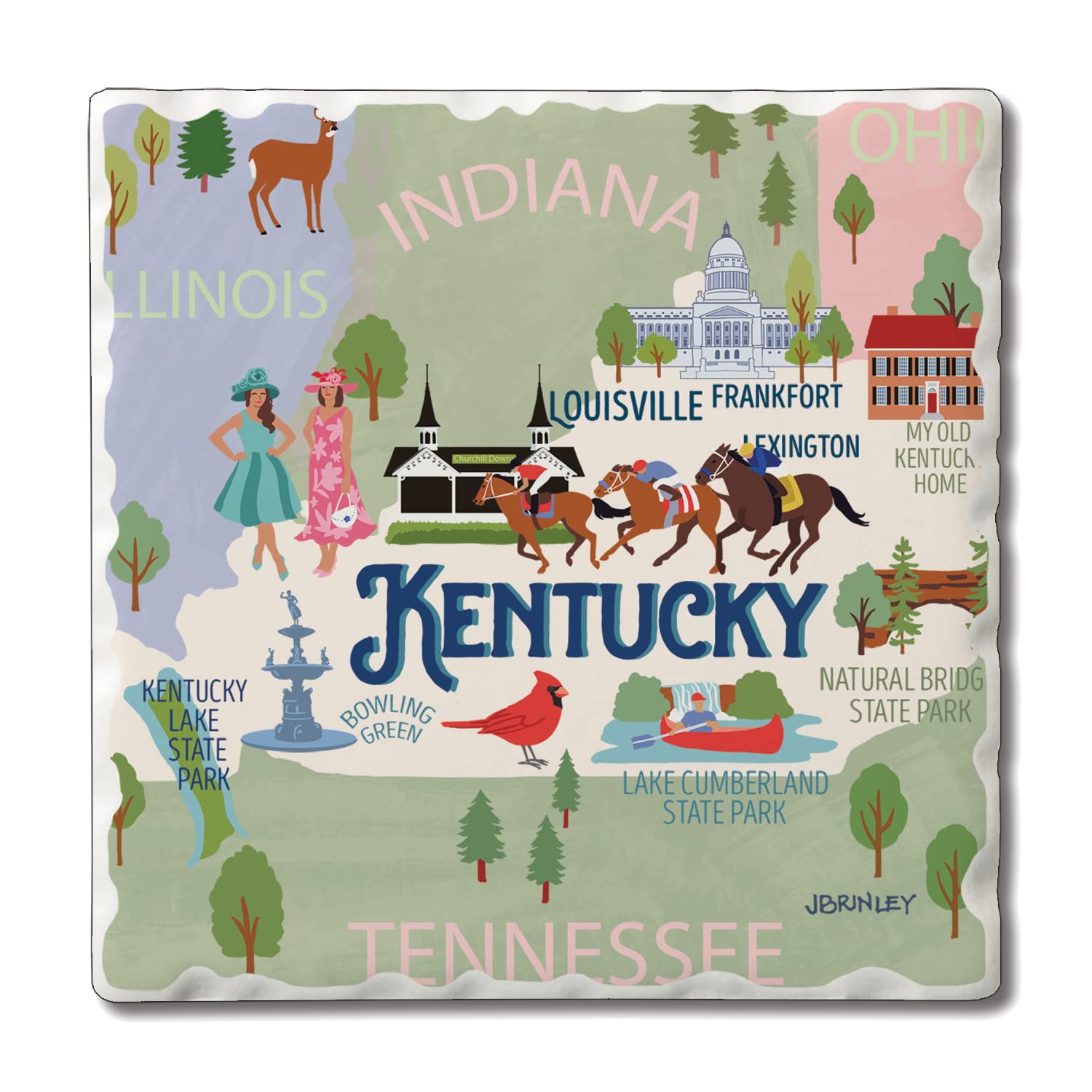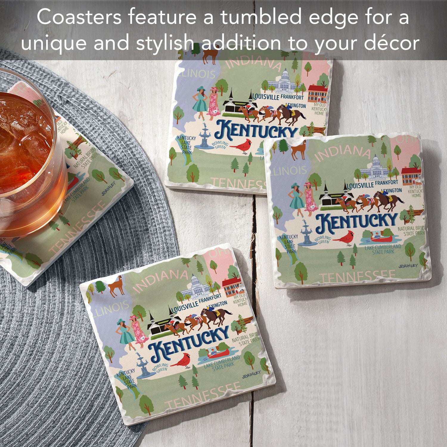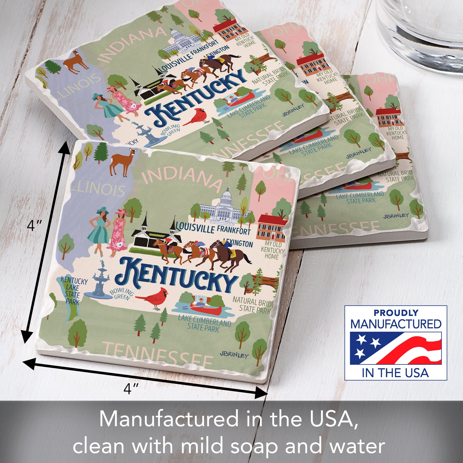 Thirstystone Kentucky Attractions 4 Pack Tumbled Tile Stone Coasters 4” Square Manufactured in the USA
