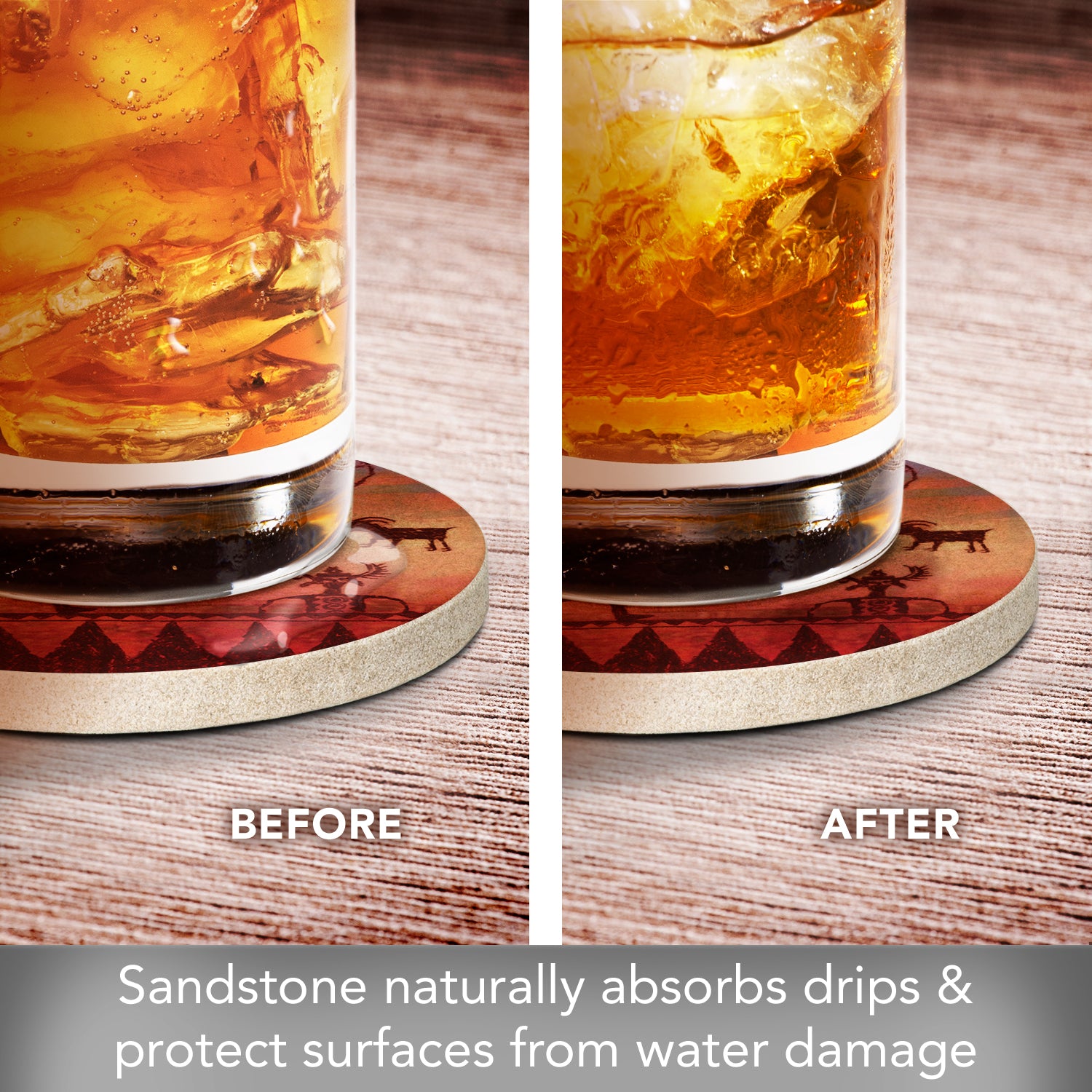 ABSORBENT-Sandstone is naturally absorbent. These Sandstone Coasters will continually absorb condensation from beverages. Sandstone is also heat tolerant, making it a great choice for protecting tables and countertops from hot beverages.