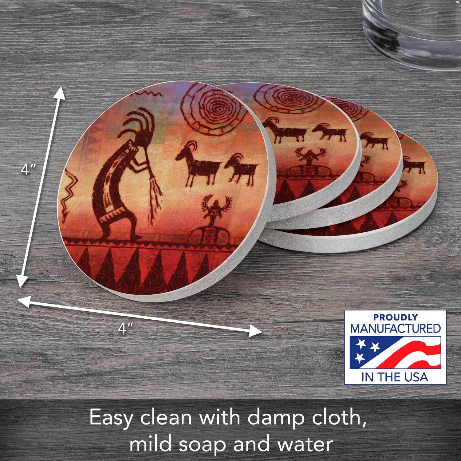 MEASUREMENTS-Each coaster measures 4” round. Sandstone coasters are easy to clean with a damp cloth or sponge. Beautiful artistic design allows the Coasters to remain displayed even when not in use.