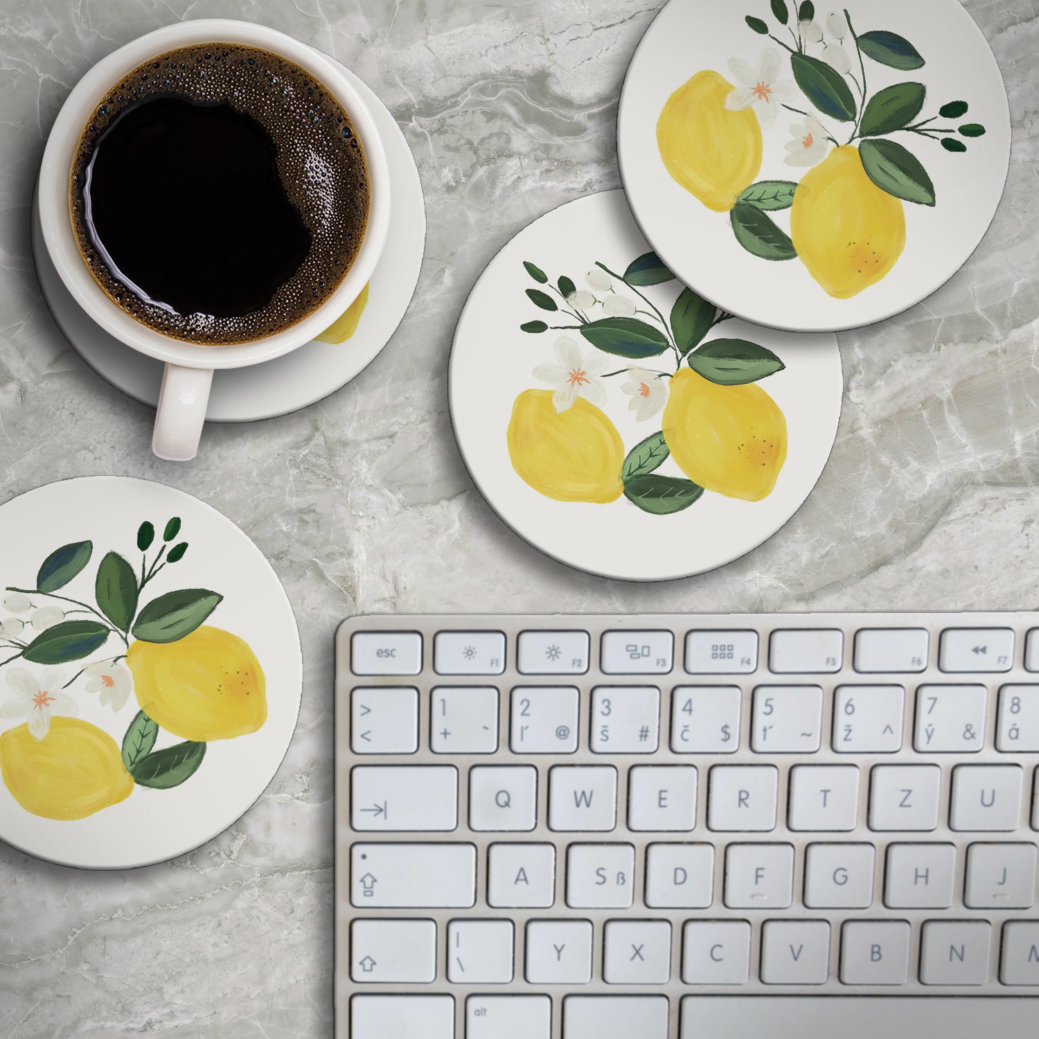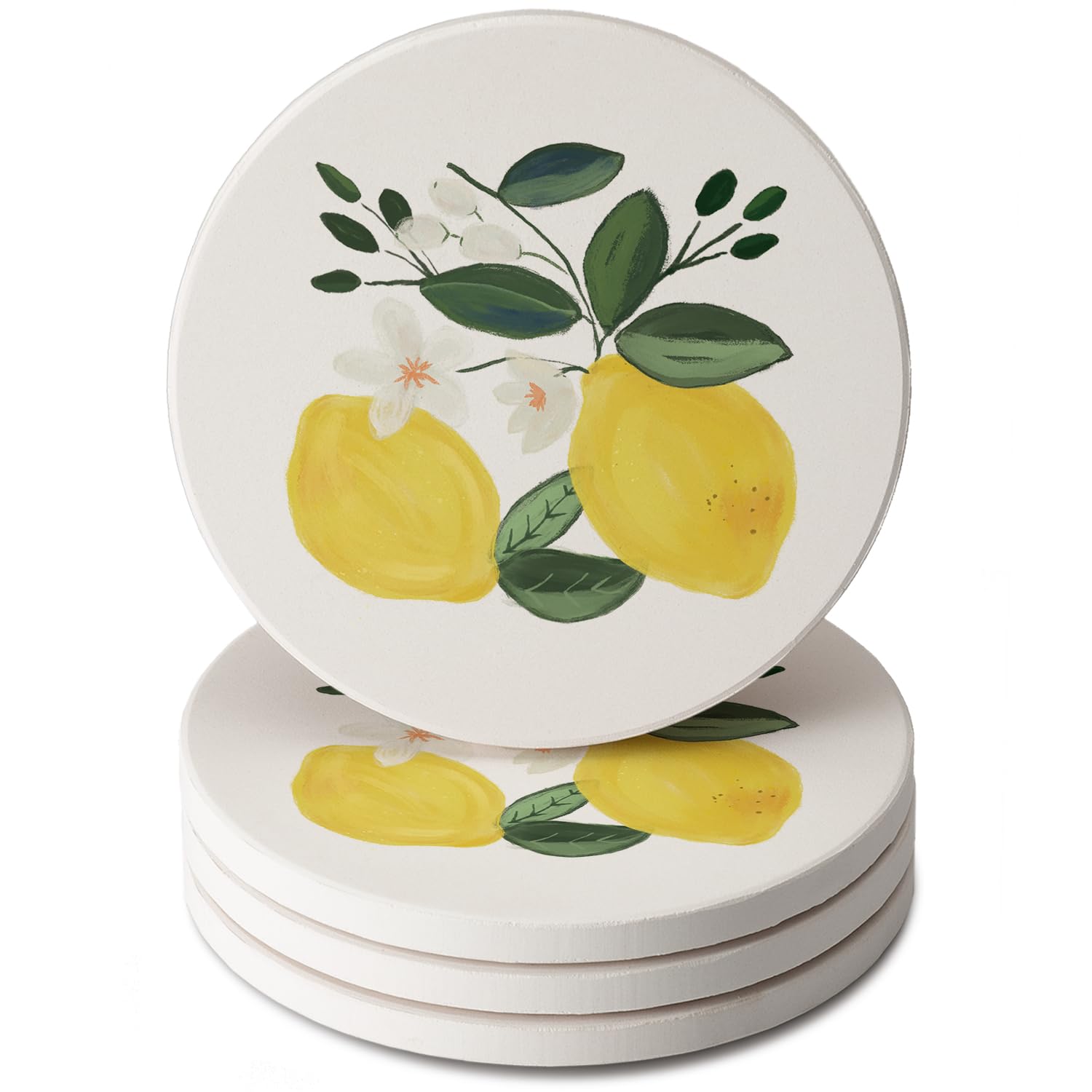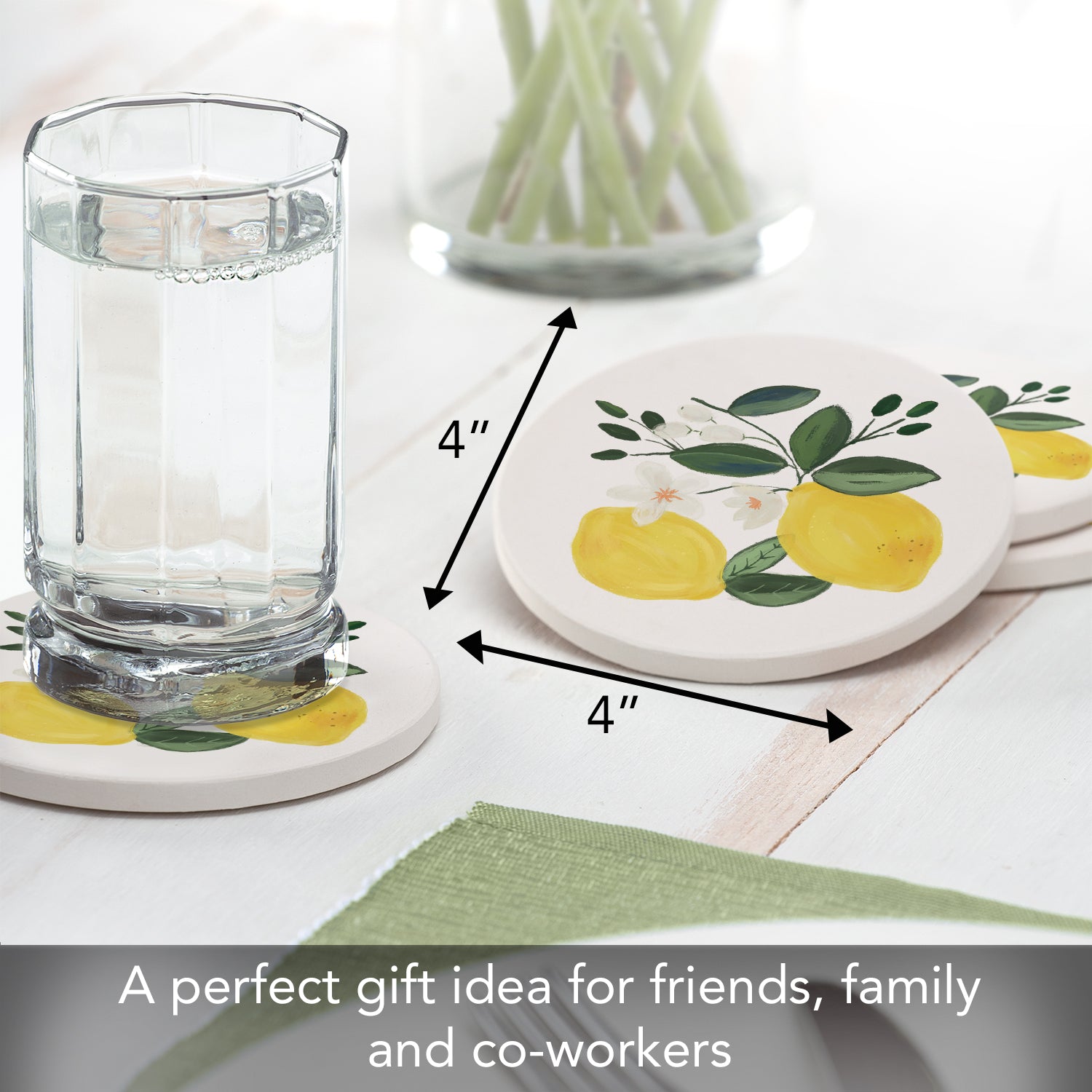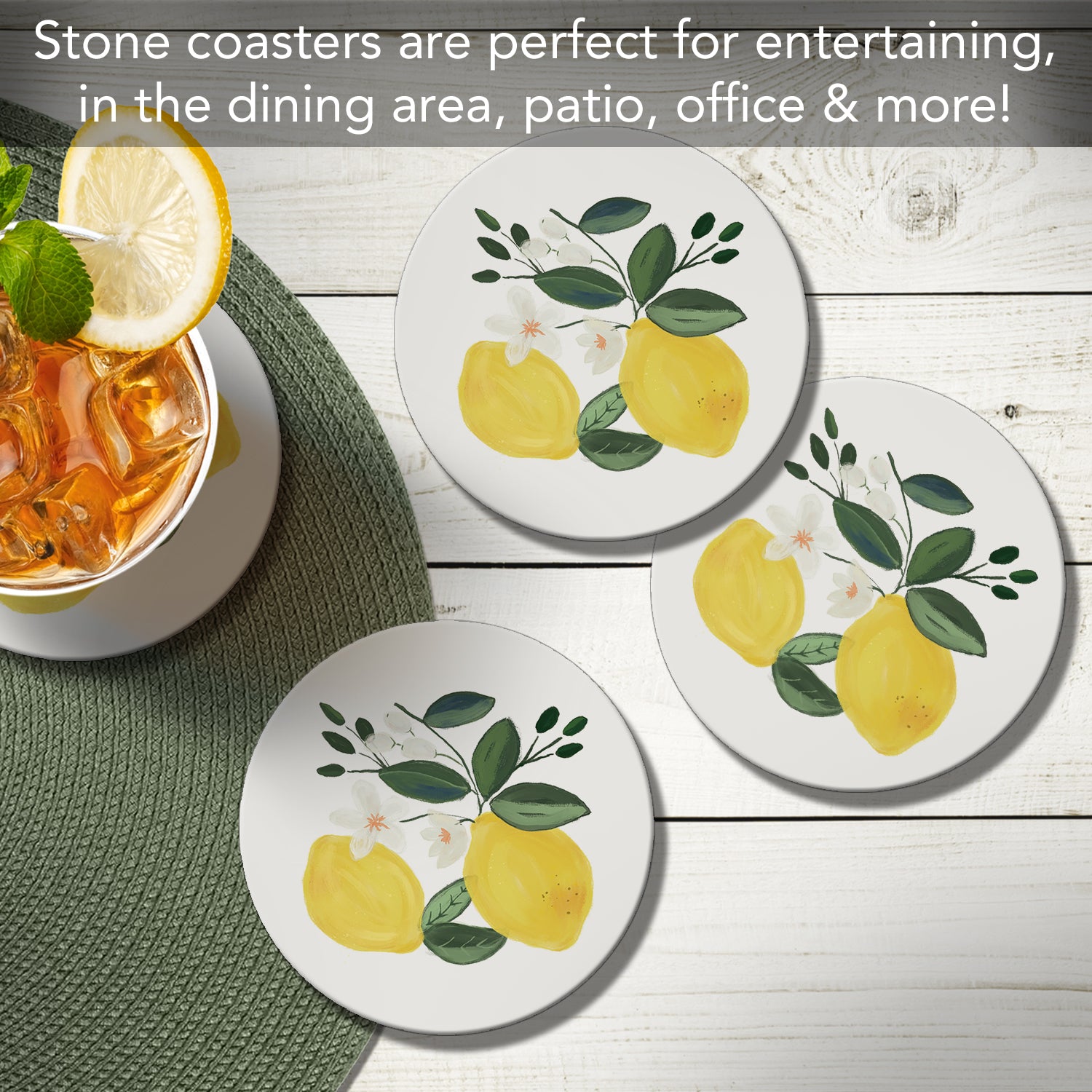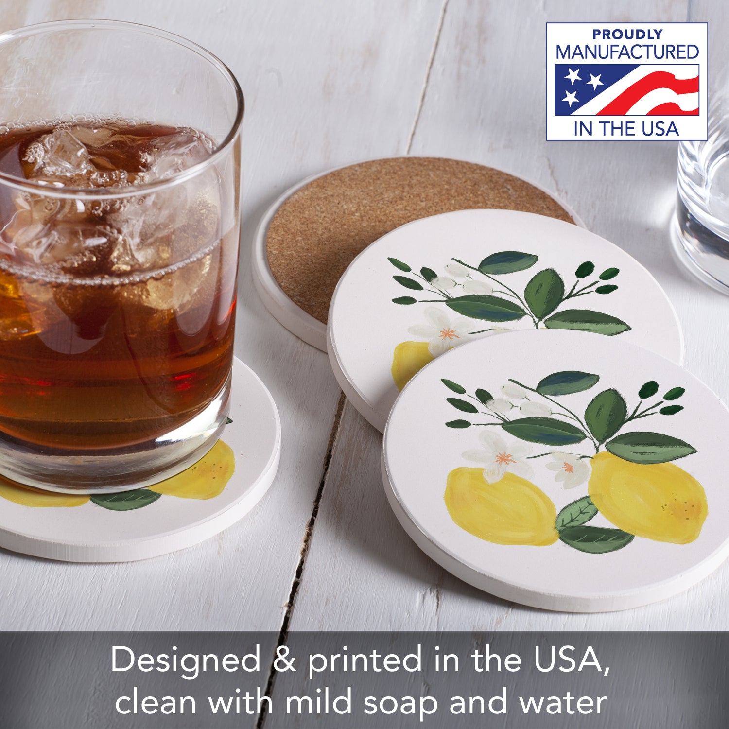 Thirstystone Lemon Blossom 4 Pack Round Absorbent Stone Coasters 4" Diameter Manufactured in the USA