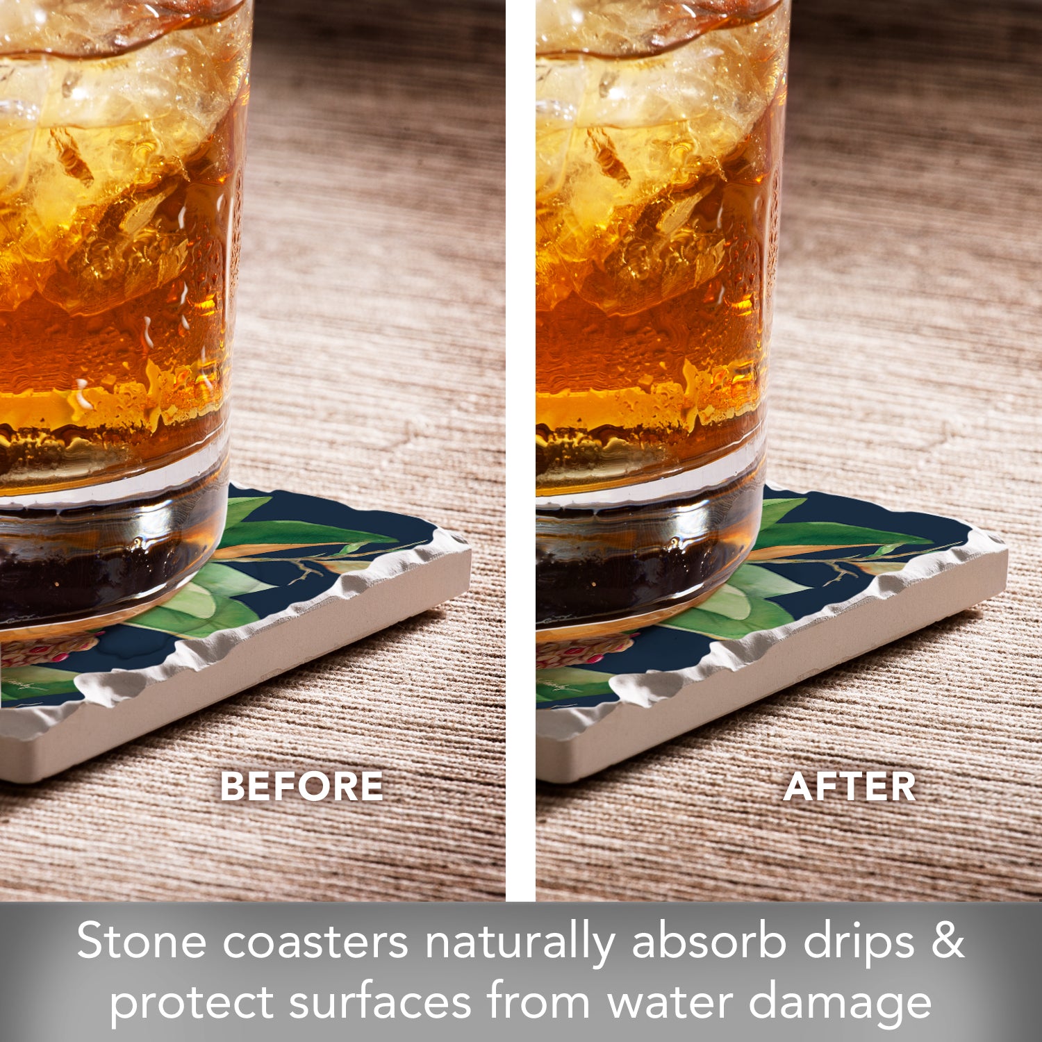 ABSORBENT STONE-Coasters arrive as a set of 4 Coasters. Each Coaster is constructed of absorbent stone that continuously absorbs drips and condensation from your beverages while preventing stains and rings on your furniture.