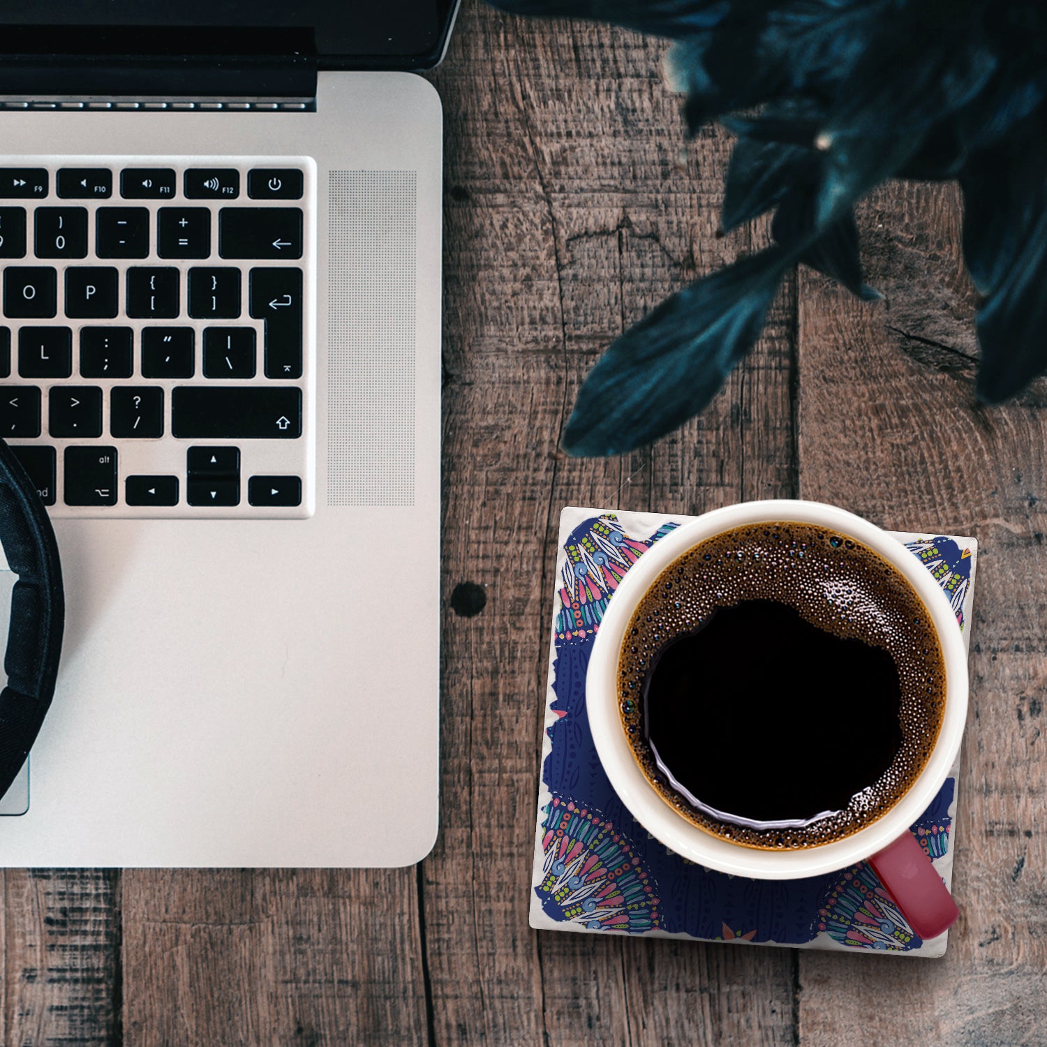 FUNCTIONAL ART-Beautiful artistic design allows the Coaster to remain displayed even when not in use. Each Coaster measures 4” x 4” x .25”. Sized to fit larger Mugs & Glasses.
