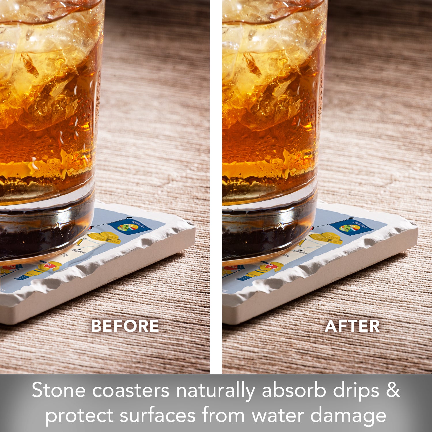 ABSORBENT STONE-Coasters arrive as a set of 4 Coasters. Each Coaster is constructed of absorbent stone that continuously absorbs drips and condensation from your beverages while preventing stains and rings on your furniture.