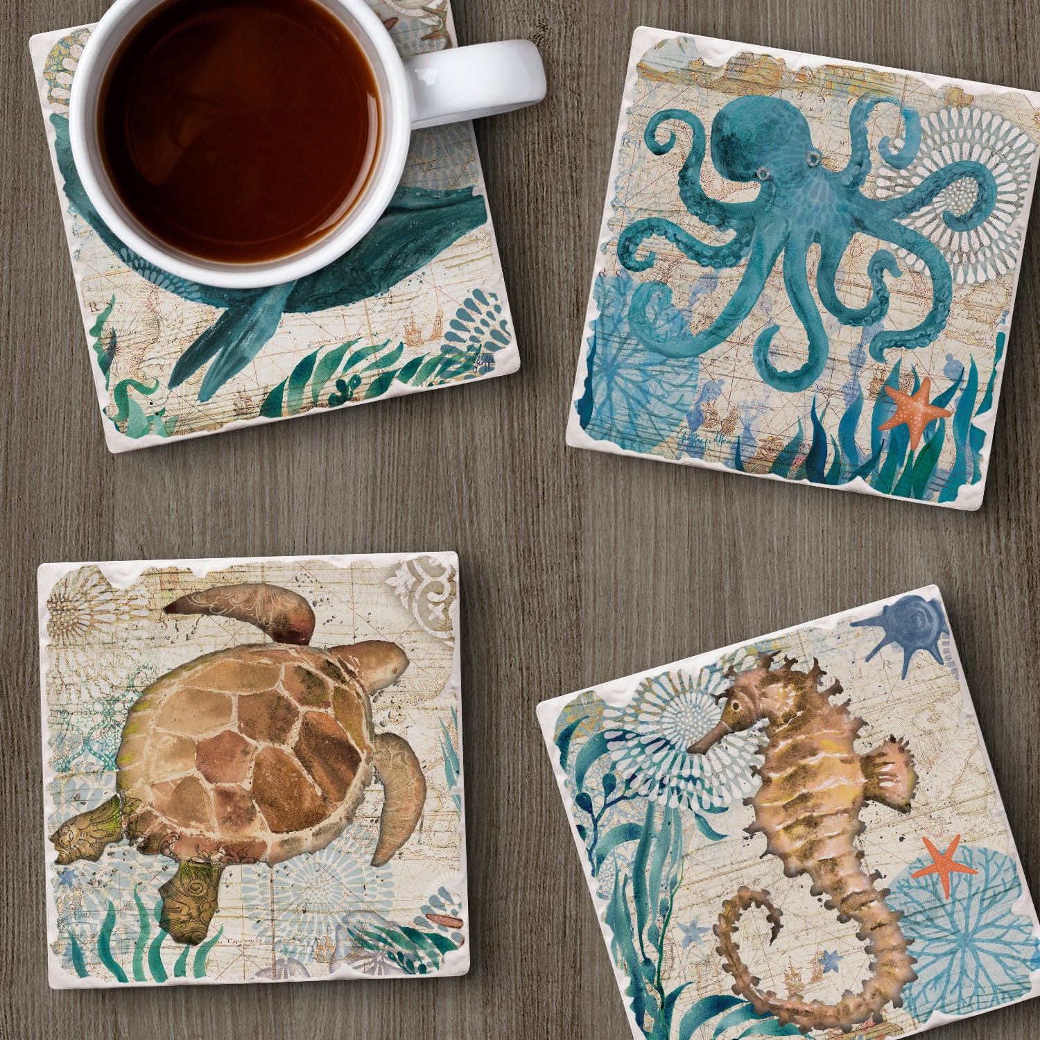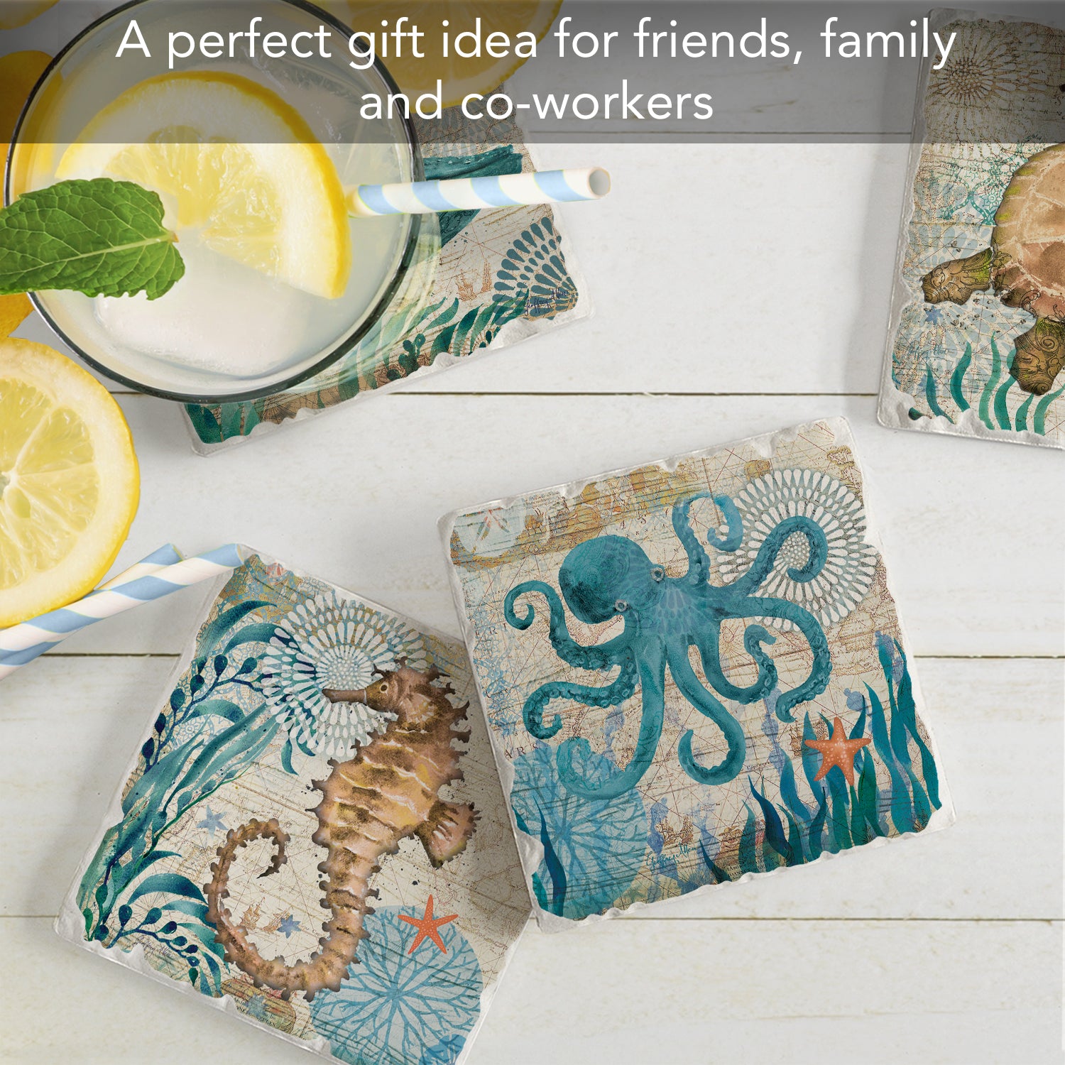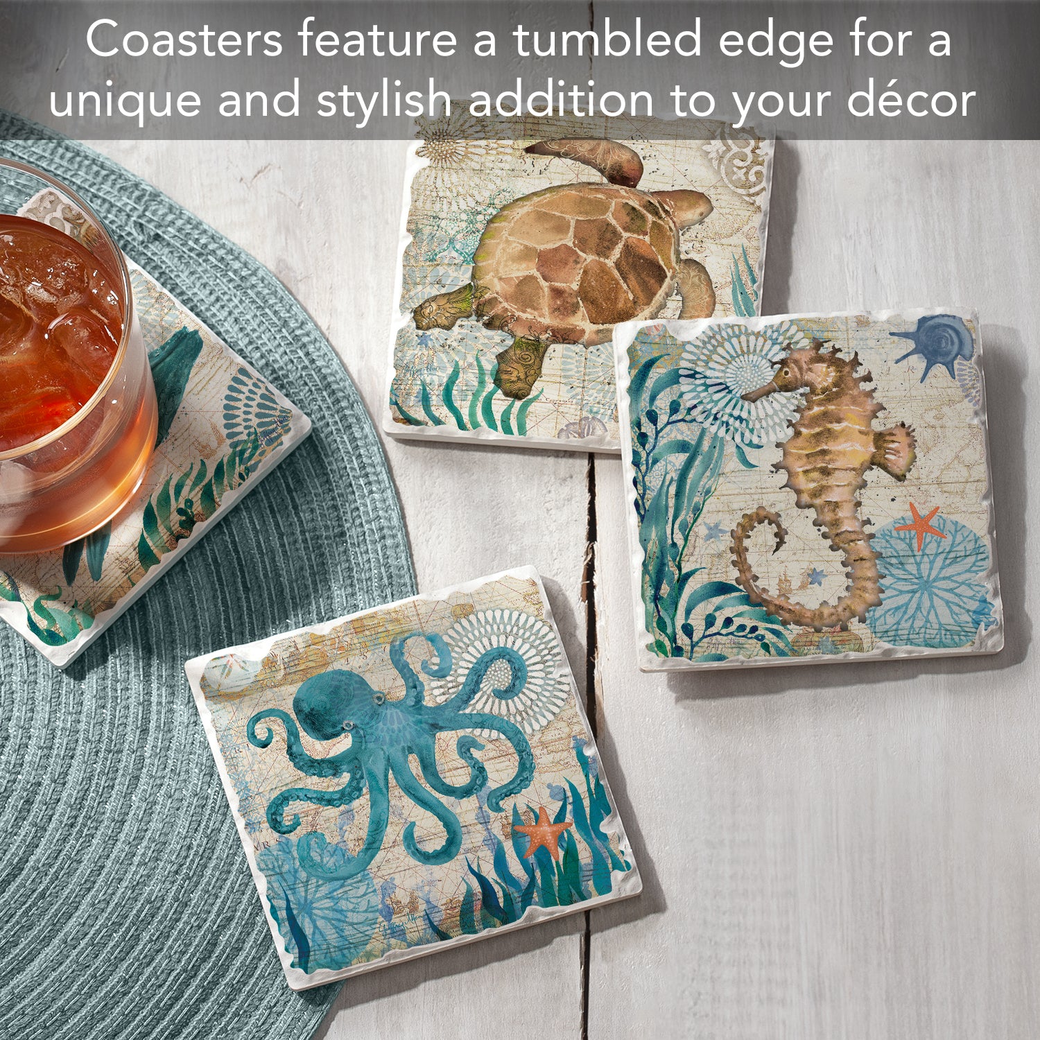 Thirstystone Monterey Bay 4 Pack Assorted Tumbled Tile Stone Coasters 4" Square