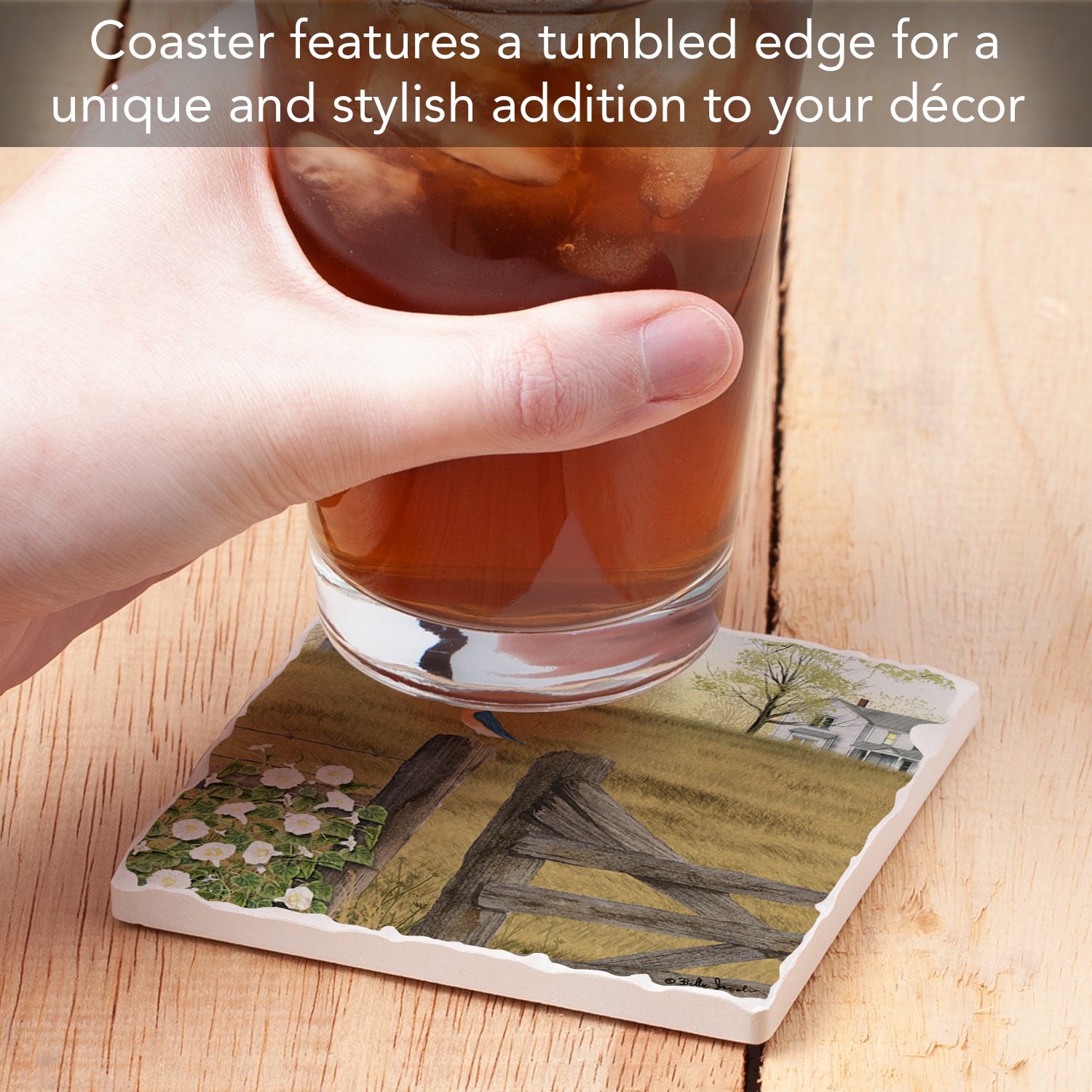 TUMBLED TILE EDGE/CORK BACKING-Coasters feature a Tumbled Tile edge giving the Coaster a classic but rustic appearance. Features a cork backing to protect your furniture, countertop or desktop from scratches and stains.