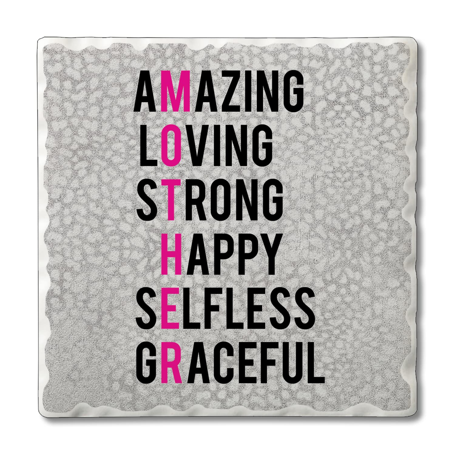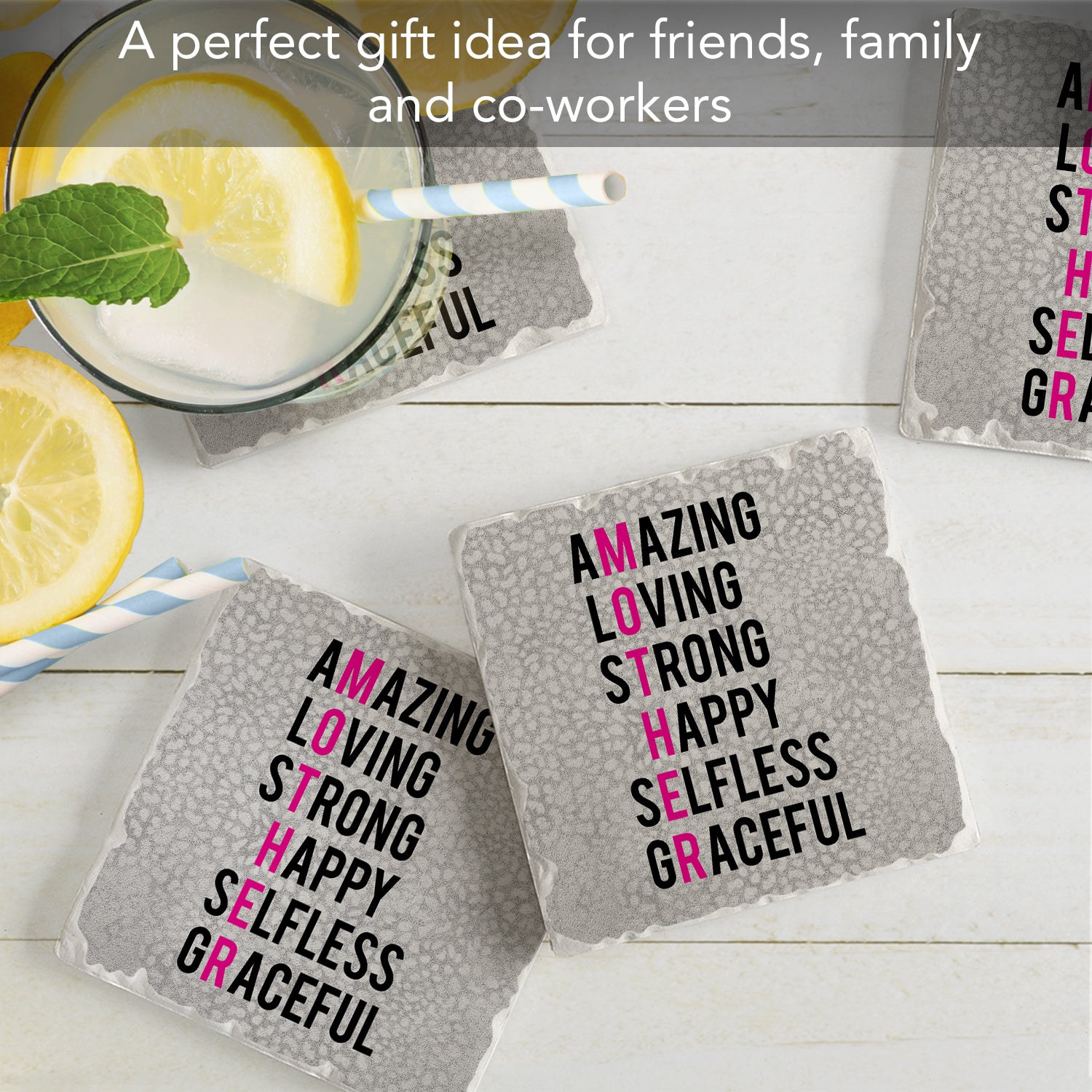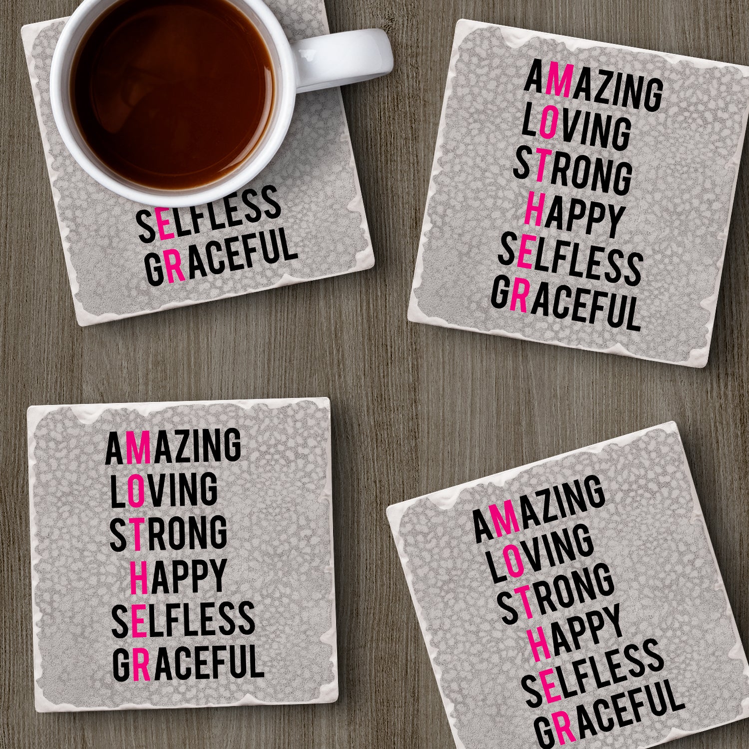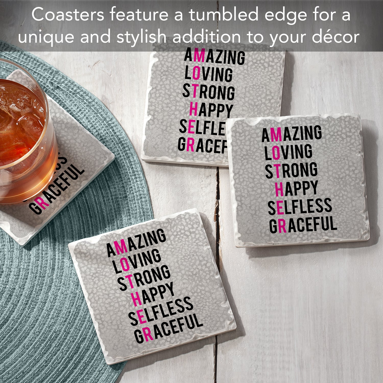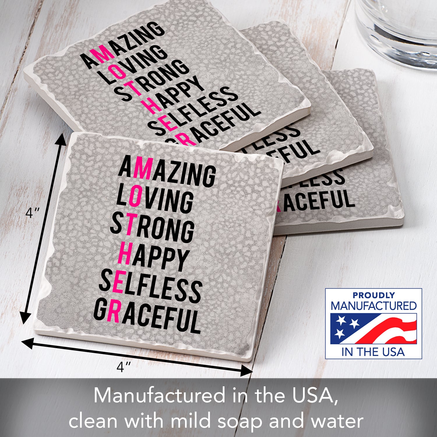 Mother Acronym 4 Pack Tumbled Tile Stone Coasters 4" Square Manufactured in the USA
